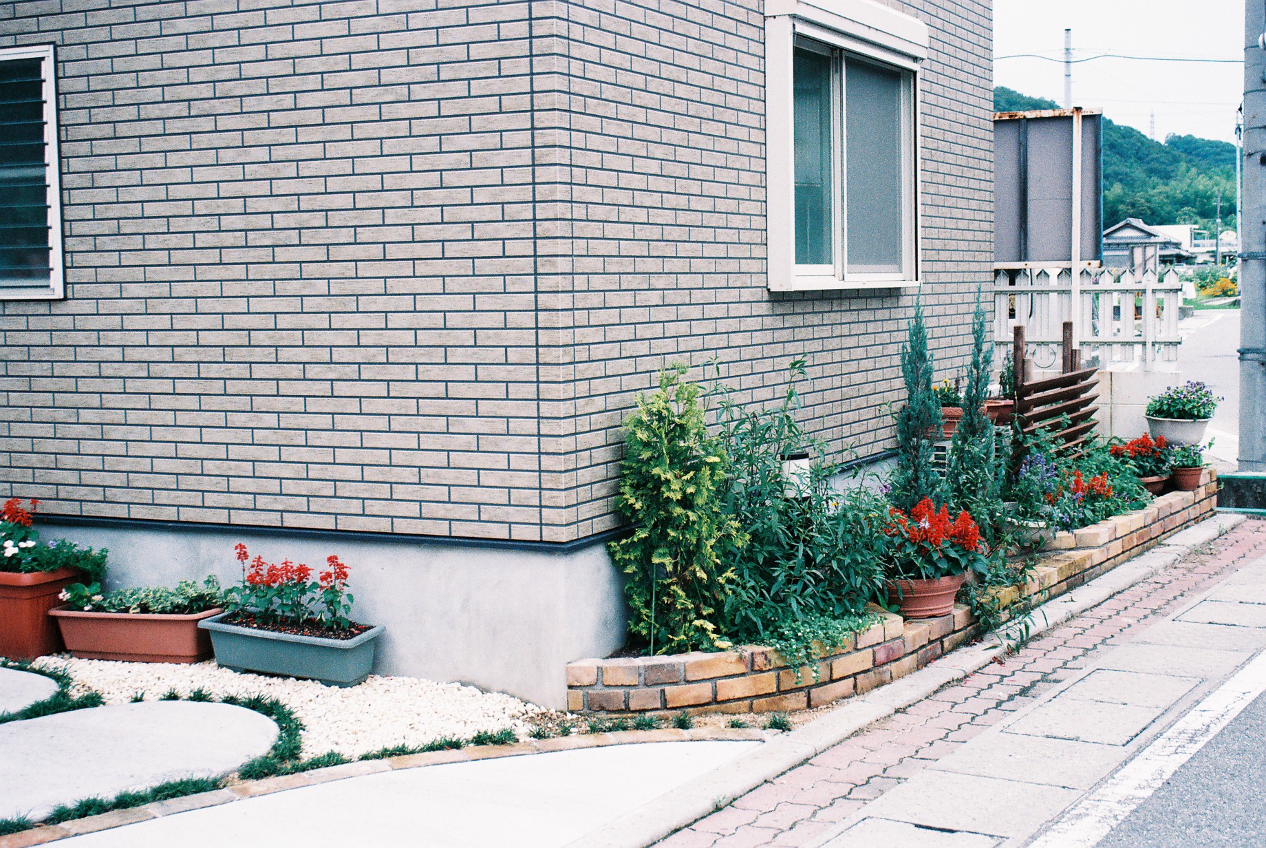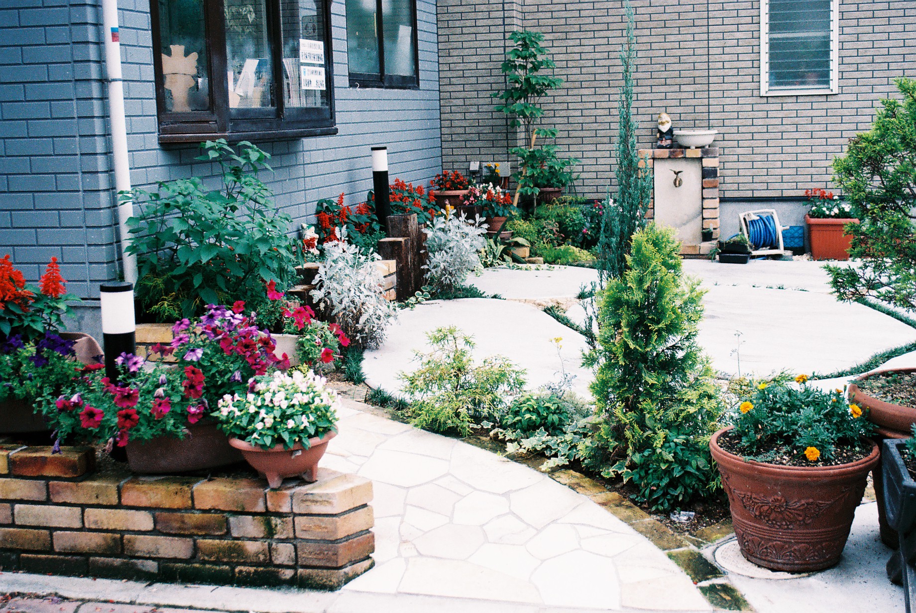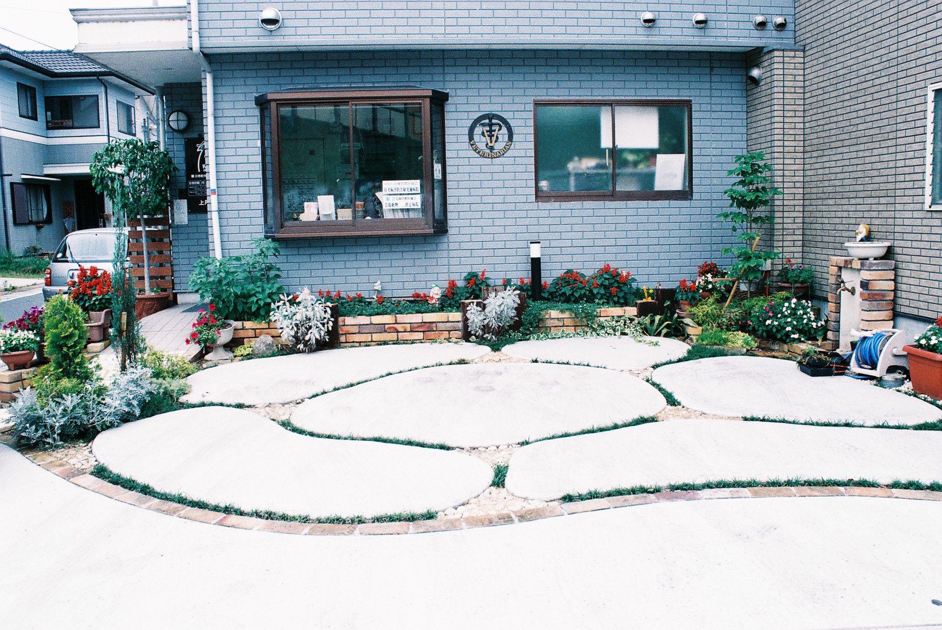 施工実績 オリジナルパーキングデザイン たつの市の動物病院様のパーキングガーデン工事です。アールを多く使った面白いデザインに仕上がりました。土間の合間の植栽たちがグレーのコンクリートを和らげてくれます。 道路面をコニファーガーデンに。 室外機は特製のるルーバーフェンスにて目隠し。