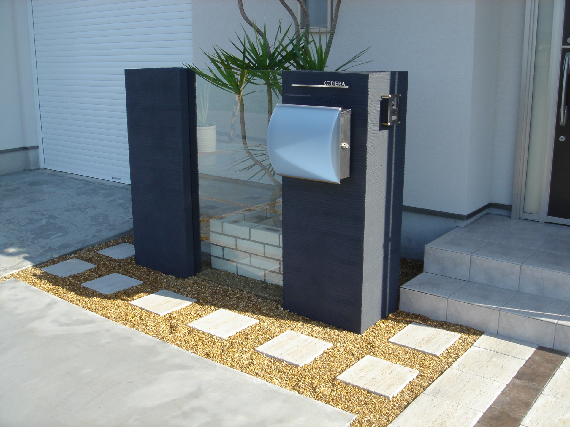 施工実績 ガラスパネルの演出 姫路新築外構 ツートンのシンプルモダンの建物にガラスパネルを使用したエクステリアデザインを御提案いたしました。パネルバックの植栽がグリーンのポイントです。 ステンのポストとガラスパネルとグリーンの組み合わせ。 足元はドライなイメージで英国産砂利をセレクト。 建物と調和したラインを生かしたアプローチデザイン。
