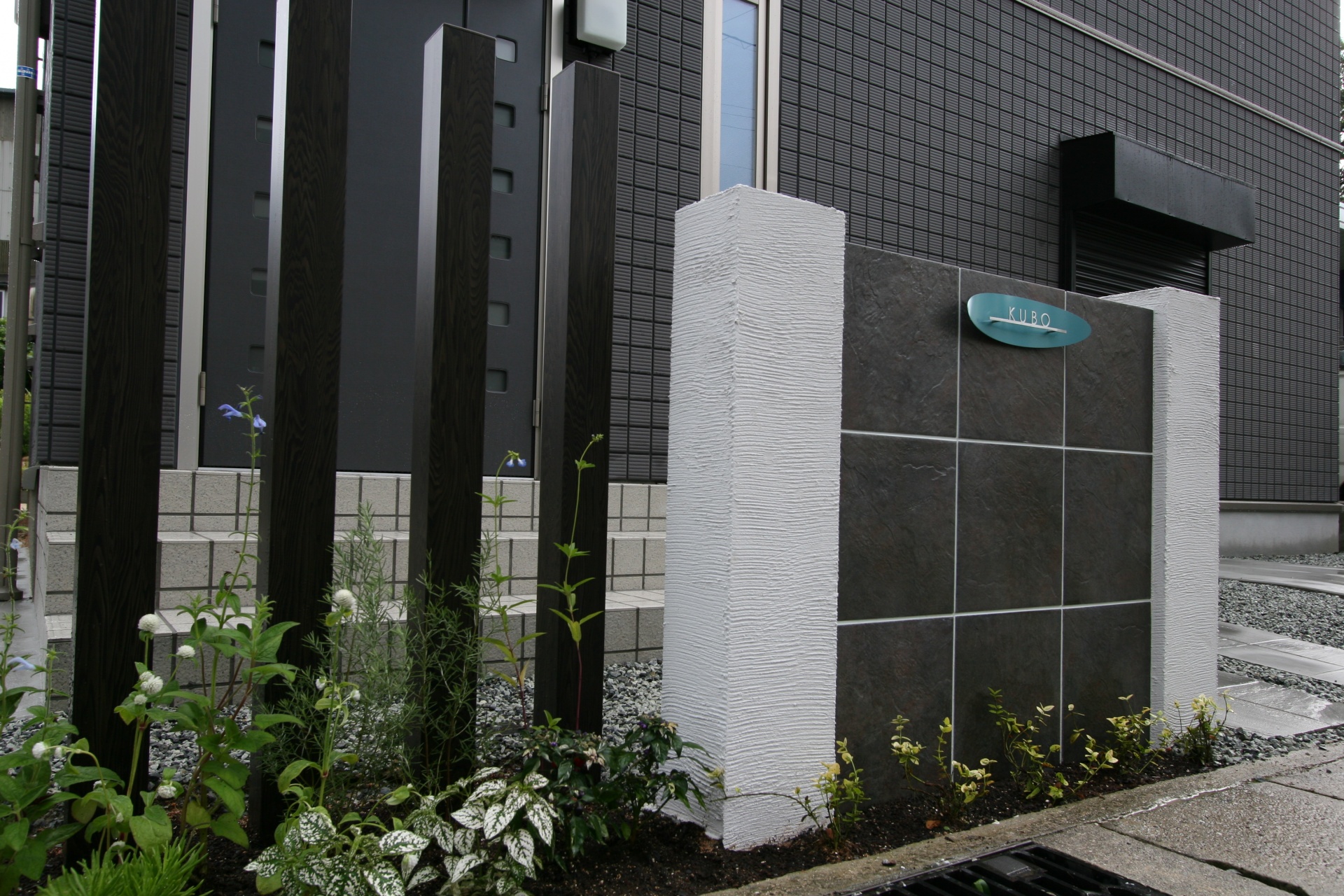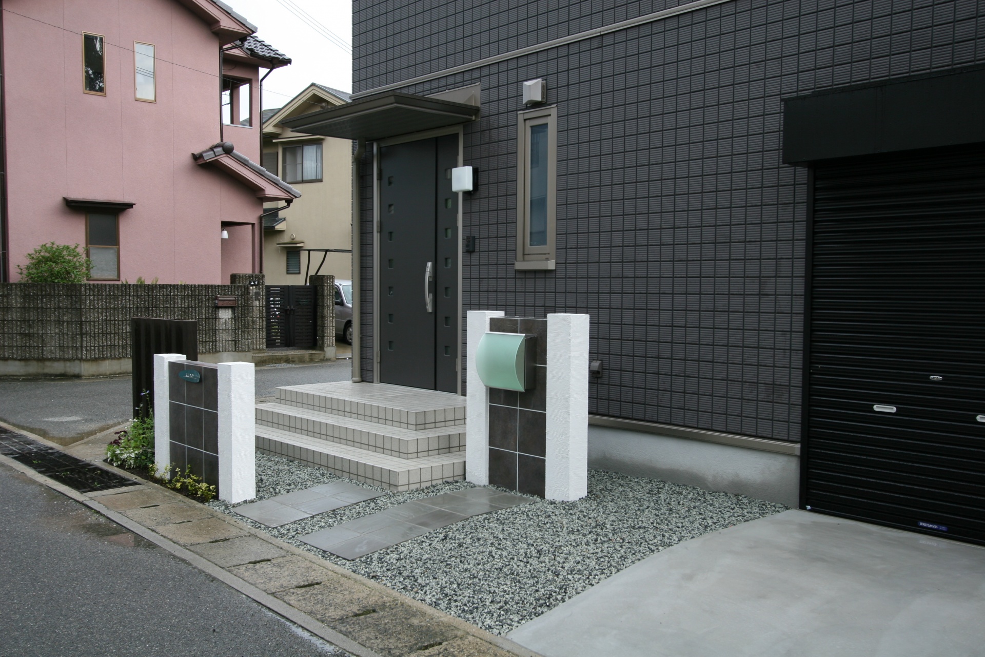 施工実績 ホワイトアンドブラック 姫路新築外構 モノトーンを意識したシンプルモダンエクステリアです。タカショーアートウッドの木調柱が門周りのポイントになっています。 タカショーアートウッド角柱のポイントデザイン。 ドイツポストで個性を演出。 ダークな300角タイルが建物との調和をはかります。
