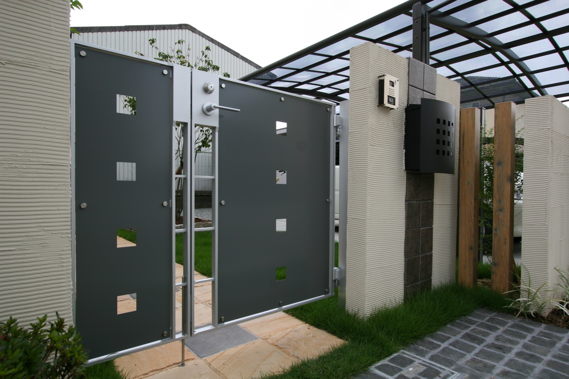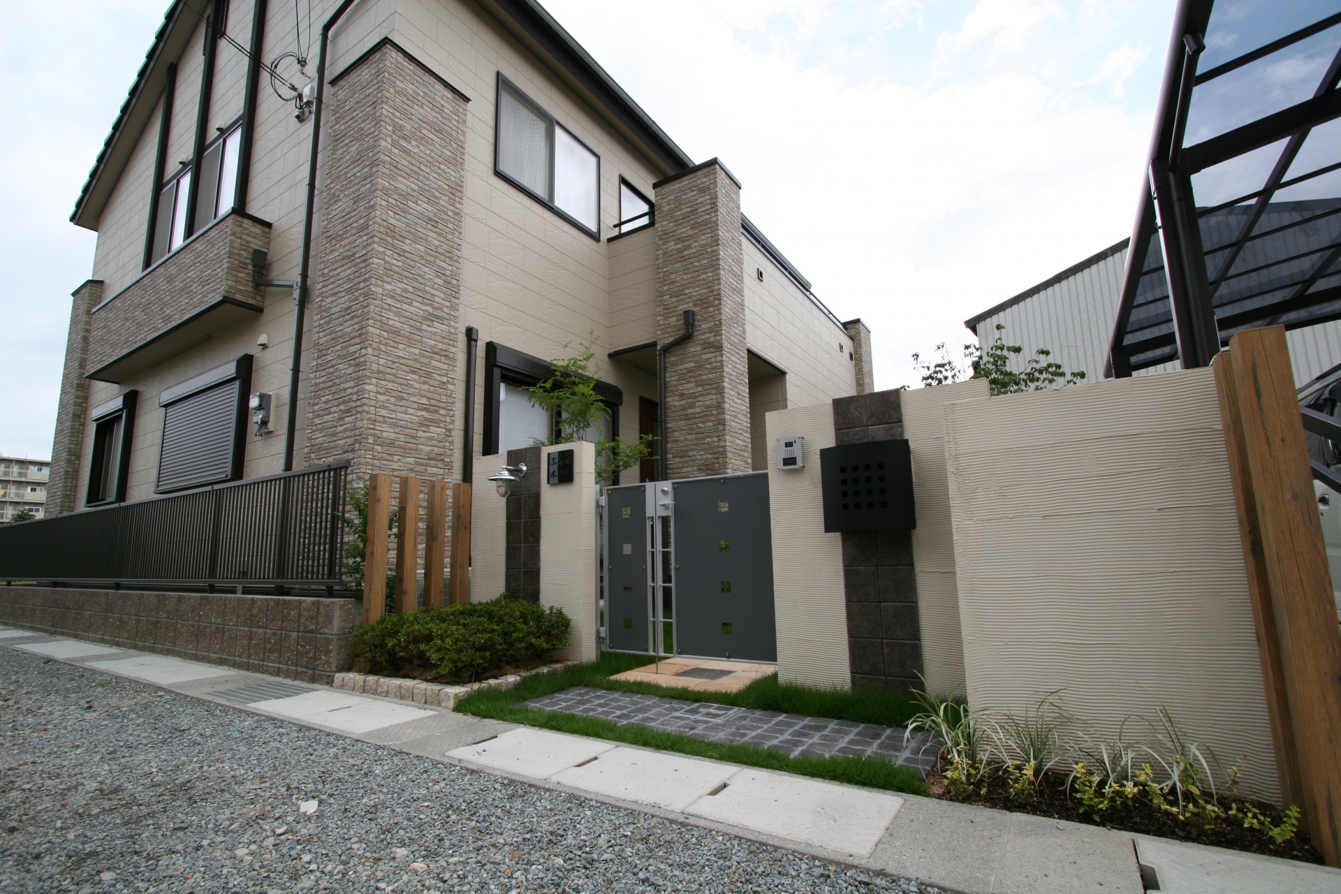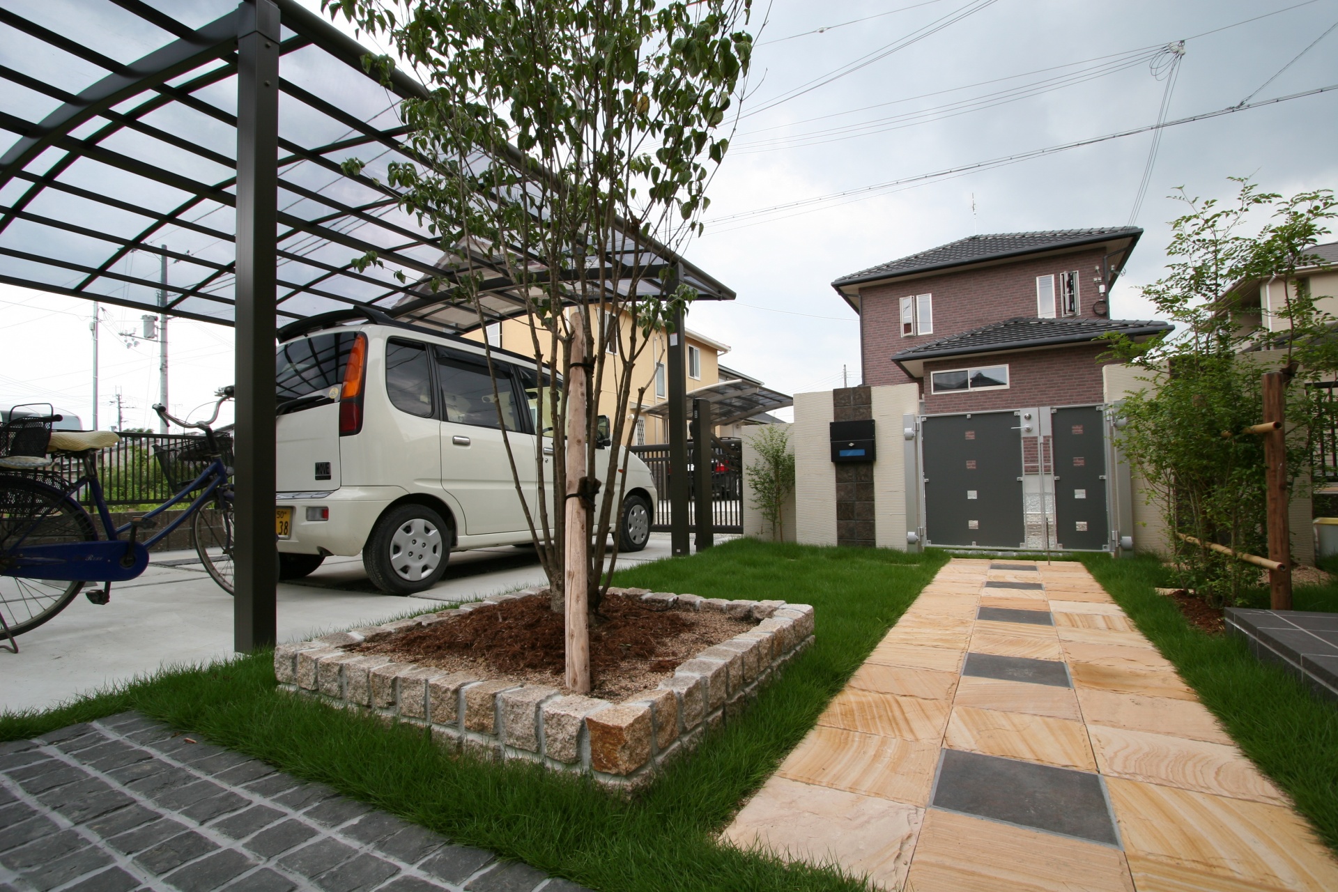 施工実績 砂岩アプローチデザインエクステリア 姫路新築外構 砂岩のアプローチでグリーンとのコントラストを意識した姫路外構デザインです。 ブラックのドイツポストがポイントです。 グリーンと砂岩平板の組み合わせ。