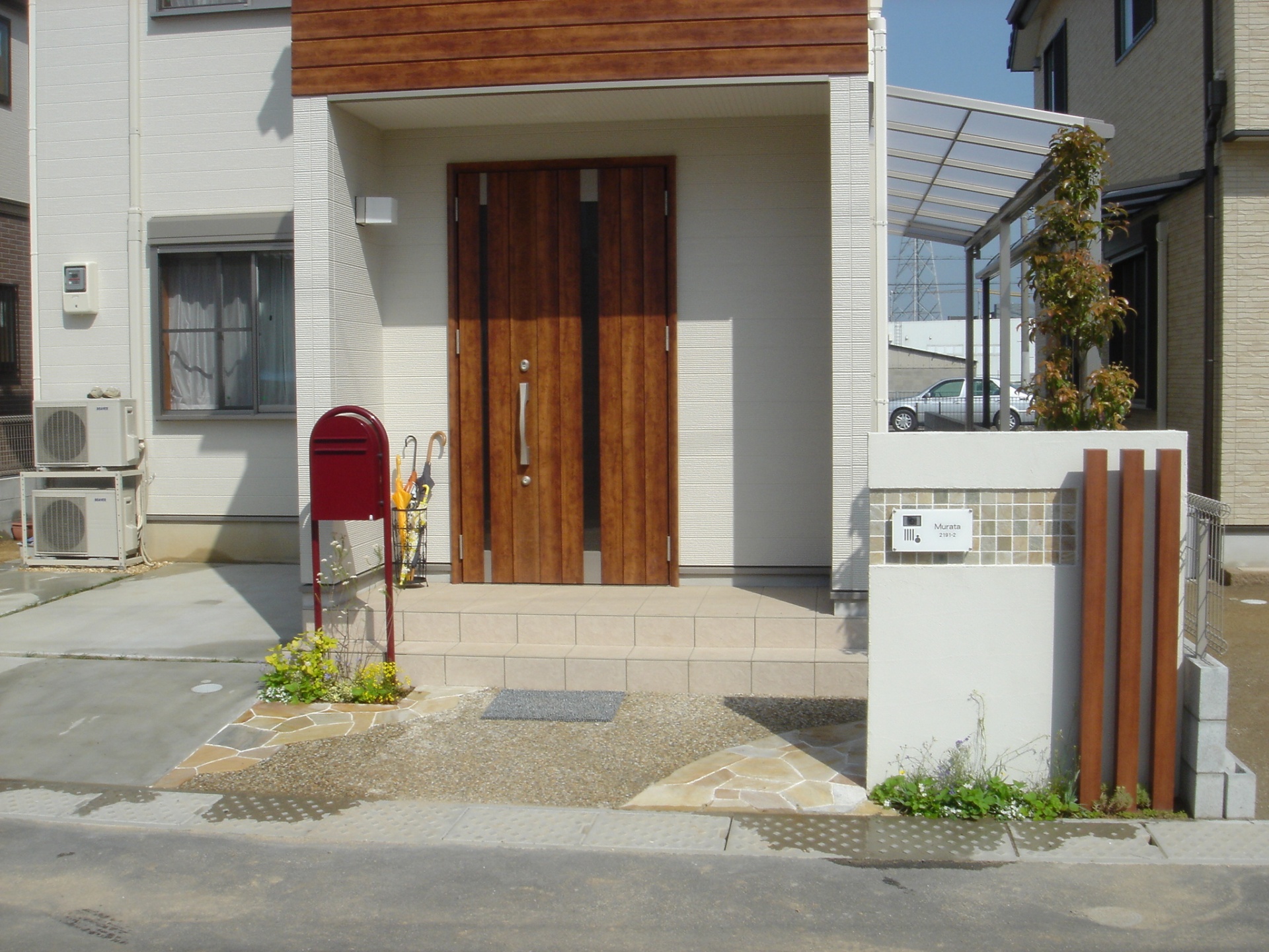 施工実績 ボルドーボビポスト ウッドデザイン 加古川新築外構 加古川エクステリアデザイン施工例。ボルドーのボビポストがポイントの加古川新築外構。ウッドのスリットサイドデザインが自然石をポイントにした門柱デザインによく似合います。 ホワイト門柱に自然石をポイントにしたオリジナル門柱デザイン。 ボンボビのボルドー色ポスト。 門周り全景。