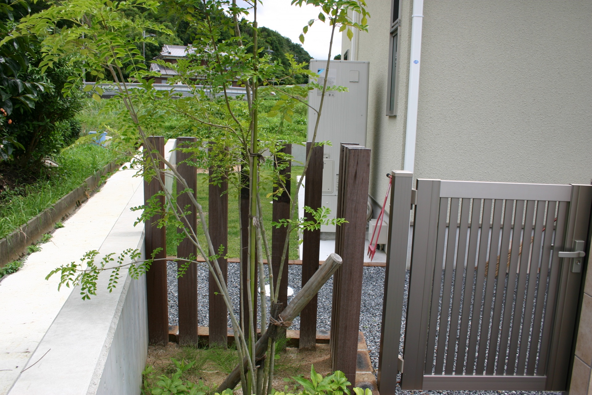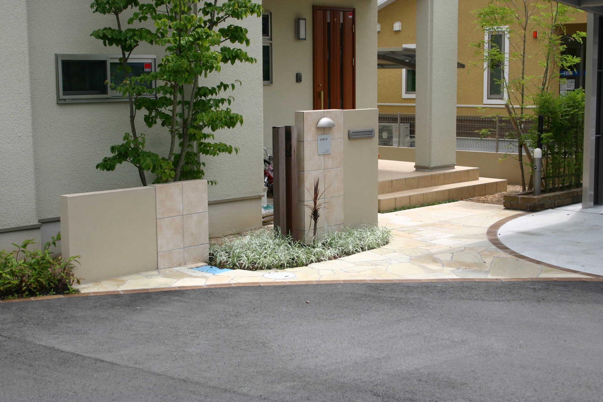 施工実績 タイルポイント門柱のベーシックデザイン 加西市新築外構 加西市エクステリア施工例。タイルデザインで大人のイメージで外構デザインしました。べージュの落ち着いた色合いと自然石調タイルのカラーバランスが特徴です。 ウリンの木製フェンスをサイドにポイントデザインした門周り外構。 シマトネリコのバックに木製のウリンフェンスをセレクト。 門周り全景。