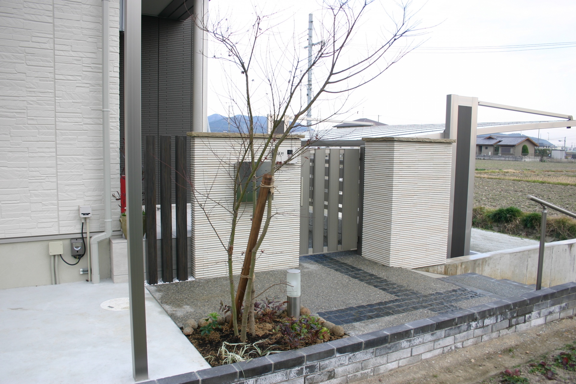 施工実績 四国化成マイポート施工例 加古川新築外構 水平ラインの自然石を門柱アクセントにエクステリアデザインとして用いた加古川外構デザイン。サイドの木製ウッドスリットがシンプルな大人のエクステリアを演出します。 ホワイトを基調にしたエクステリア門周り。落葉樹が四季の移り変わりを演出してくれます。 四国化成マイポート施工例。前足の無いスムーズなパーキングが実現しました。 四国化成 マイポート全景。