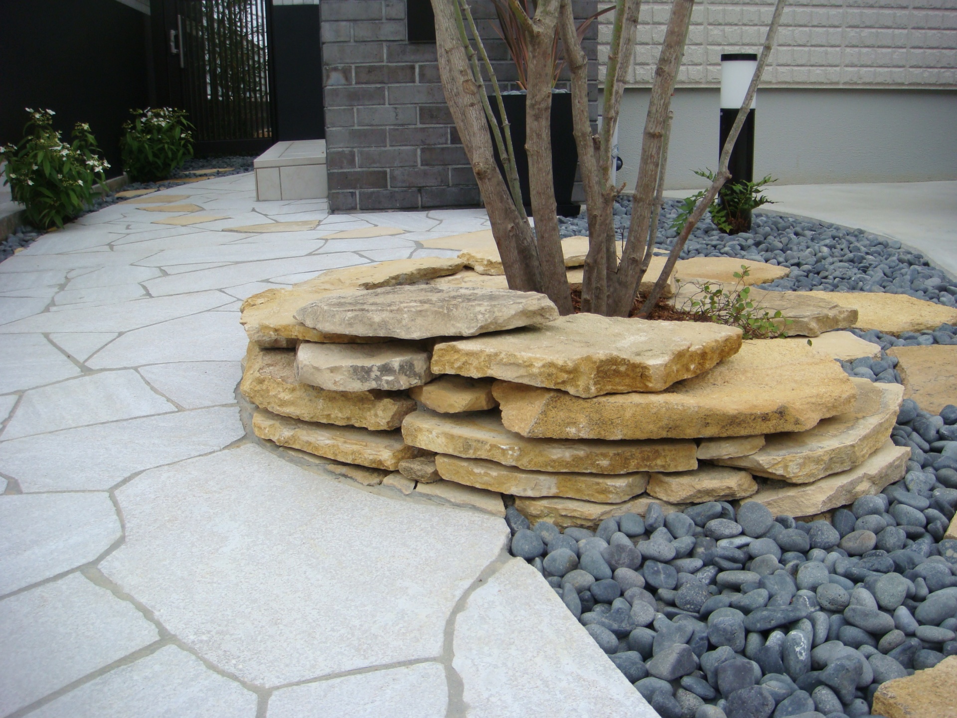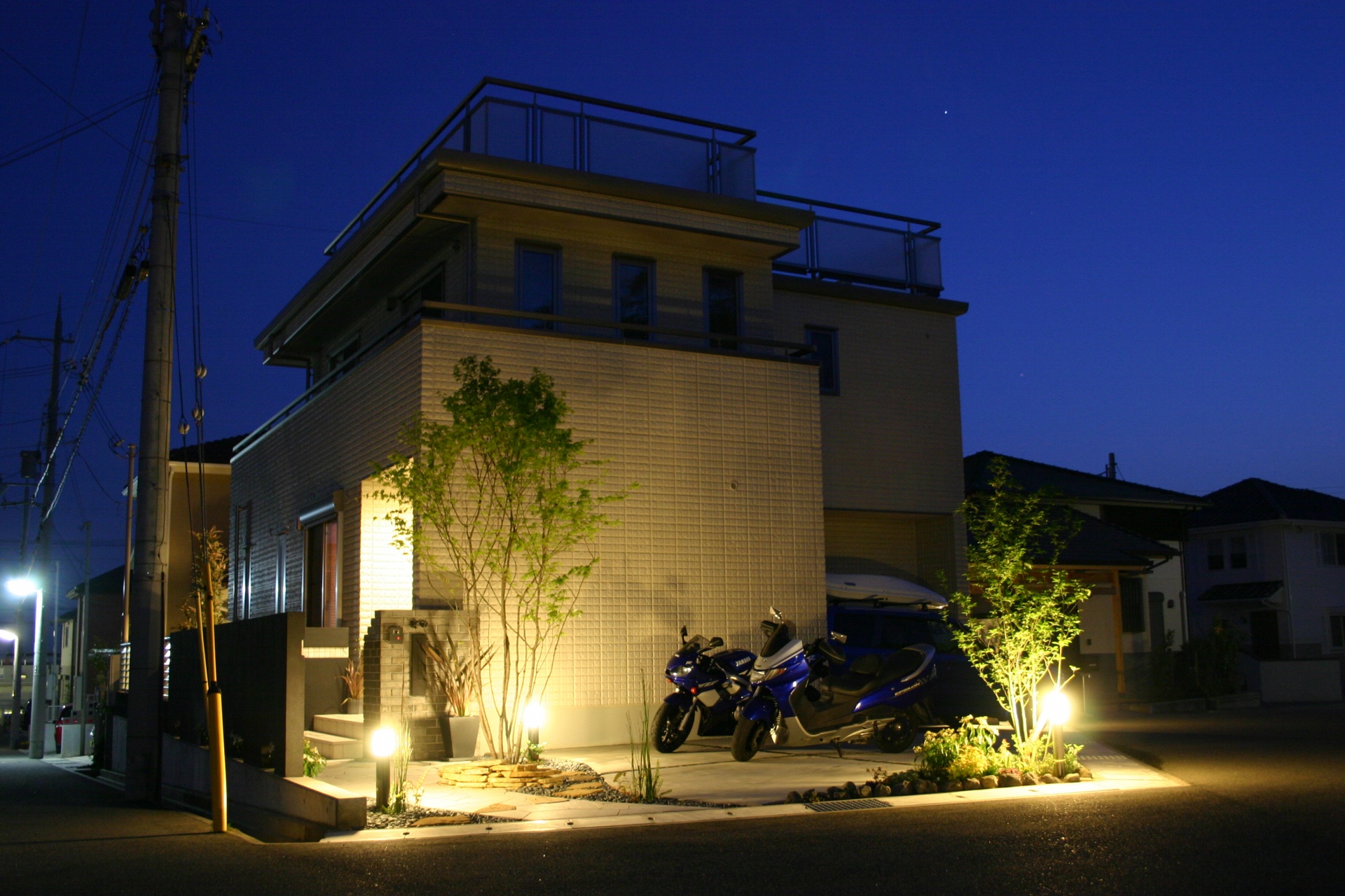 施工実績 グリーンのエクステリアデザイン 神戸市新築外構 神戸市エクステリア施工例。グリーンをポイントにデザインした。シンプルかつナチュラルなエクステリアデザイン。自然石の乱形自然石がお客様のお宅を上品に演出してくれます。 ライム自然石コバ積みのオリジナル花壇で植栽の足元をデザイン。 ポリカのパネルフェンスで光を生かした境界デザイン。 夜の演出。ライトアップエクステリア。