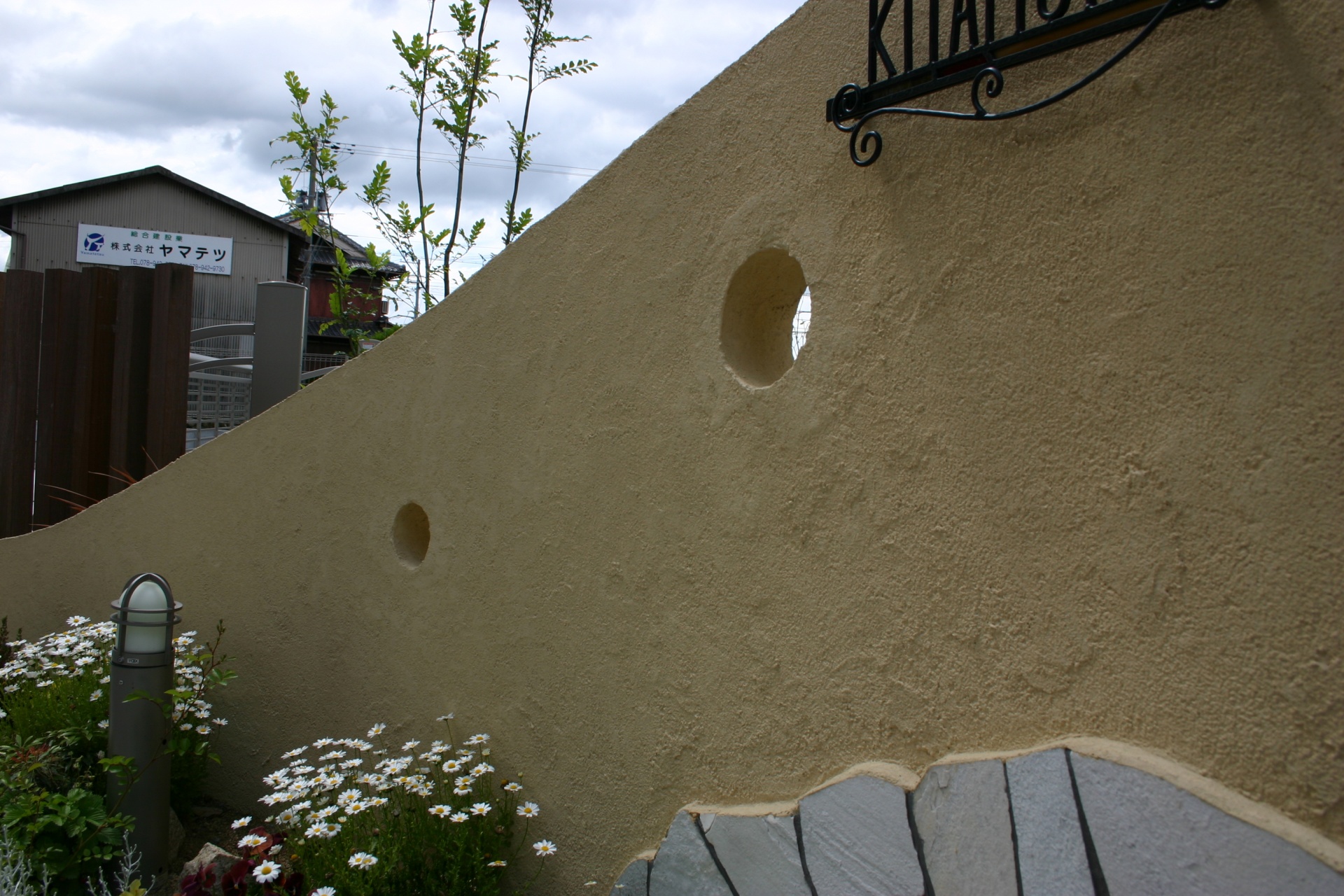 施工実績 ナチュラルカーブデザイン門柱デザイン 播磨町新築外構 ナチュラルカーブが特徴の加古郡播磨町のエクステリアデザイン施工例。ウリンのウッドスリットが角度によるエクステリアデザインをナチュラルにデザインします。ホワイトクオーツの幅木デザインがポイントです。 大胆なカーブのエクステリア門柱デザイン。 丸窓のポイントスリット加工。 門周り全景。