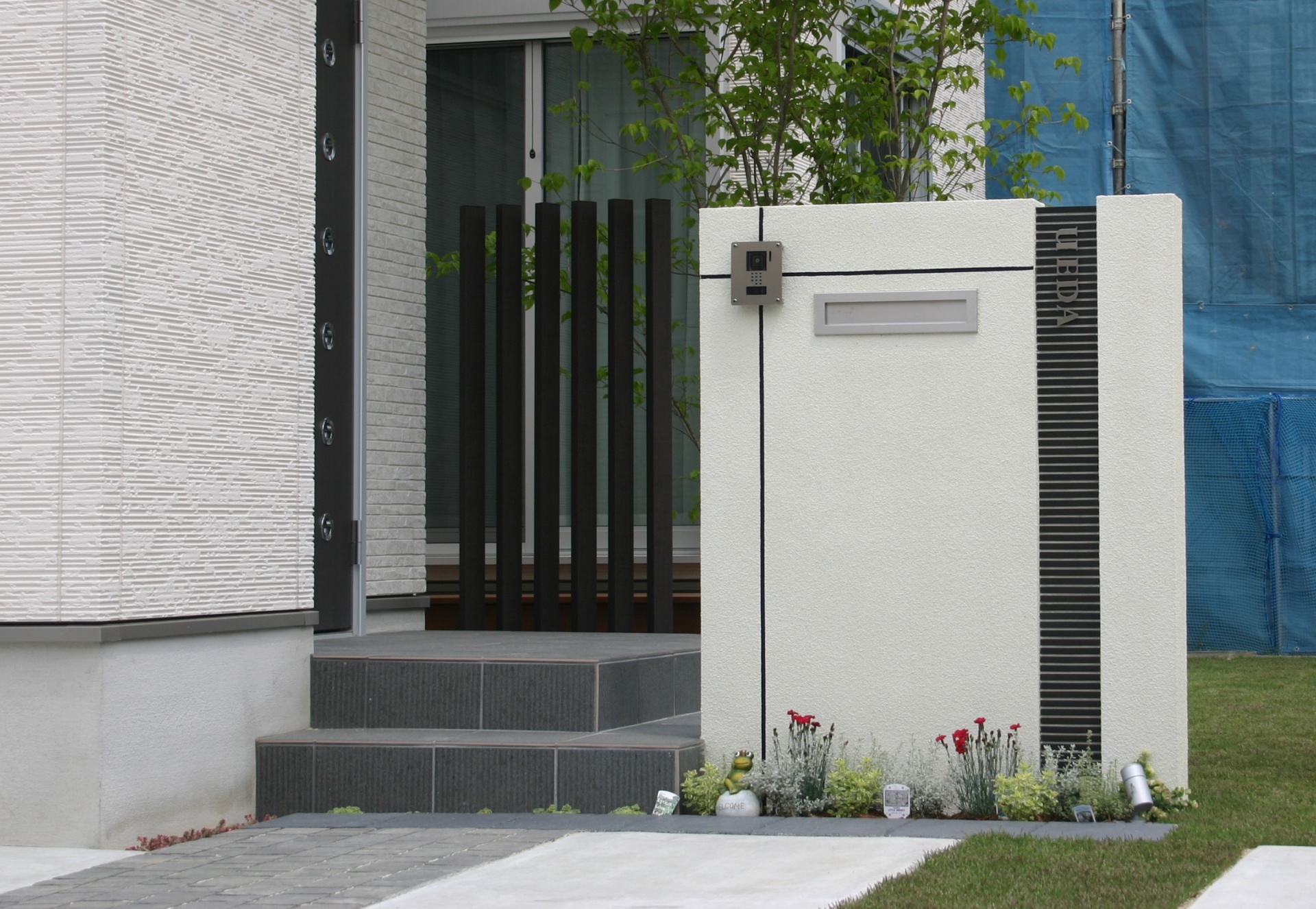 高砂市新築外構 ウッドパーツを玄関扉とリンクしたモダンエクステリア