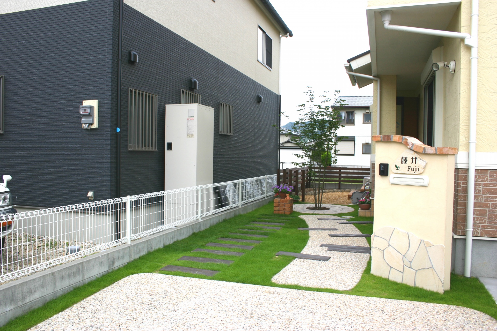 洗い出しアプローチにコンクリート製枕木を入れてアクセントとしています。 芝生の中にサブアプローチの枕木も綺麗です。