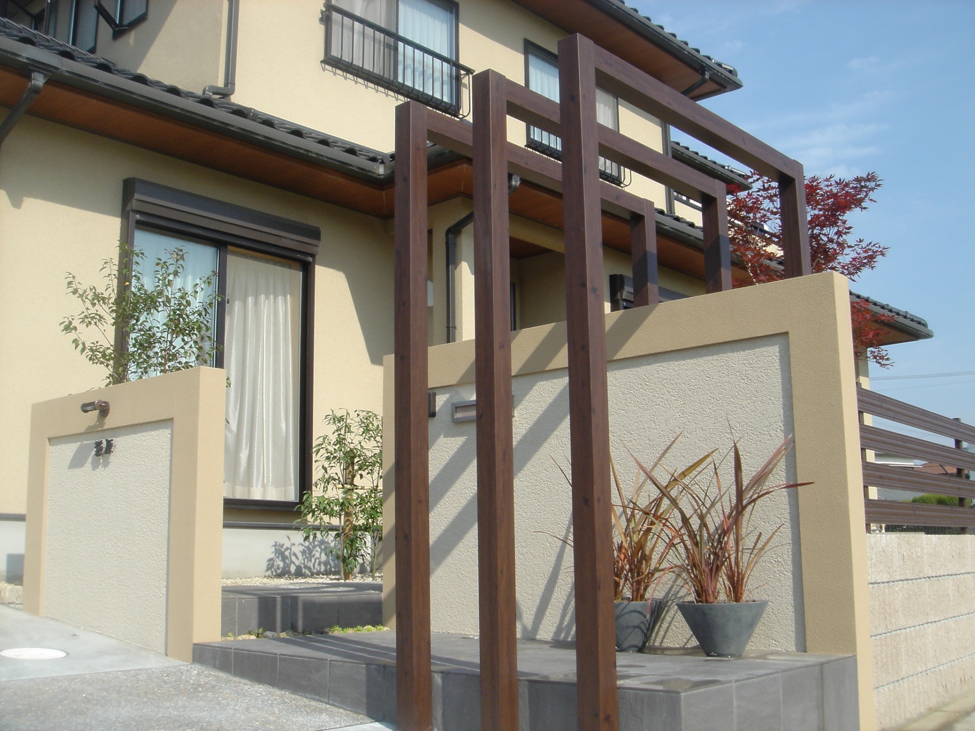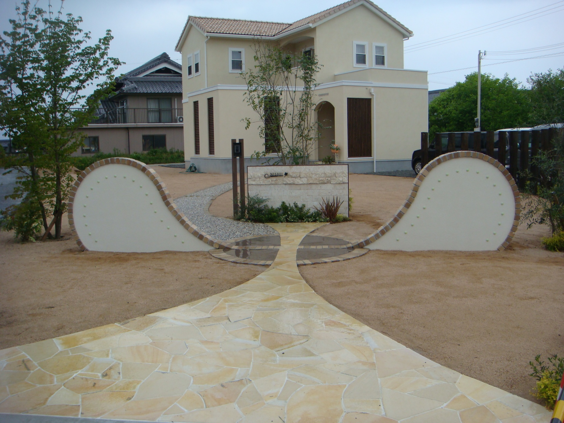 施工実績 デザイン門柱に続く豪華な石張りアプローチ インナーテラスに使用されている同等の石を使いアプローチを作りました。 イエロー系の石に白目地。豪華さの中に柔らかさを感じます。 全体の完成写真はこちらです