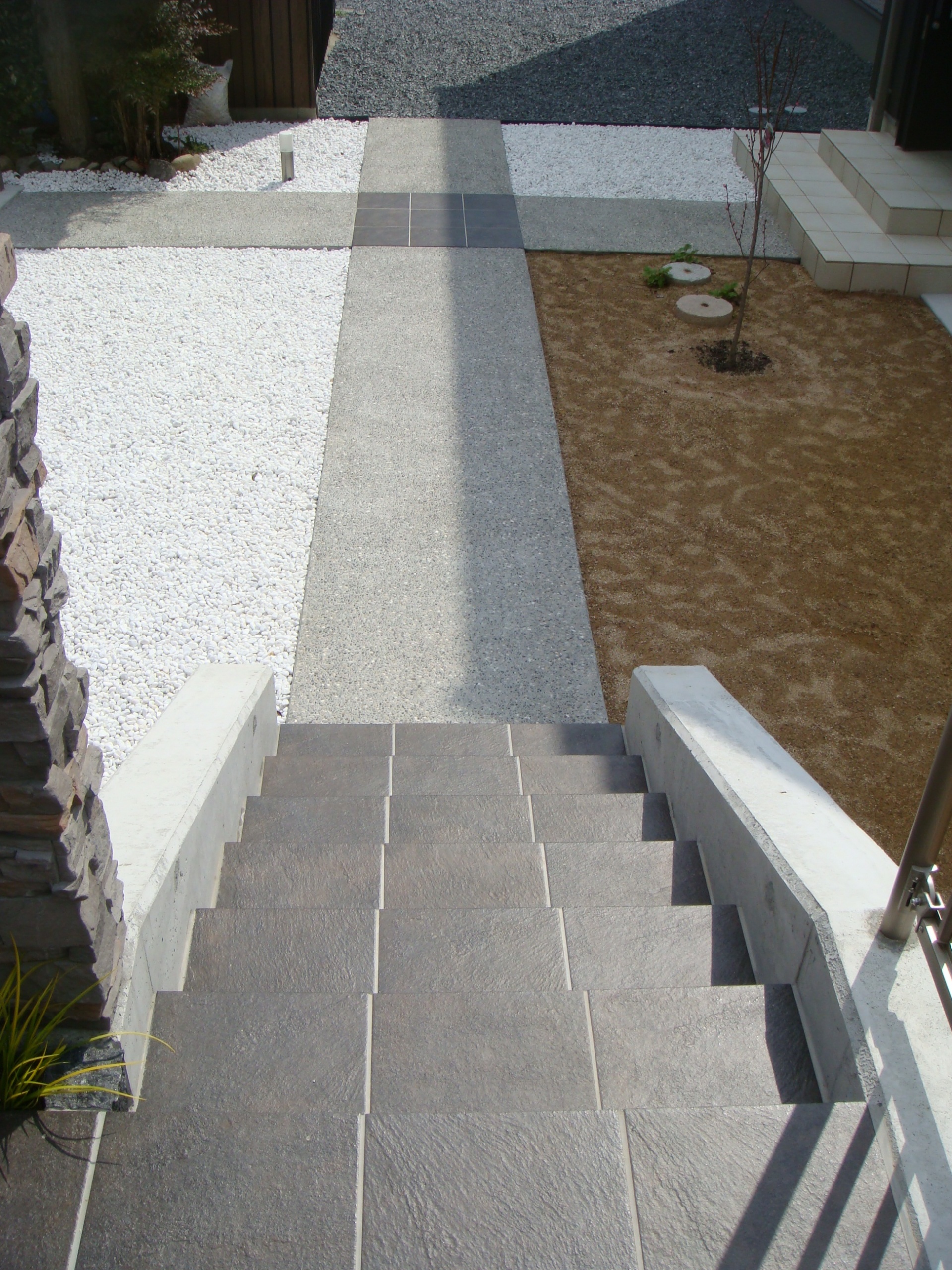 擁壁で土留めを施しその間のステップにタイルを使用しています。 シンプルなイメージにぴったりの黒がアクセントになっています。