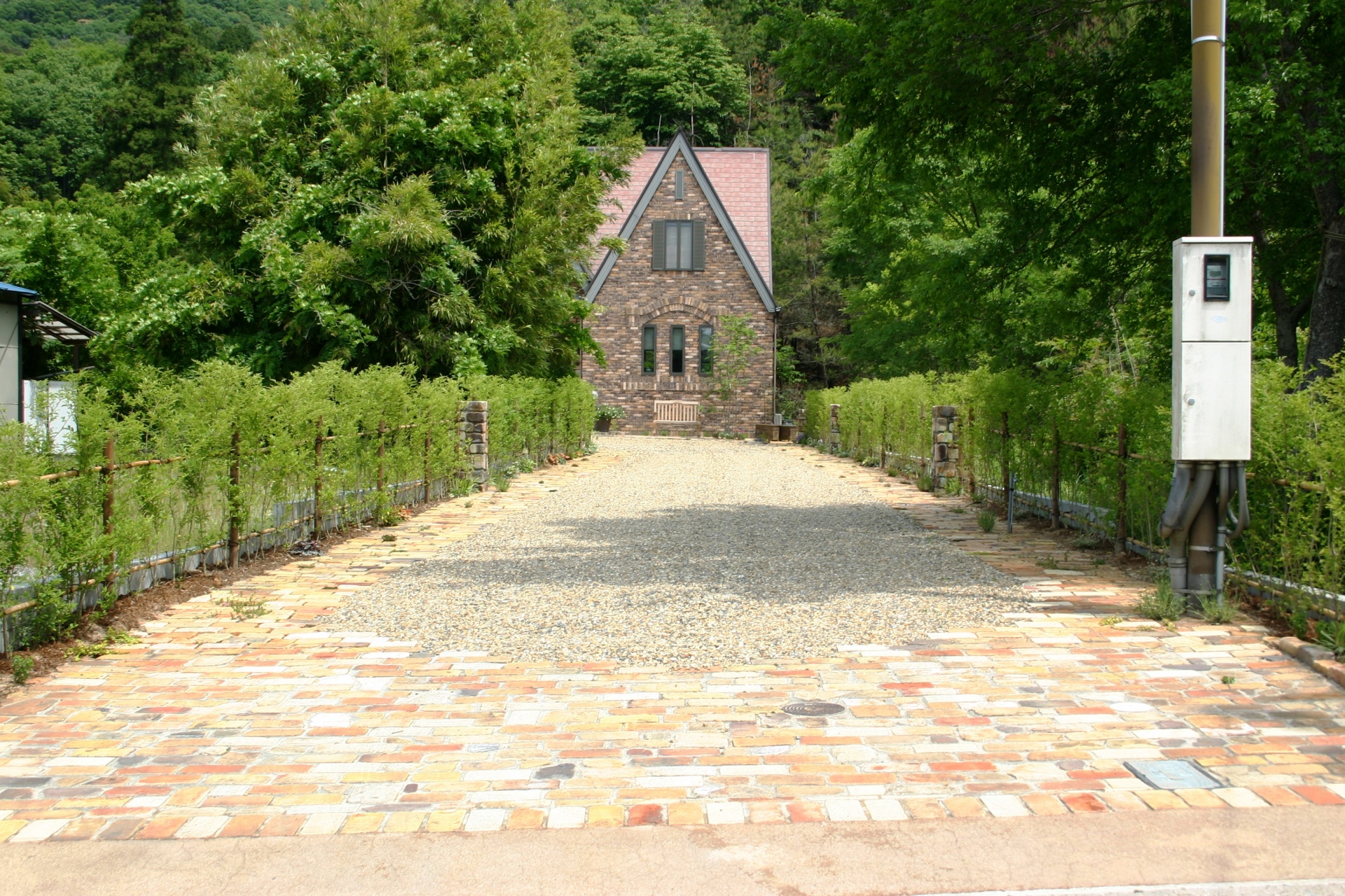 山の緑が借景となり三角屋根の建物が引き立ちます。 そんな自然に囲まれた雰囲気に合わせたナチュラルなレンガアプローチです。