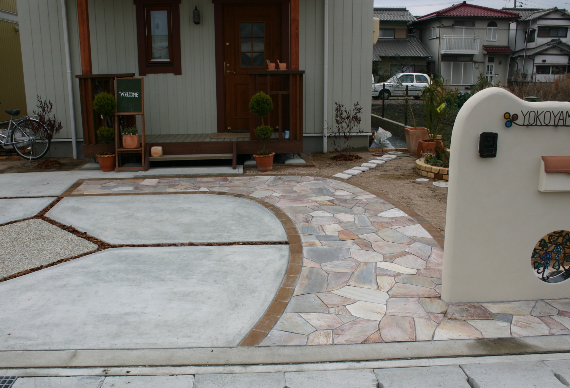 施工実績 輸入住宅に合うピンク系自然石アプローチ 輸入住宅に似合う可愛いイメージで全体をコーディネートしました。 アプローチにはピンク系の乱形石を使い、柔らかさを表現しています。 全体の完成写真はこちらです