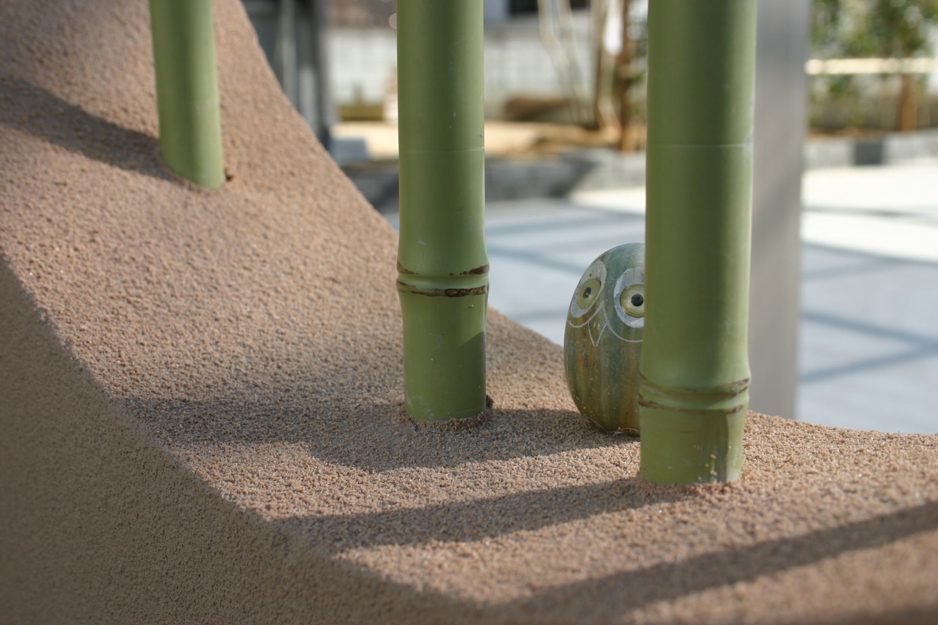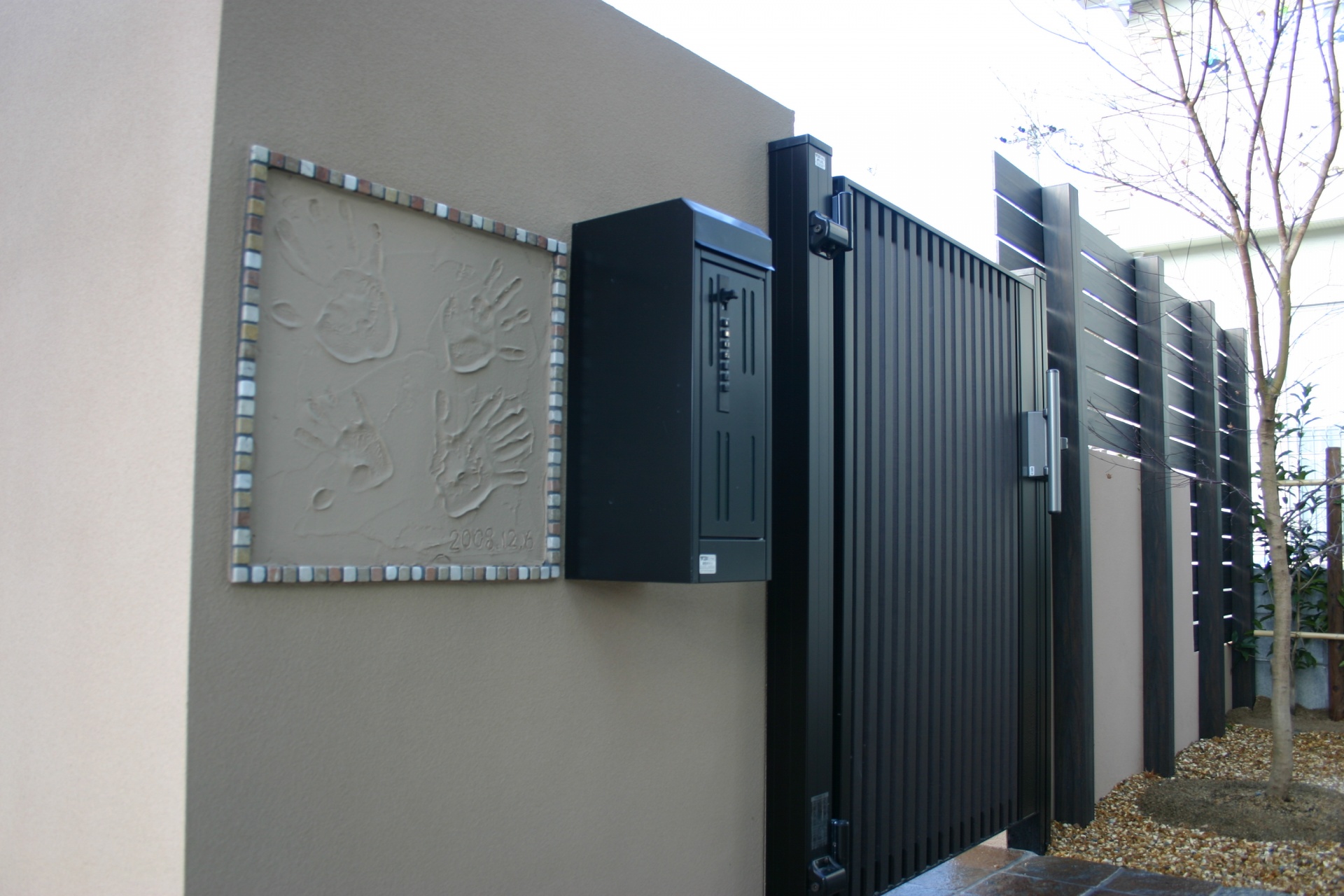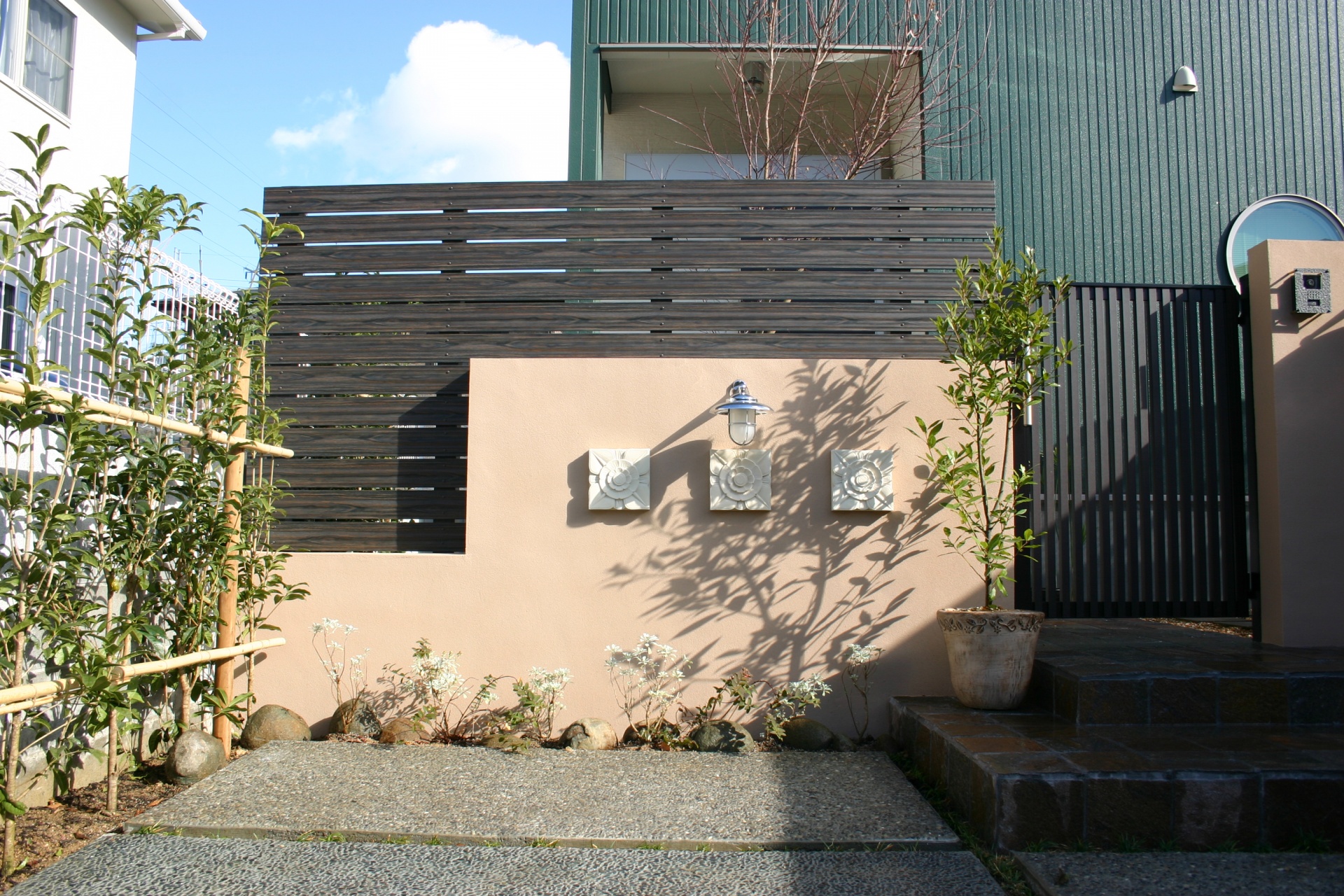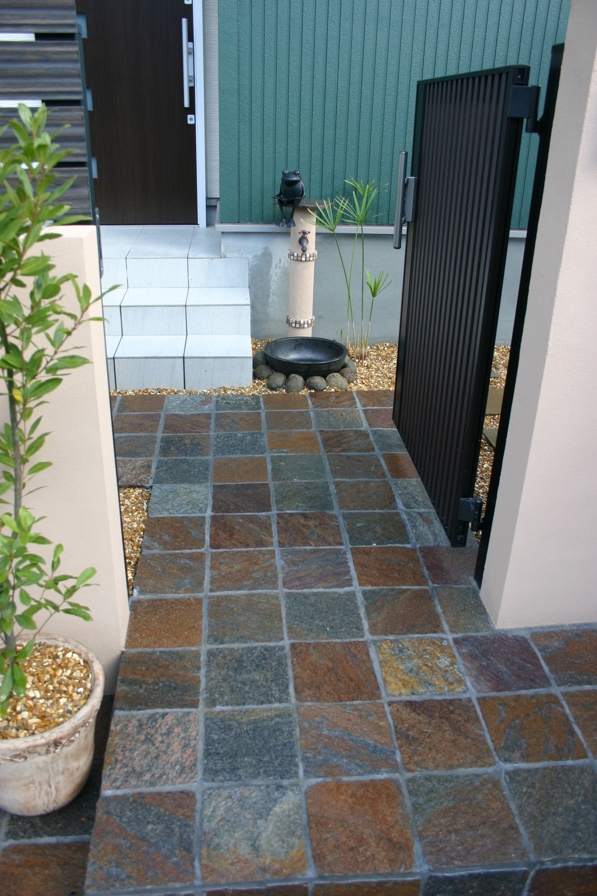 施工実績 アジアンテイストの門周り 赤穂市S様邸 建物からヒントを得ようと、考えていると印象的な丸窓が目に入ってきます。 そこで、丸窓を鞠と考え それが弾んで飛び出しているイメージを表現してみました。 前面部分が車庫スペースですが、仕切られた壁のデザインで随分動きのある、フォーカルポイントになっています。 もう一つの面白さは、門扉を開けた時に目に飛び込んできますオリジナルの立水栓。 ステップから自然石が続くアプローチ オリジナル立水栓でアイポイント