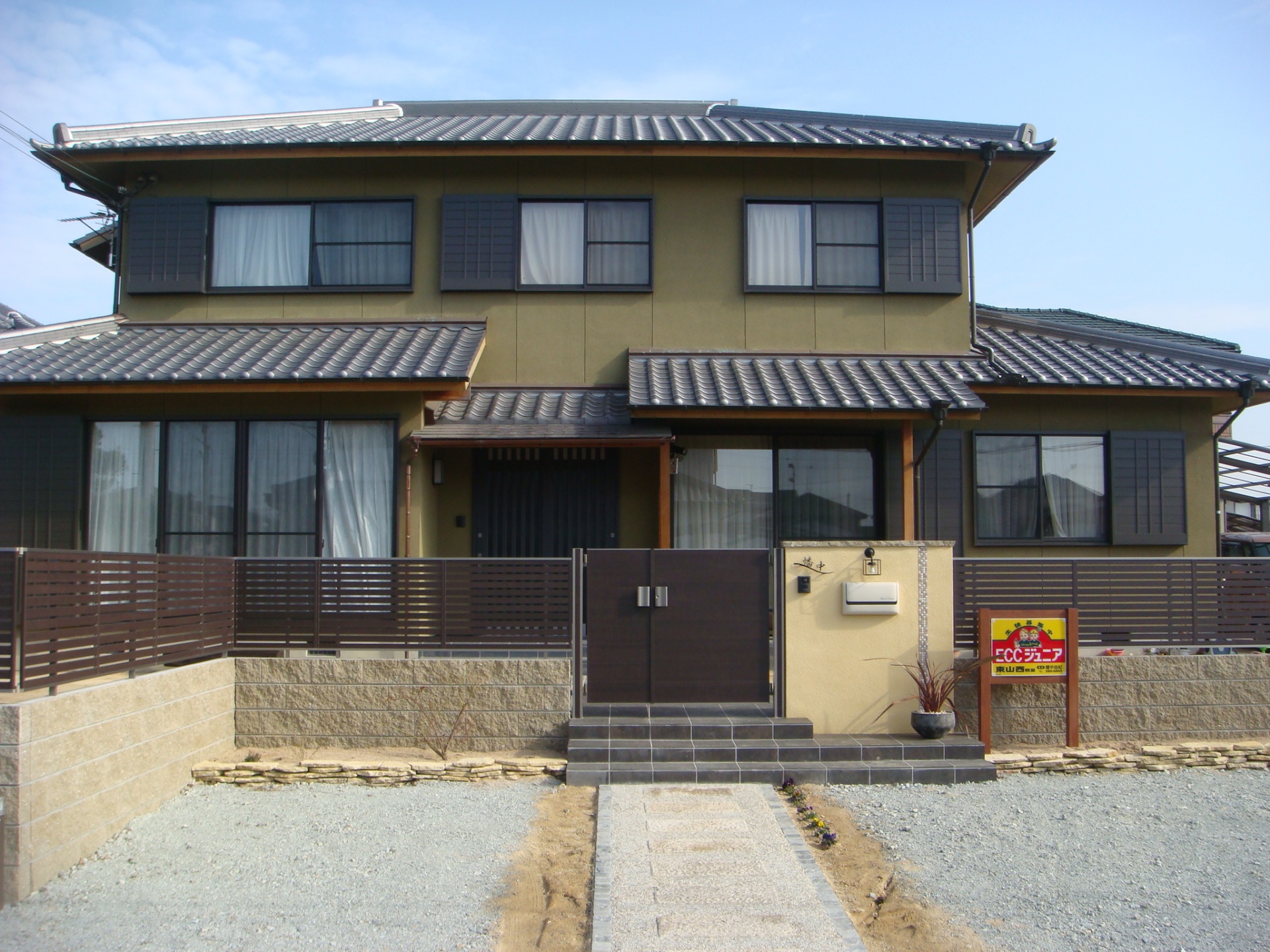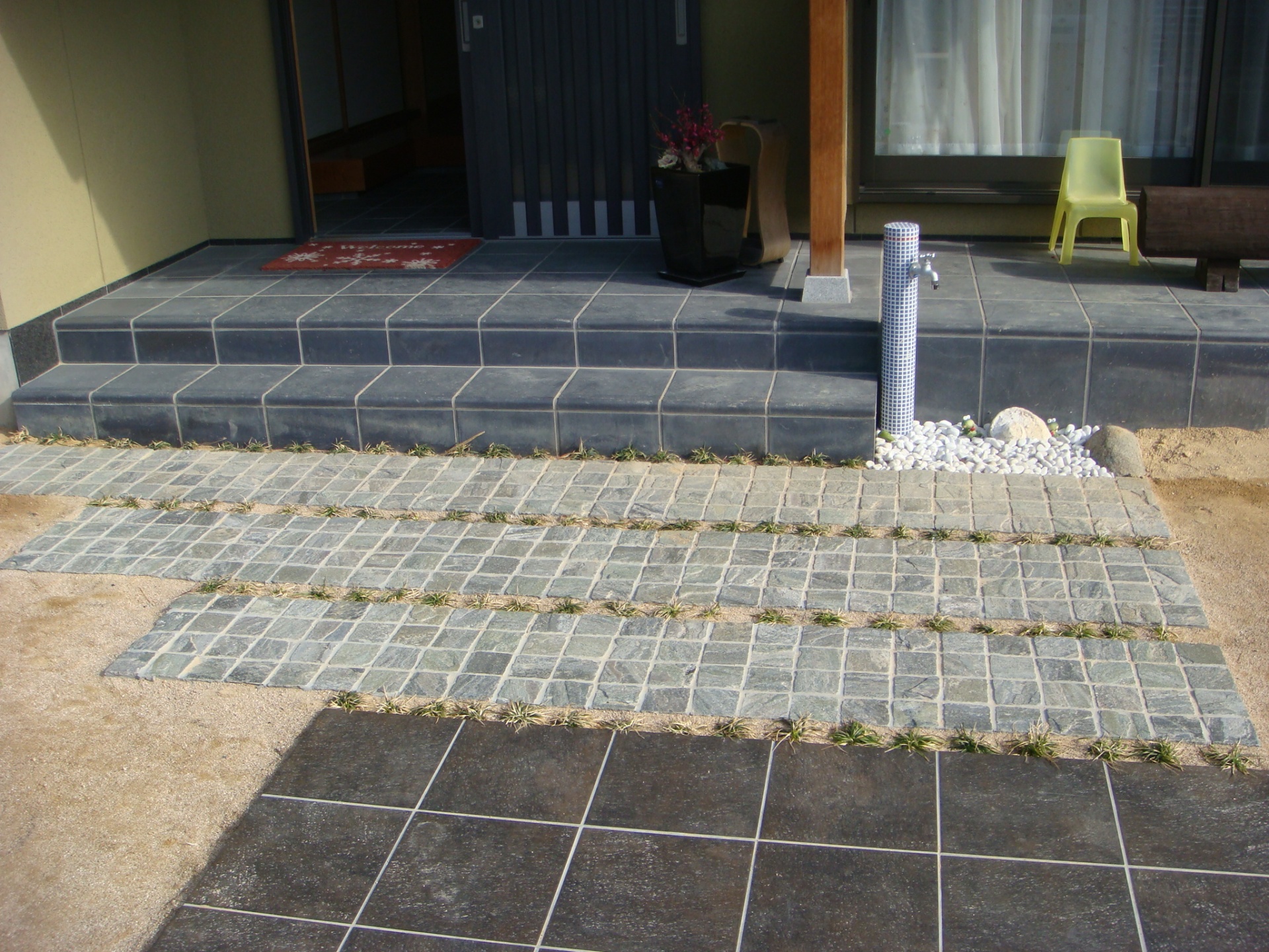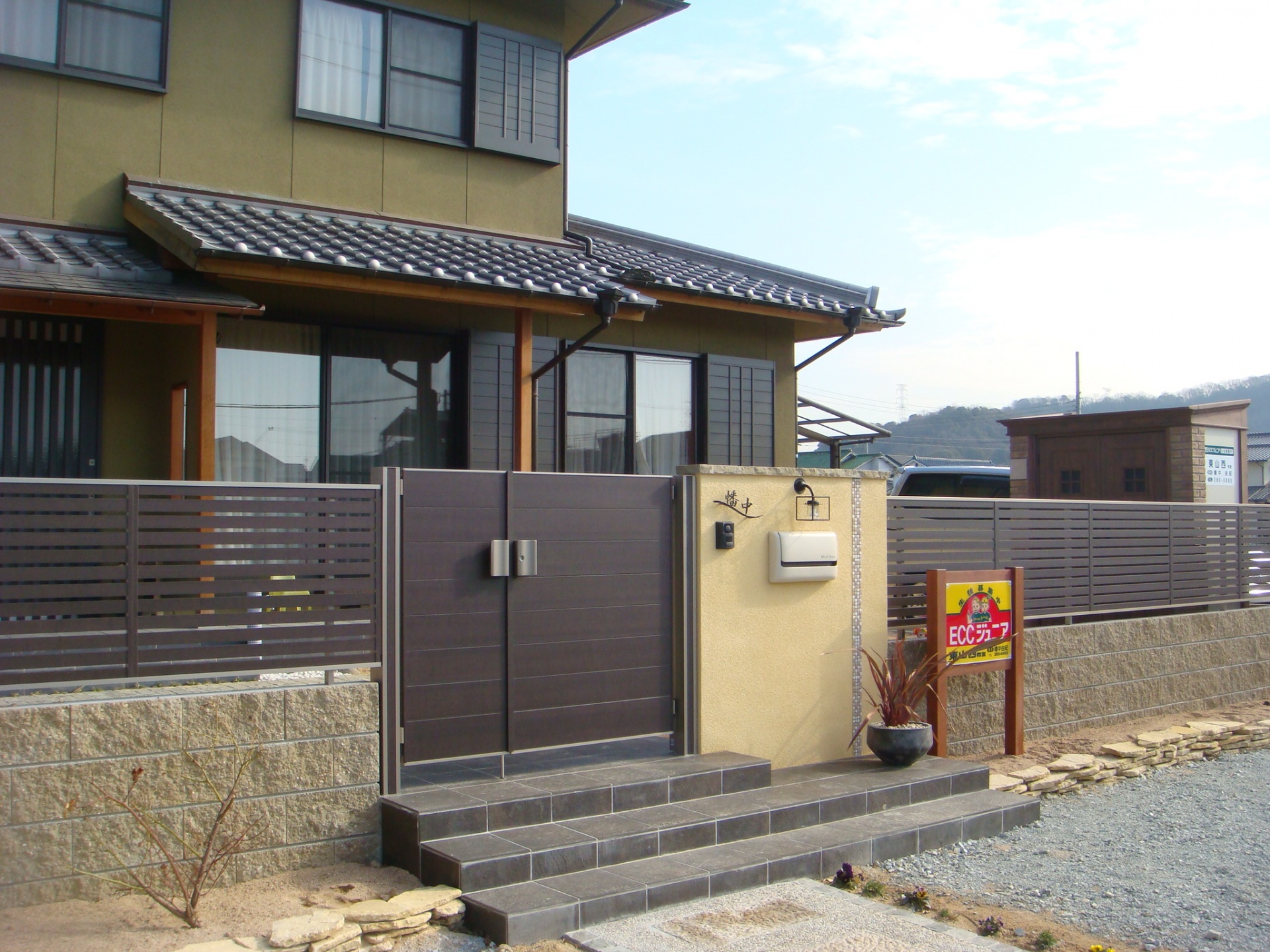 施工実績 姫路市新築外構 こげ茶で和モダンな門周り 和風な建物に合わせ過ぎず、モダンな要素も取り込んだ門周りの姫路市H様邸。 高低差があり土留めブロックにはサビミカゲ色の化粧ブロック。 和の雰囲気のあるこげ茶の門扉、フェンスで建物との調和をしました。 奥様が可愛い要素もご希望されていましたので、プライベートの庭部分には ディーズガーデン:カンナ物置を置くことで、今後のお庭作りが楽しみになります。 ゆったりと設けたステップ フェンス越しにはおしゃれ物置「カンナ」が見えます。 90□自然石アプローチが玄関へと続きます