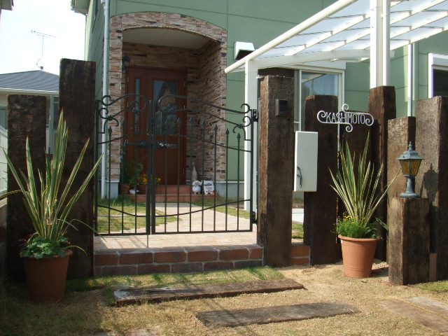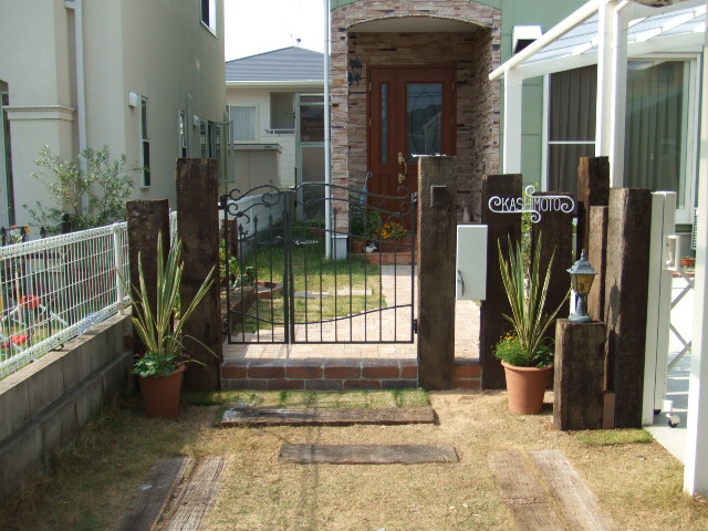 施工実績 枕木を使用したアンティークな門周り たつの市K様邸 枕木を使ってアンティークな風合いにリフォーム工事を任せて頂きました。 門扉もアイアン製の中が伺える軽めな雰囲気のもので合わせています。 門扉奥に広がる芝生の緑とも相性がいいです。 リフォーム前のお庭