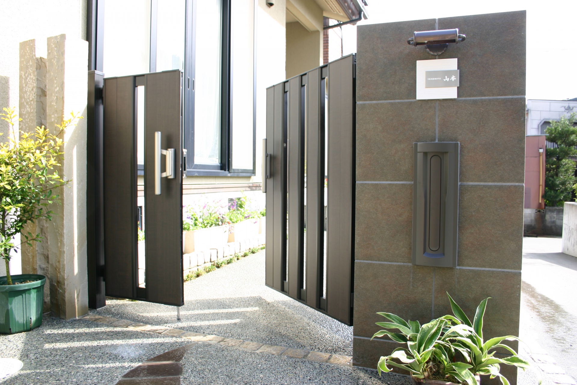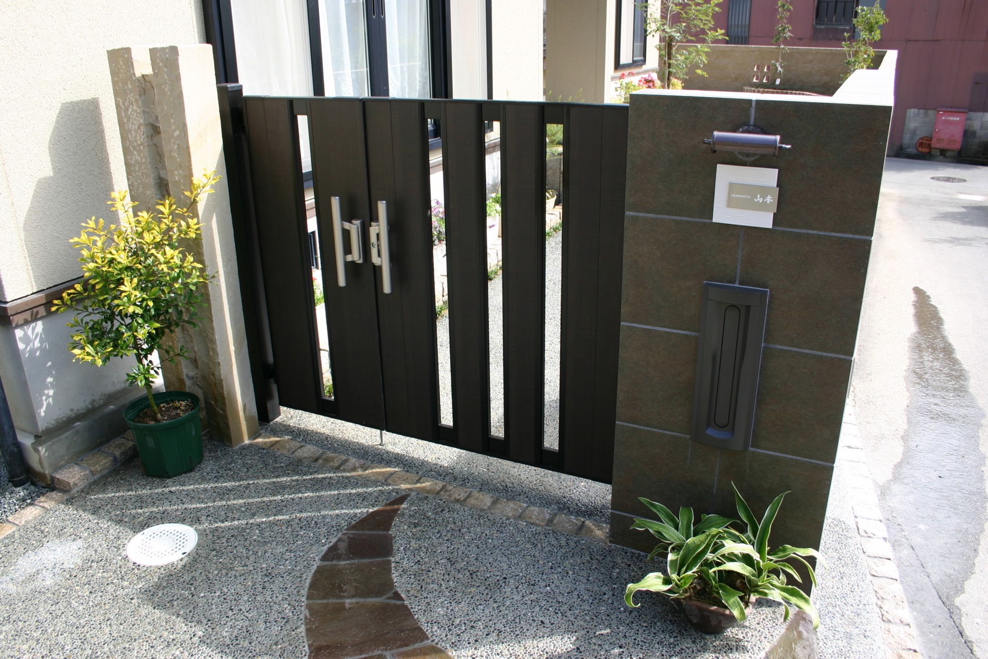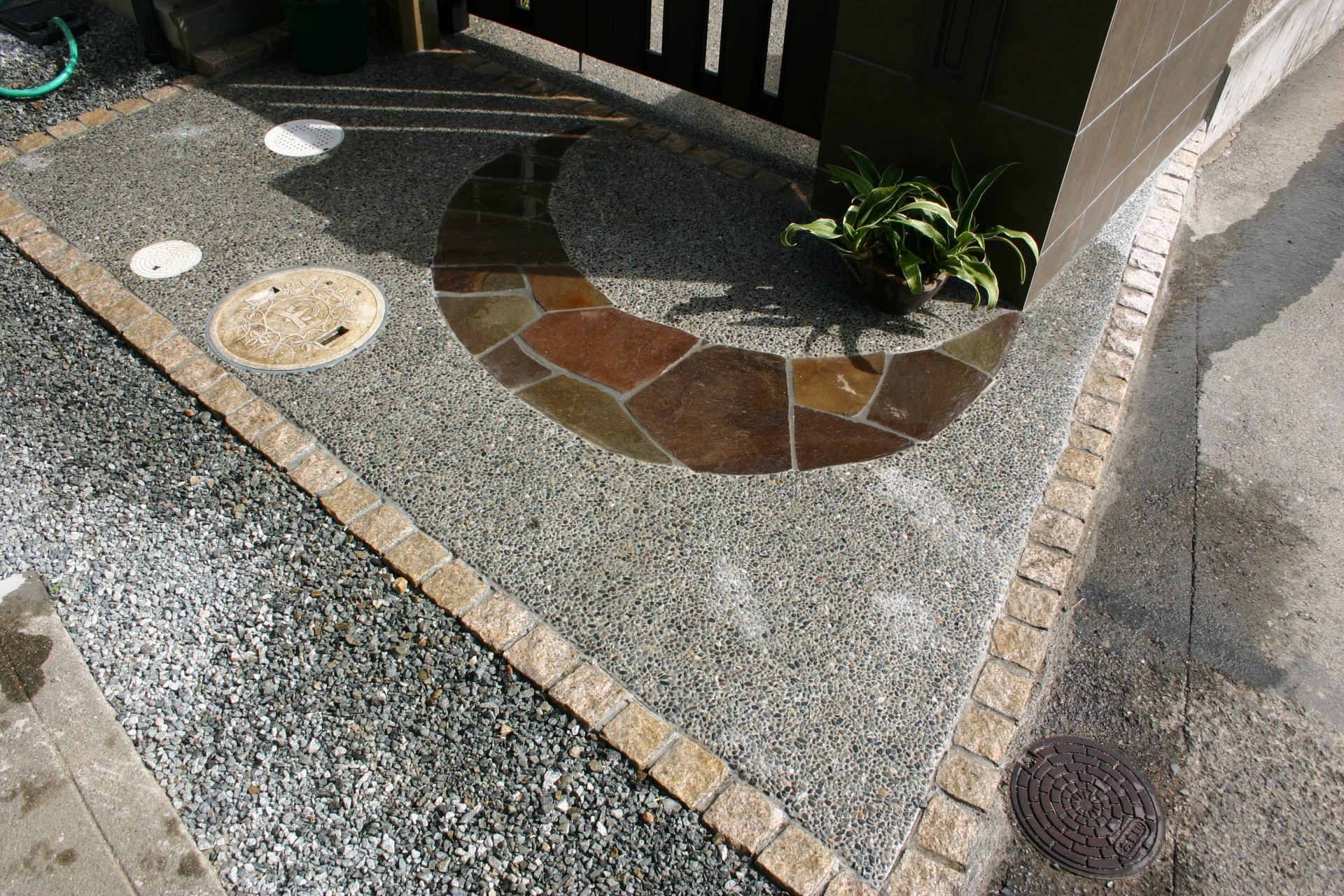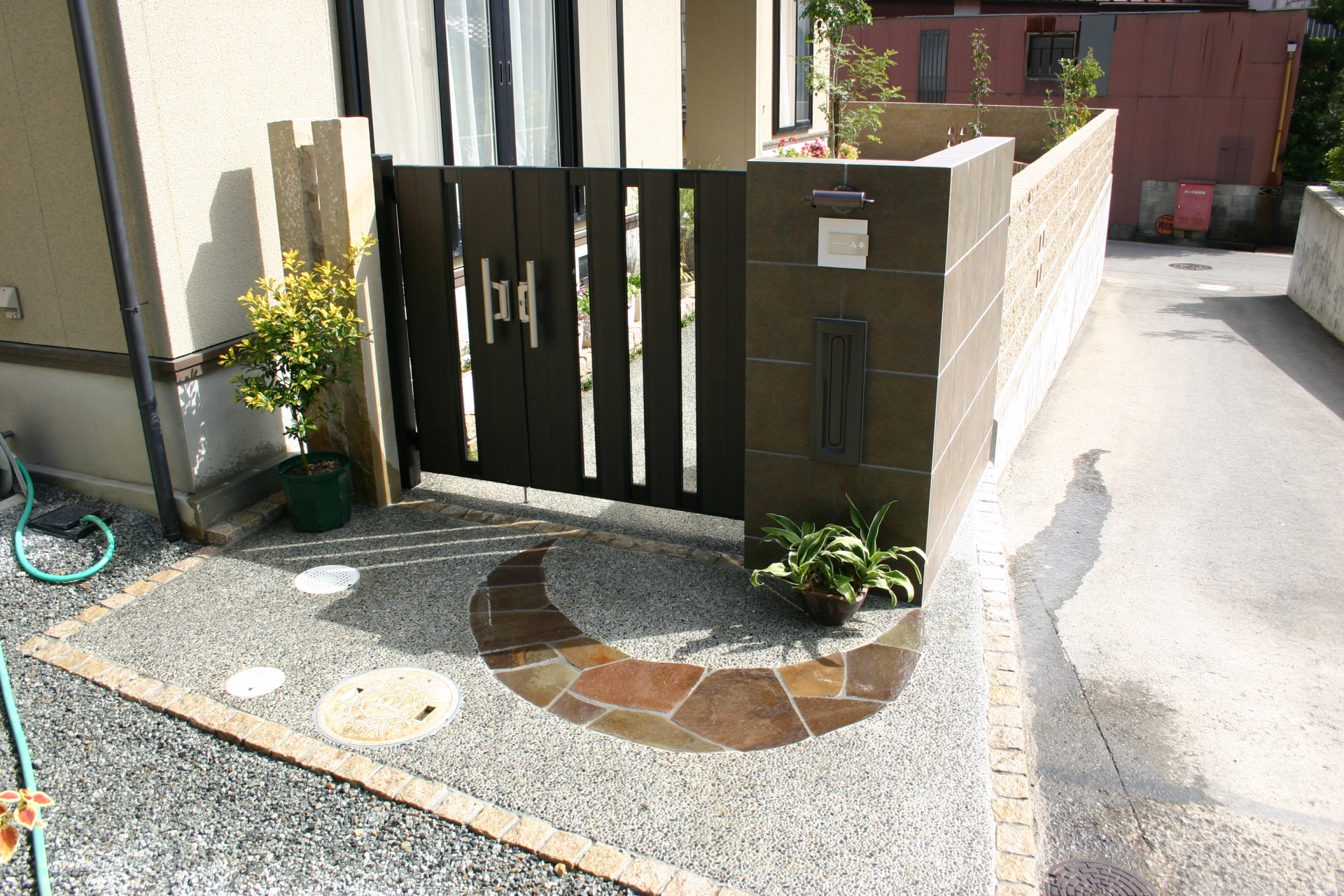 施工実績 三日月形自然石に誘われて たつの市Y様 和の雰囲気を取り込むべく、色目や植栽に気を使って仕上げました。 人の導線が道路の低い側からになりますので、門周りへと誘導する意味も込めて三日月形の自然石を土間に表現しています。 こげ茶系のタイルや門扉など、全体に落ち着いた雰囲気に仕上がっています。