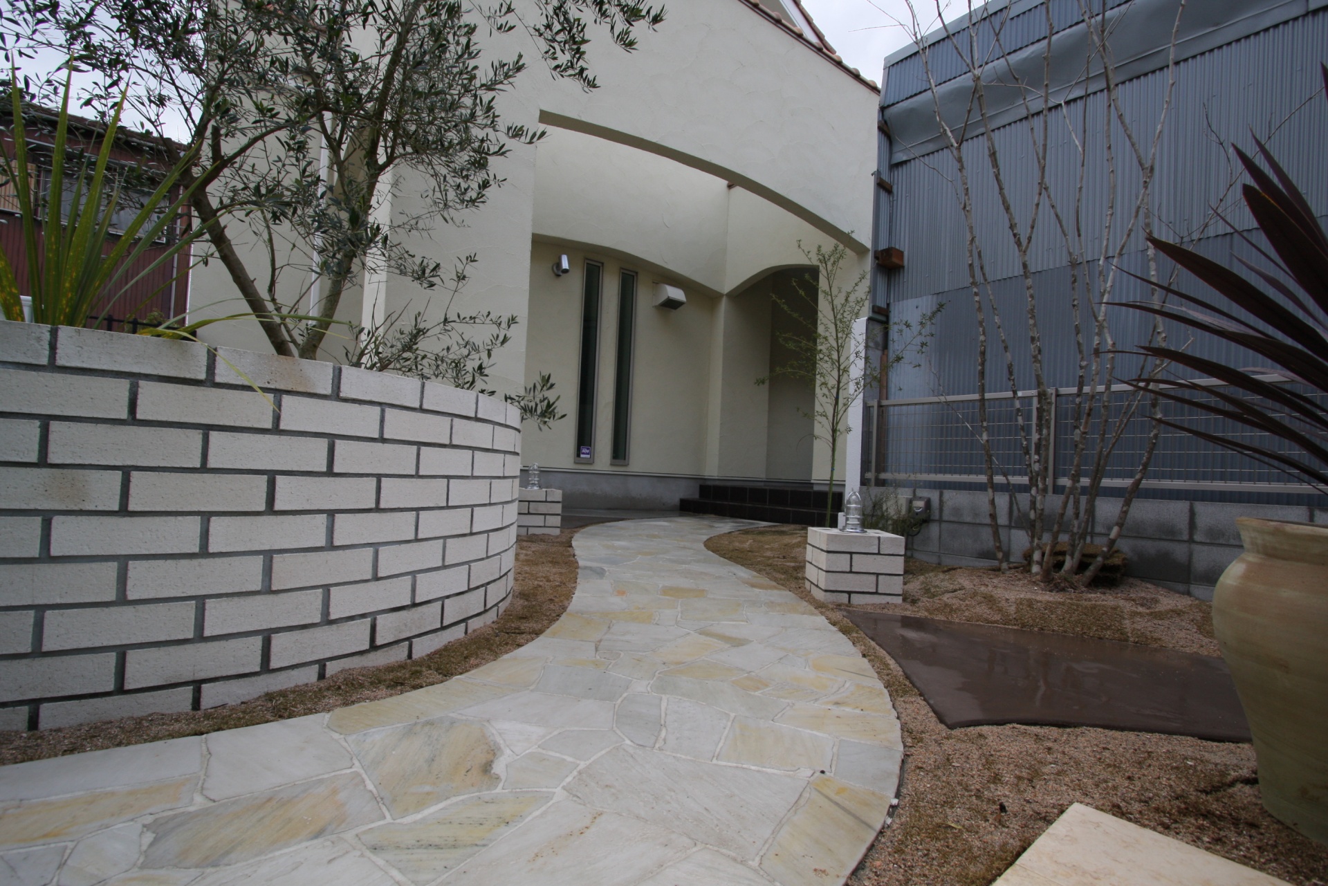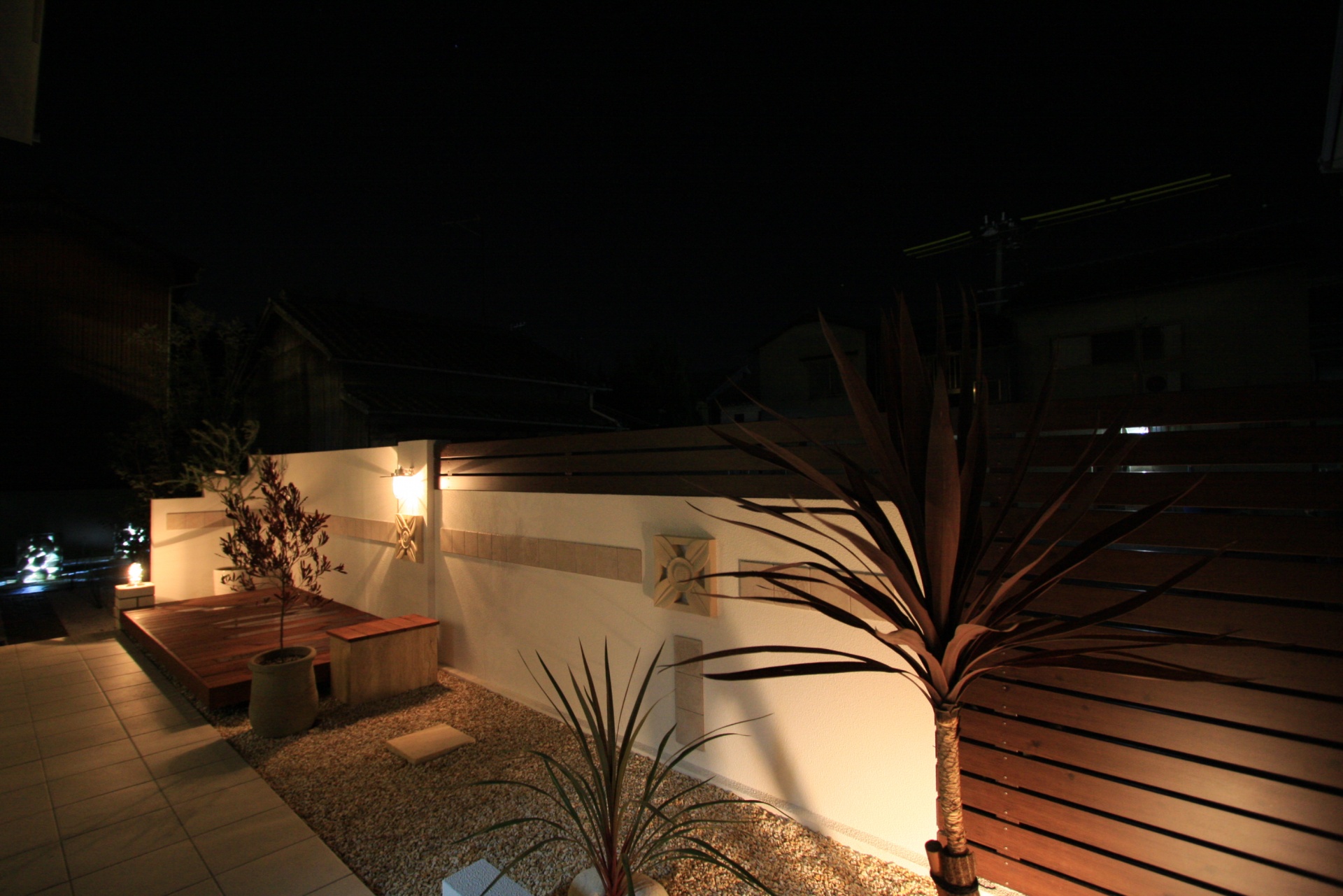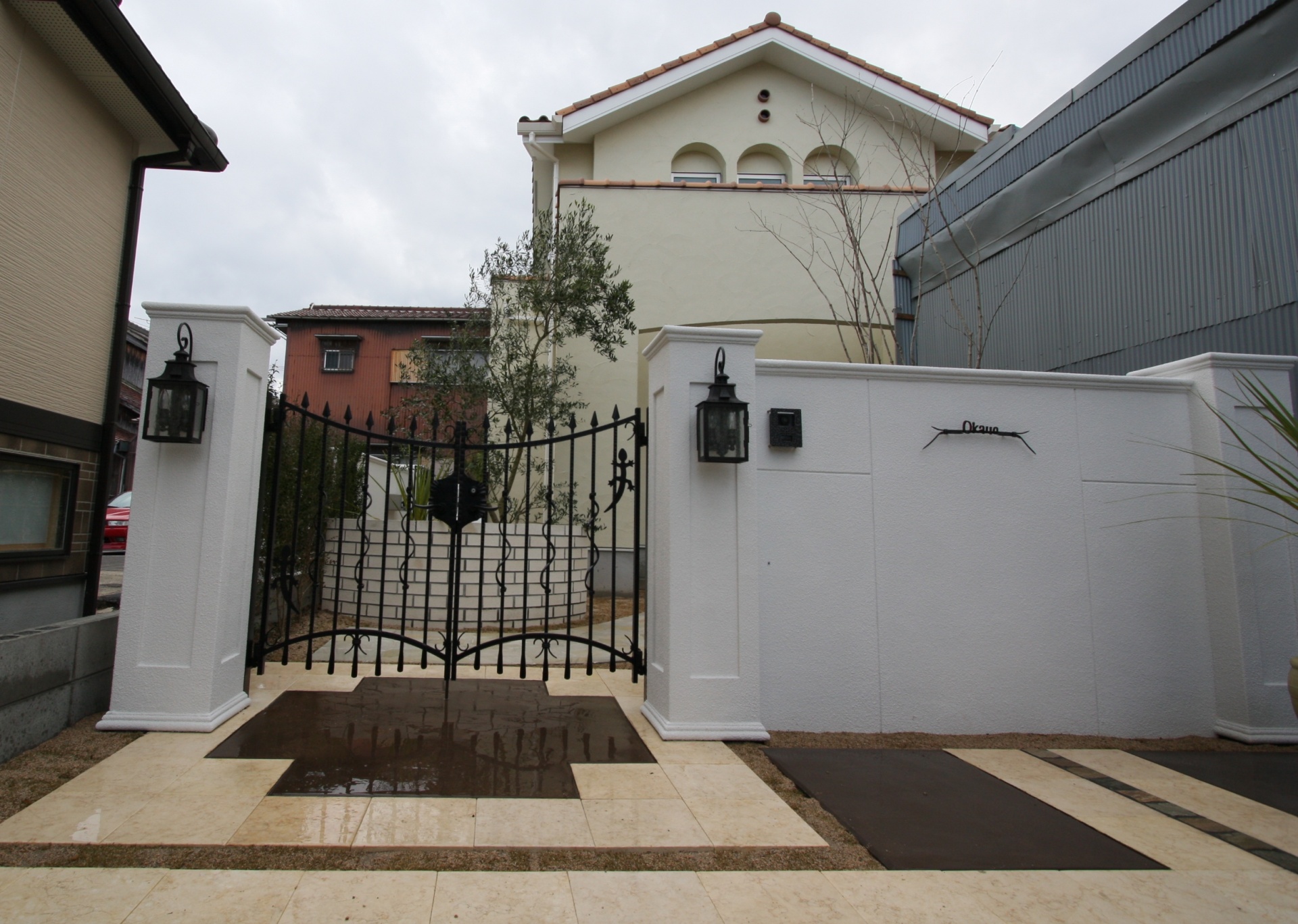 施工実績 モダンリゾートガーデン 姫路市O様邸 道路から奥に入った建物の配置や広い敷地をうまく使って、単にエクステリア・ガーデンを作るのではなく、この場所をModern Resortにする提案をしています。 モダンで異国感の雰囲気があるデザインは、まさにモダンリゾートの入口。 セミオーダーで造った門扉は他に無い遊び心とインパクトのあるデザイン。 門扉の両脇を引締める角柱は重厚感のある手の込んだ仕上げ。 白でシンプルな感じですが、壁面や天端など凹凸を付け手の込んだ仕上げです。 門から入ると綺麗な曲線の乱形自然石で造ったアプローチが玄関へ向かう。 異国を思わせる雰囲気がするリゾート風のプライベート・ガーデンです。 白をベースにすっきりとしたシンプルなデザインに、黒の乱石をアクセントにしてポイントにトクサを植えています。 夜になるとまた違った雰囲気に変わる。 夜はオブジェを白く光らせて神秘的な雰囲気に。 (夜に光る事は計画に入れていなかったので施主様にはサプライズでした。)