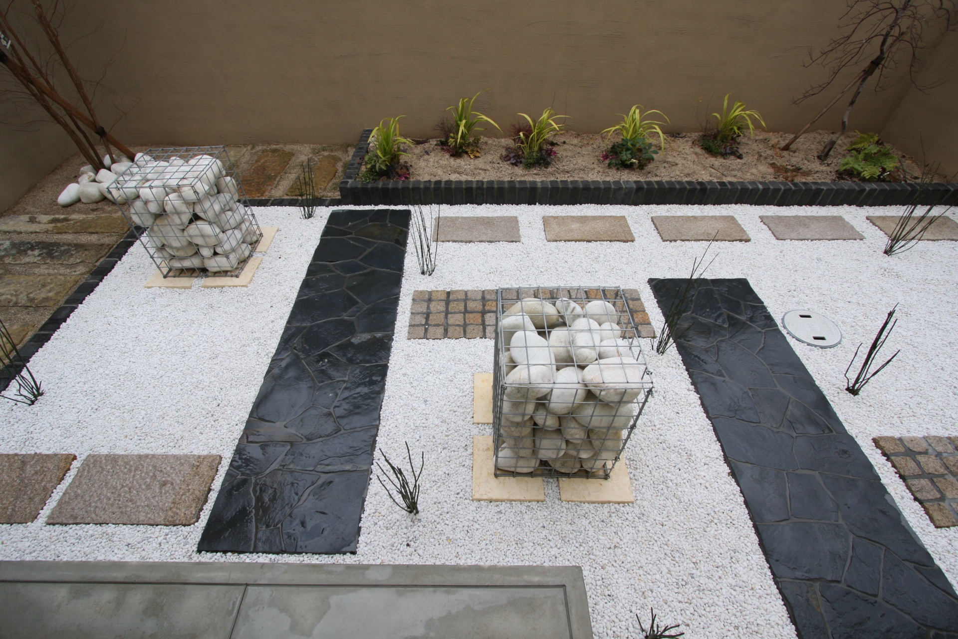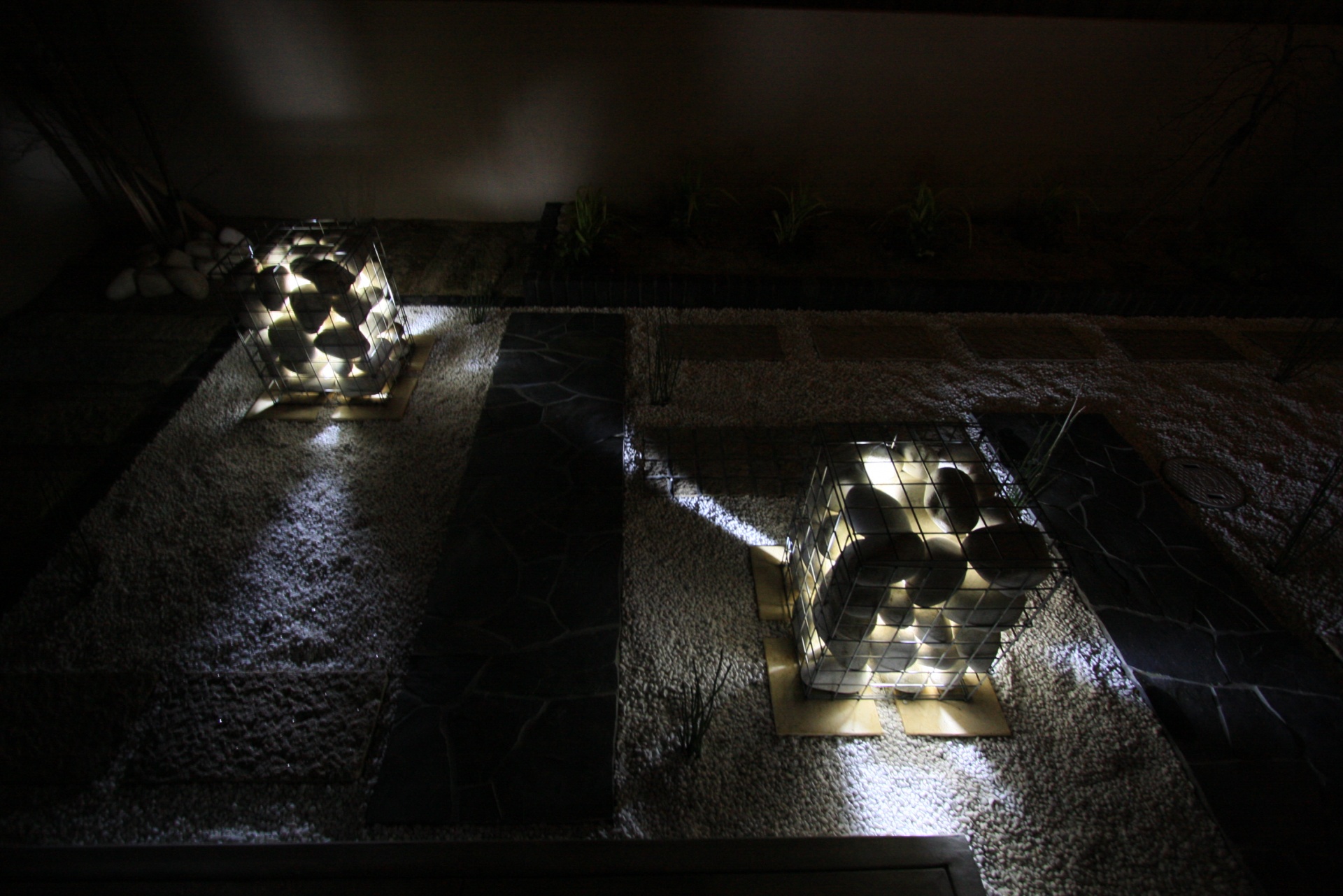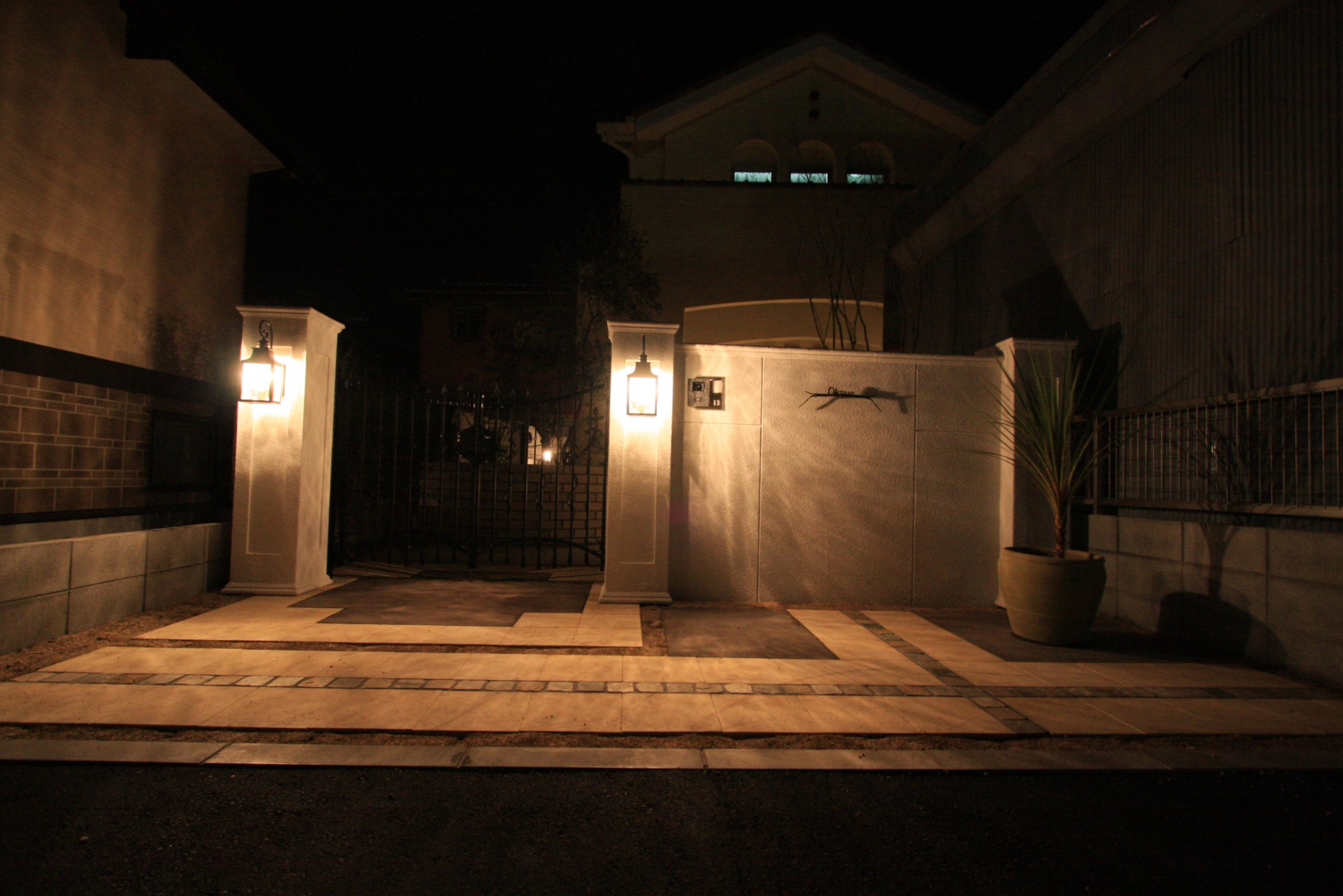 施工実績 モダンリゾートガーデン 姫路市O様邸 道路から奥に入った建物の配置や広い敷地をうまく使って、単にエクステリア・ガーデンを作るのではなく、この場所をModern Resortにする提案をしています。 モダンで異国感の雰囲気があるデザインは、まさにモダンリゾートの入口。 セミオーダーで造った門扉は他に無い遊び心とインパクトのあるデザイン。 門扉の両脇を引締める角柱は重厚感のある手の込んだ仕上げ。 白でシンプルな感じですが、壁面や天端など凹凸を付け手の込んだ仕上げです。 門から入ると綺麗な曲線の乱形自然石で造ったアプローチが玄関へ向かう。 異国を思わせる雰囲気がするリゾート風のプライベート・ガーデンです。 白をベースにすっきりとしたシンプルなデザインに、黒の乱石をアクセントにしてポイントにトクサを植えています。 夜になるとまた違った雰囲気に変わる。 夜はオブジェを白く光らせて神秘的な雰囲気に。 (夜に光る事は計画に入れていなかったので施主様にはサプライズでした。)