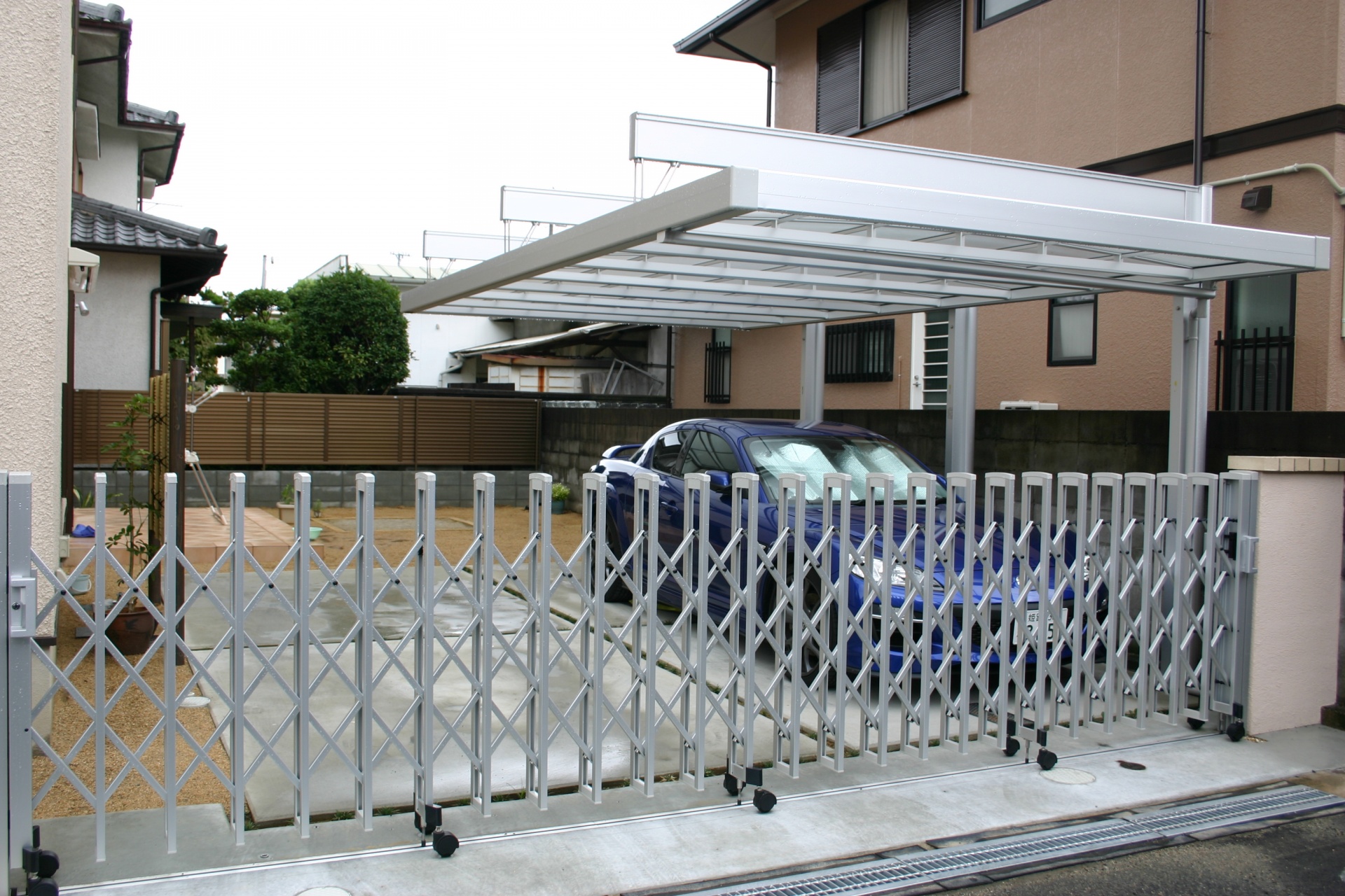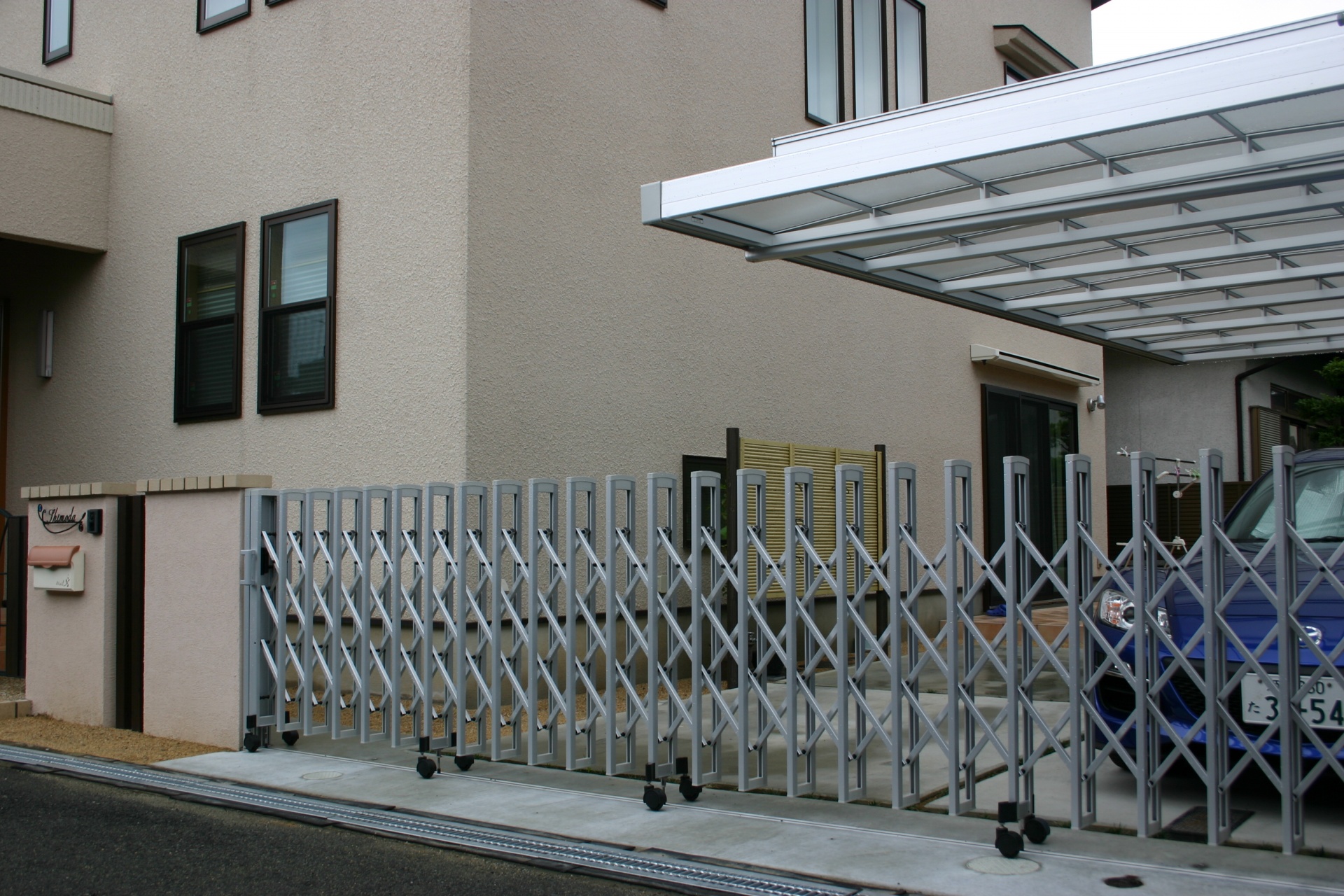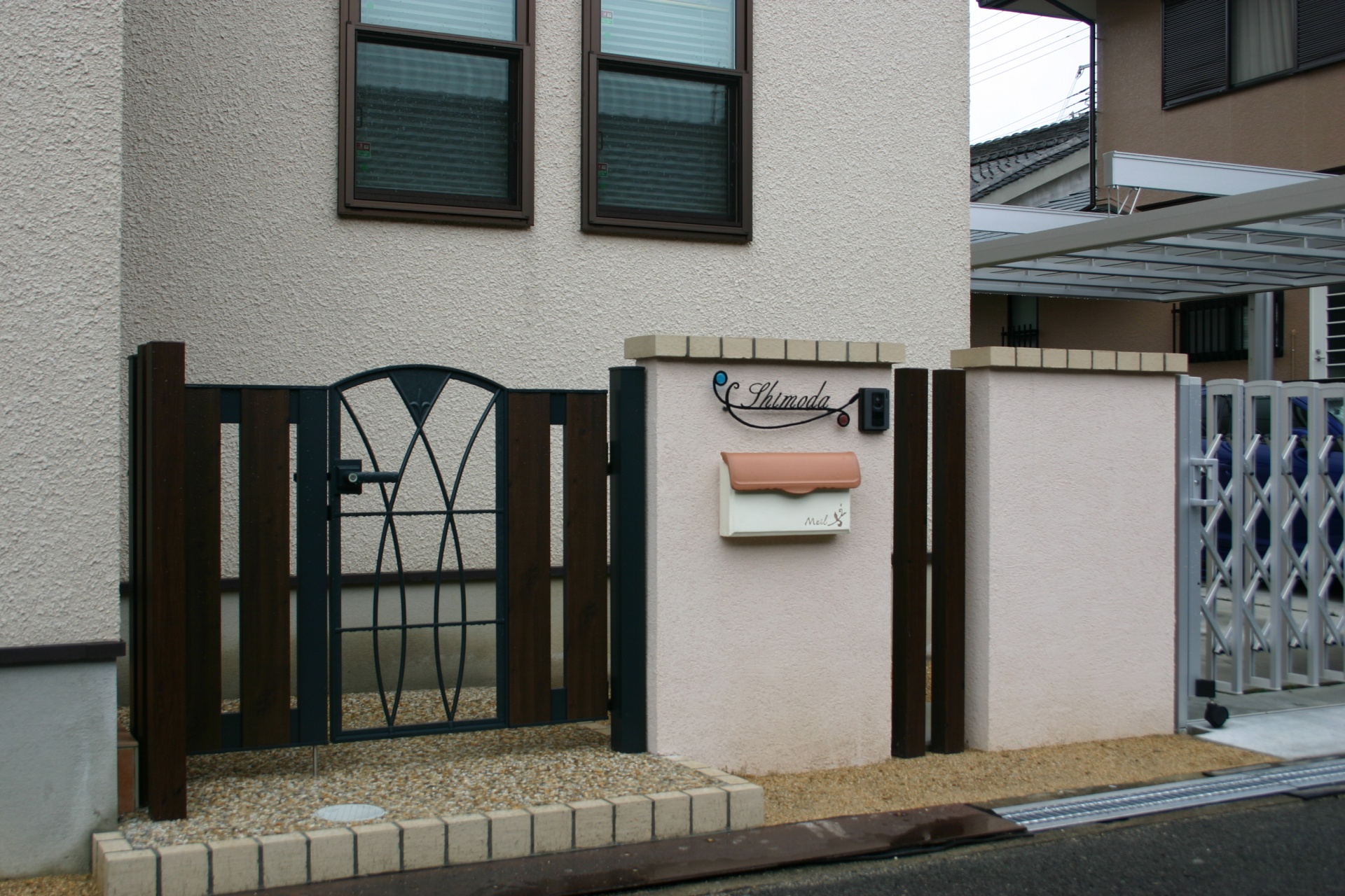 施工実績 木目で上品な門周り 姫路市S様邸 こげ茶の木目をあしらった門扉とアルミのスリットフェンスで上品な仕上がりになっています。 門扉の外側で1段ステップを取ることで生まれる、豪華さも醸し出しています。 ディーズガーデン:スタッコ-Uの可愛さがワンポイントです。