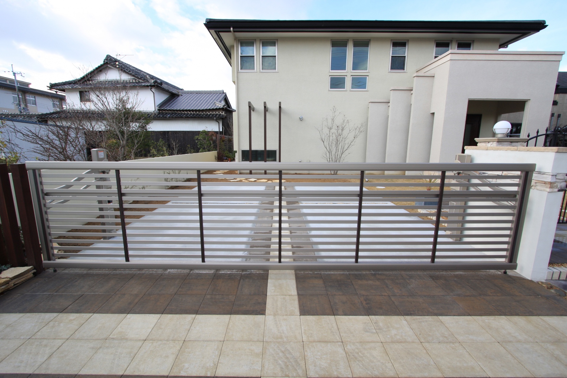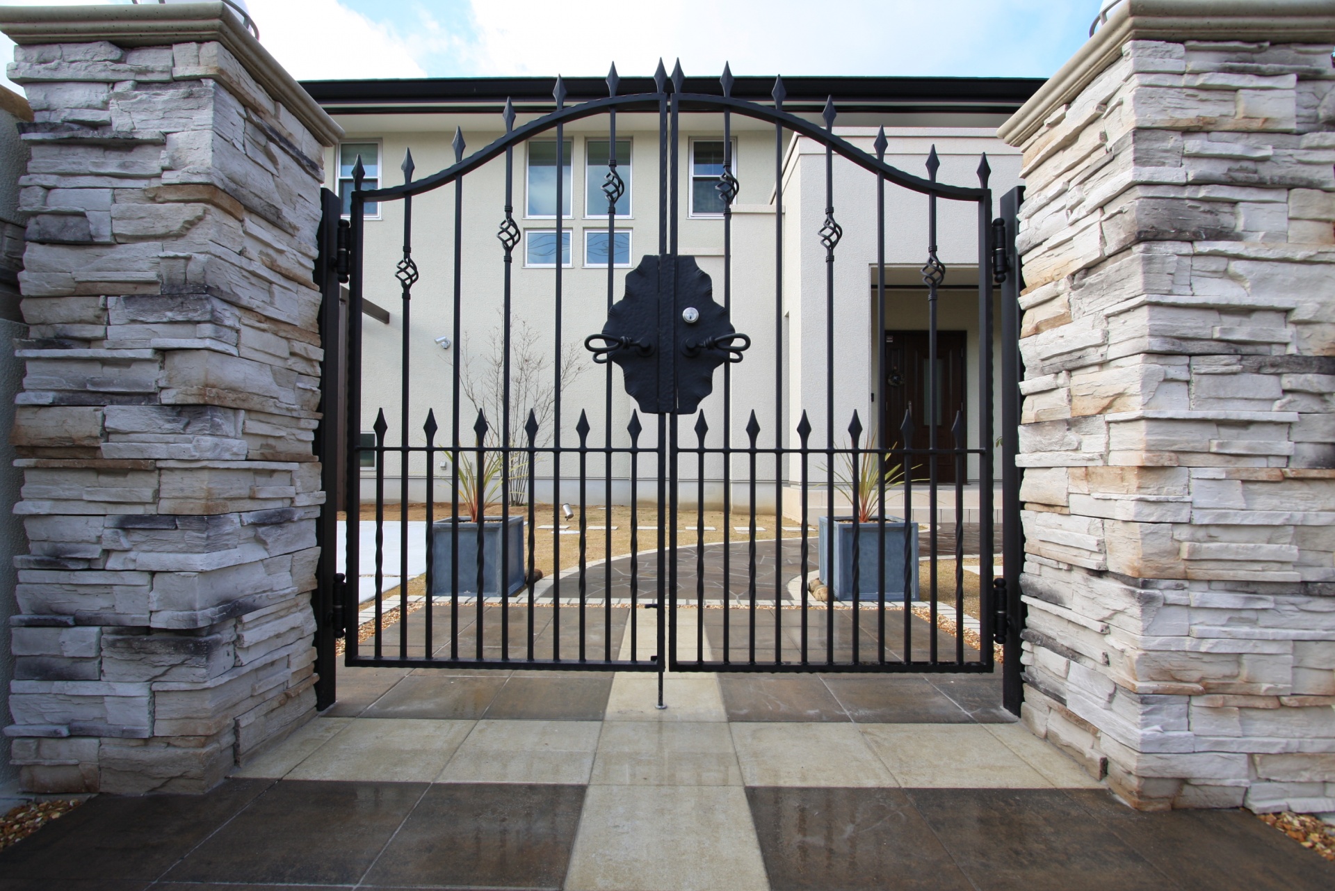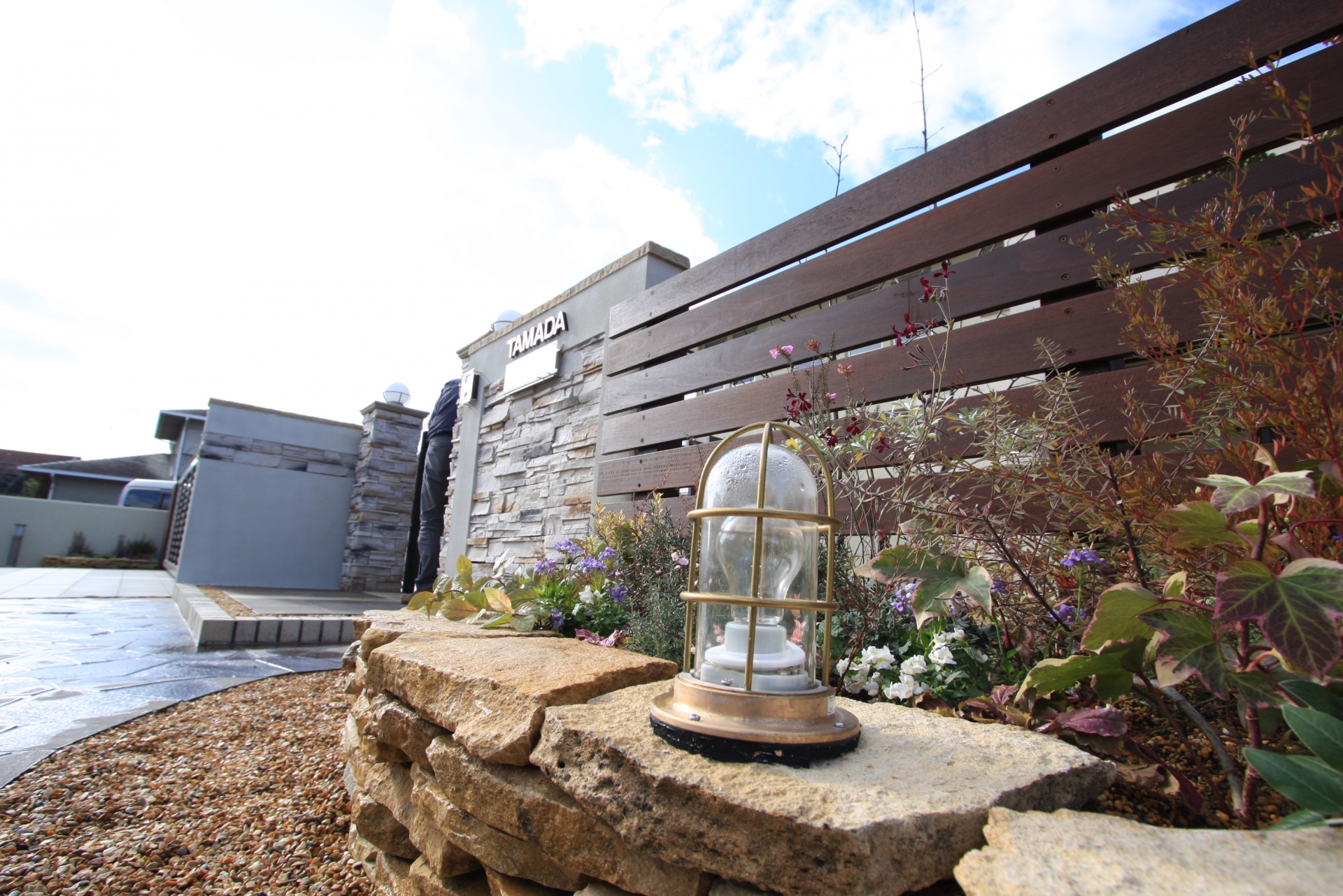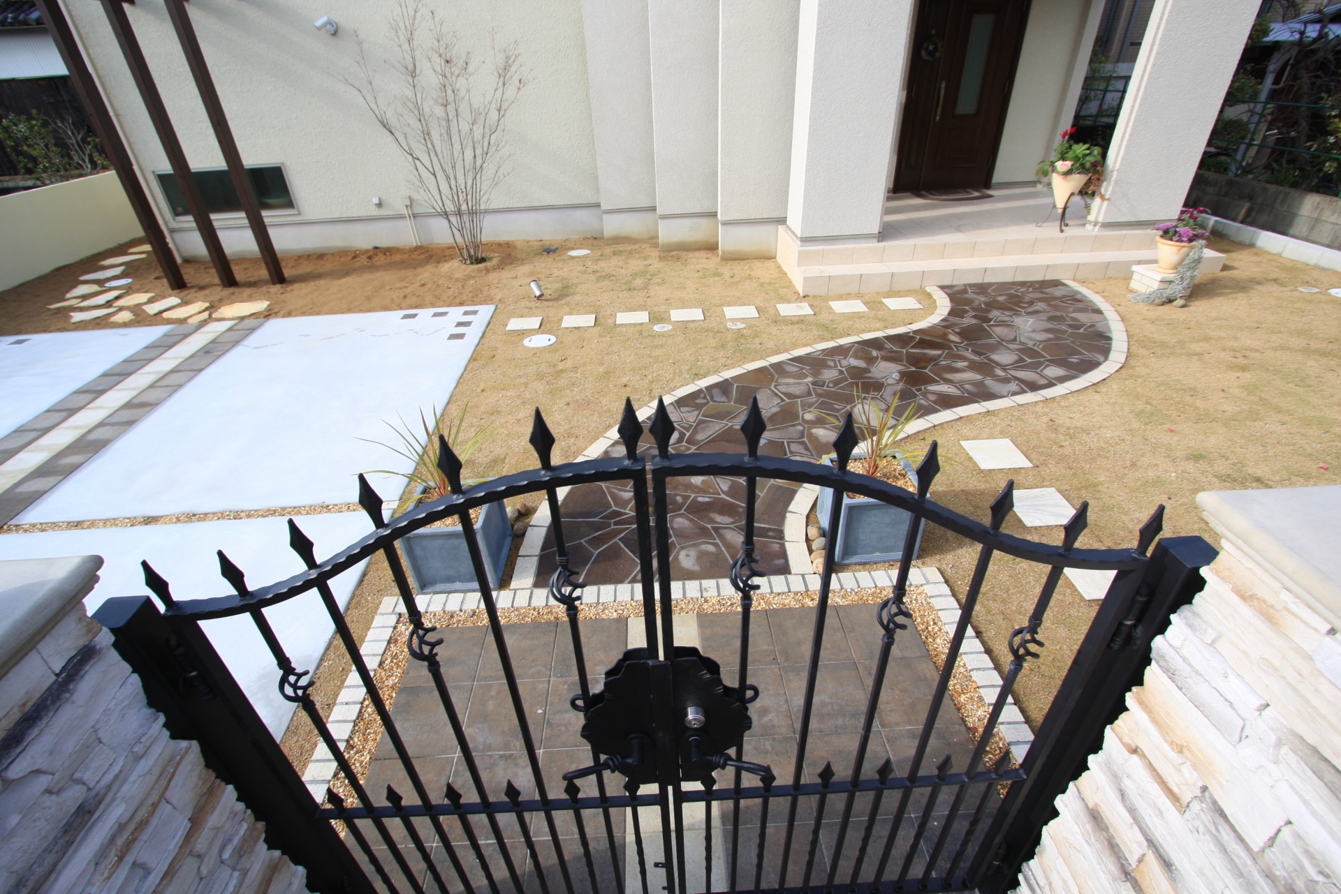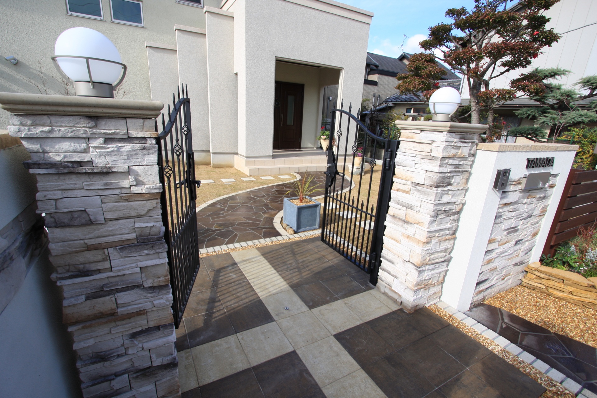 施工実績 奥様念願のロートアイアン門扉 太子町T様邸 レンガで少し高さを持たせた門周りは、より上質さを感じる仕上がりとなっています。 前面道路の交通量が多い為、車庫スペースの寸法を慎重にプランニングしました。 セットバックしたスペースは車の出し入れに余裕を持たせ、且つサブの車庫スペースとしてもご利用いただけます。 門廻りは少しゆとりを持たせレンガで立ち上がりを作りました。 豪華な門柱の間には奥様念願のロートアイアン門扉を! 玄関ポーチから前面道路にかけてのスペースに塀を設けず、 木製フェンス+石積み花壇という組み合わせで閉鎖的にならずに両側の袖壁を引き立たせてくれます。 花壇の石積みの色目が色あせて落ち着き、敷地内の芝生、落葉樹の緑が出てくる頃になるとより一層建物が引き立つことでしょう。 石積み調タイル張りの角柱をどっしりと設け、オリジナルの門扉で豪華さを演出。 曲線の石張りアプローチをレンガで縁取り上品な仕上がりになっています。 外から内へと繋がりのある車庫デザイン