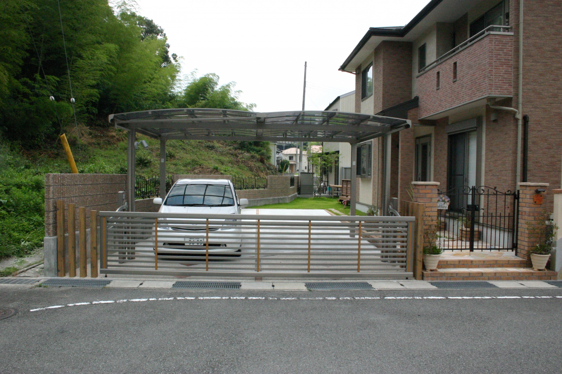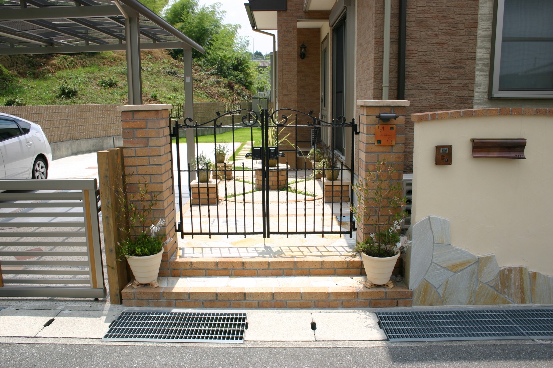 施工実績 リズミカルな曲線壁 たつの市S様邸 レンガ角柱でしっかりと門柱を構え、袖壁にはアールの塗り壁に笠木レンガ。 巾木に自然石の乱形を使用し豪華も兼ねそろえました。 袖壁の距離が長いのでレンガの開口部分には植木鉢を、ガラスブロックは夜には光り輝き、昼間と違った表情になります。 植栽は袖壁の後ろに常緑樹を、門廻り+アプローチには植木鉢で緑を取り入れました。 アプローチ奥にある庭のシンボルツリーに葉がつく頃には、芝生のグリーン面も手伝ってより爽やかな風を運んできてくれるでしょう。 オーバードアにも木目調アクセント