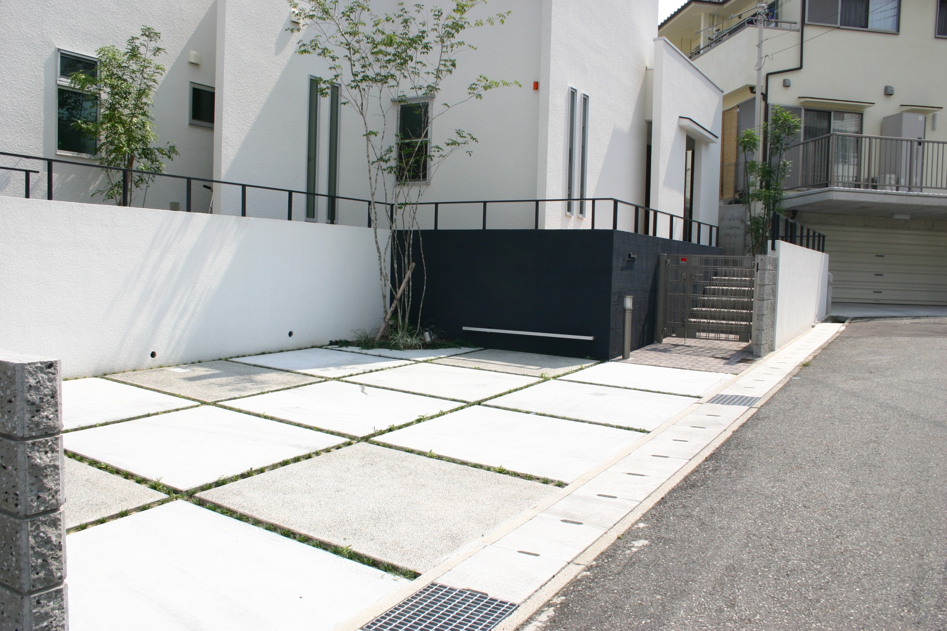 施工実績 新緑の緑が建物外壁に映える 神戸市K様邸 ホワイトとブラックのツートンカラーの吹付けで、シンプルモダンのエクステリアに仕上がりました。 植栽には落葉樹のトネリコ、サイドにはシマトネリコを植樹。 ホワイトの壁にグリーンのアクセントが涼しげに影を写し出します。 異素材の組み合わせで仕上げた門周り 枡目で色を替えた土間デザイン 白の外壁に爽やかな緑が映えます 黒塗装のステンレスフェンス エクステージ