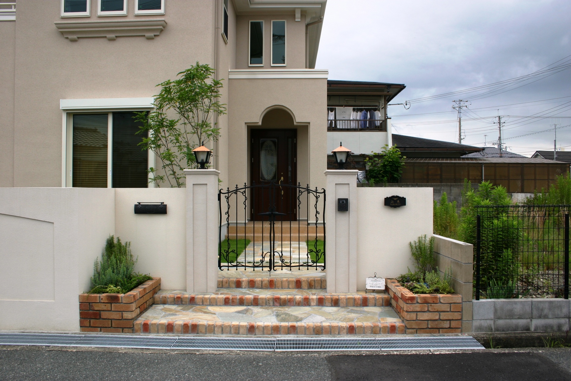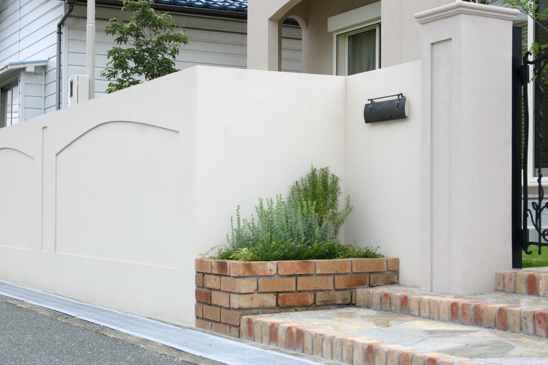 施工実績 テクスチャーに拘った白でエレガントに 赤穂市Y様邸 ソフトべージュの建物に明るいホワイト調の吹付けで上品なイメージに仕上げました。 塀部には思い切ったニッチ加工で単調になりがちな壁をうまくデザインしました。 アプローチには古レンガ風の色合いを意識し上品ななかにもアンティークな感じを演出しています。 ニッチ加工がさりげない上質さを表現しています 自然石が続く豪華なアプローチ 笠木のテクスチャーにも注目です