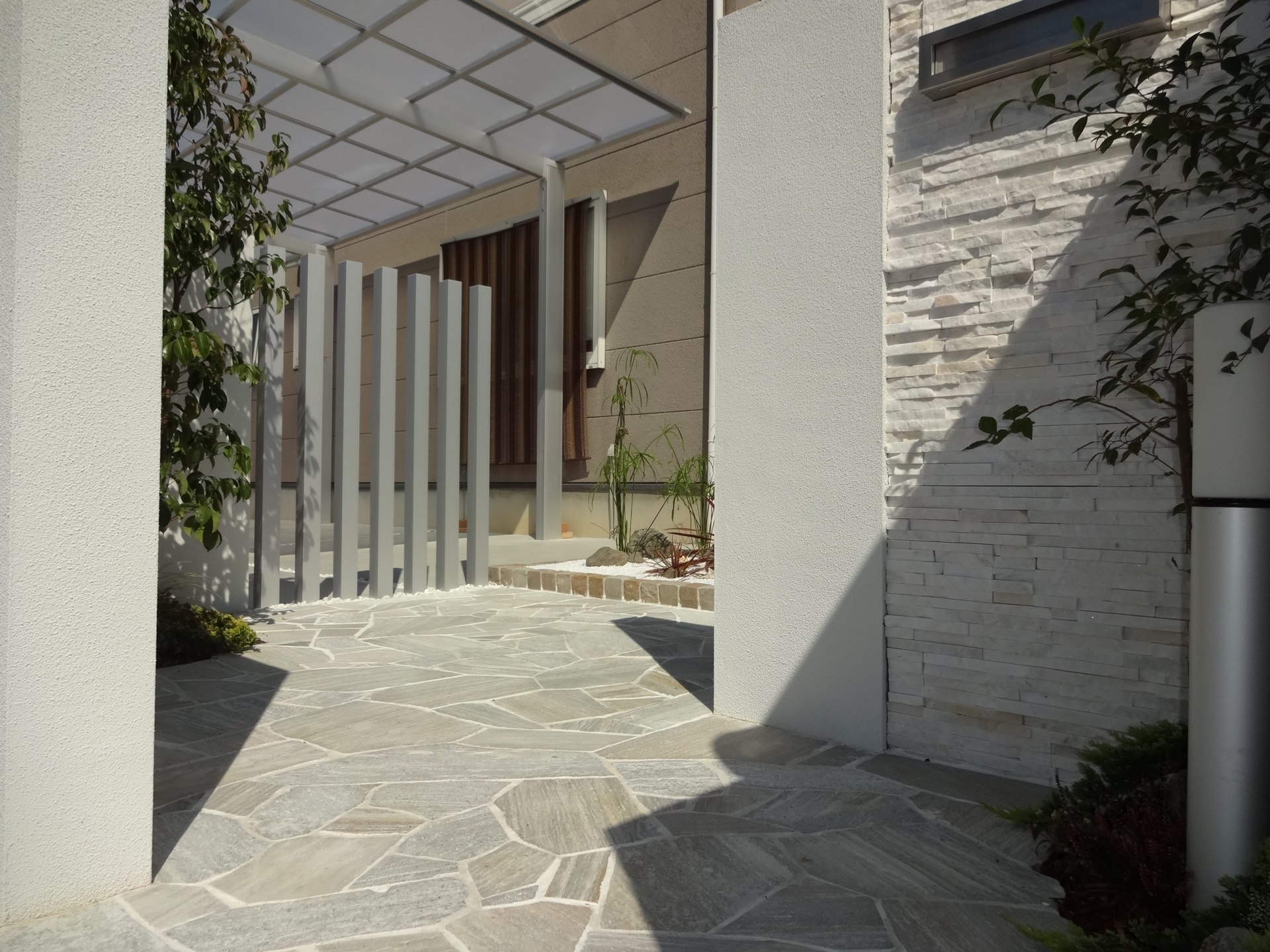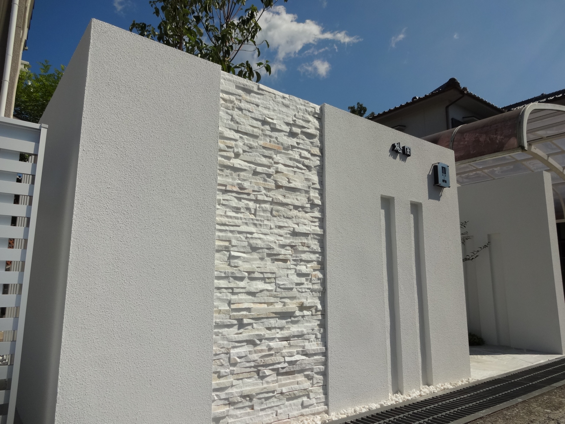 施工実績 上郡町リフォーム外構 白で統一されたシンプルで上品な門回り 車庫の拡張のご依頼を受けました上郡町M様邸現地でお話を伺っていますと門周りと合わせてリフォームをご希望されていました何度かのプラン変更を経て白を基調とした門周りへとリフォームさせていただきました全体は白ベースですが素材やテクスチャーの違いでおしゃれな門周りになりました 白に余計な色目を合わせたくなかったのでインターホンにもステンレスのカバーを取り付けていますニッチ加工も仕上げを吹きつけにすることで存在感があります アプローチの先は車庫との仕切りでシルバー色の角柱を使用しましたアプローチ自然石も白目地で仕上げることで色むらを活かす事ができています オーバードア・カーポートもシルバー色でシンプルで白の門周りとも調和しています