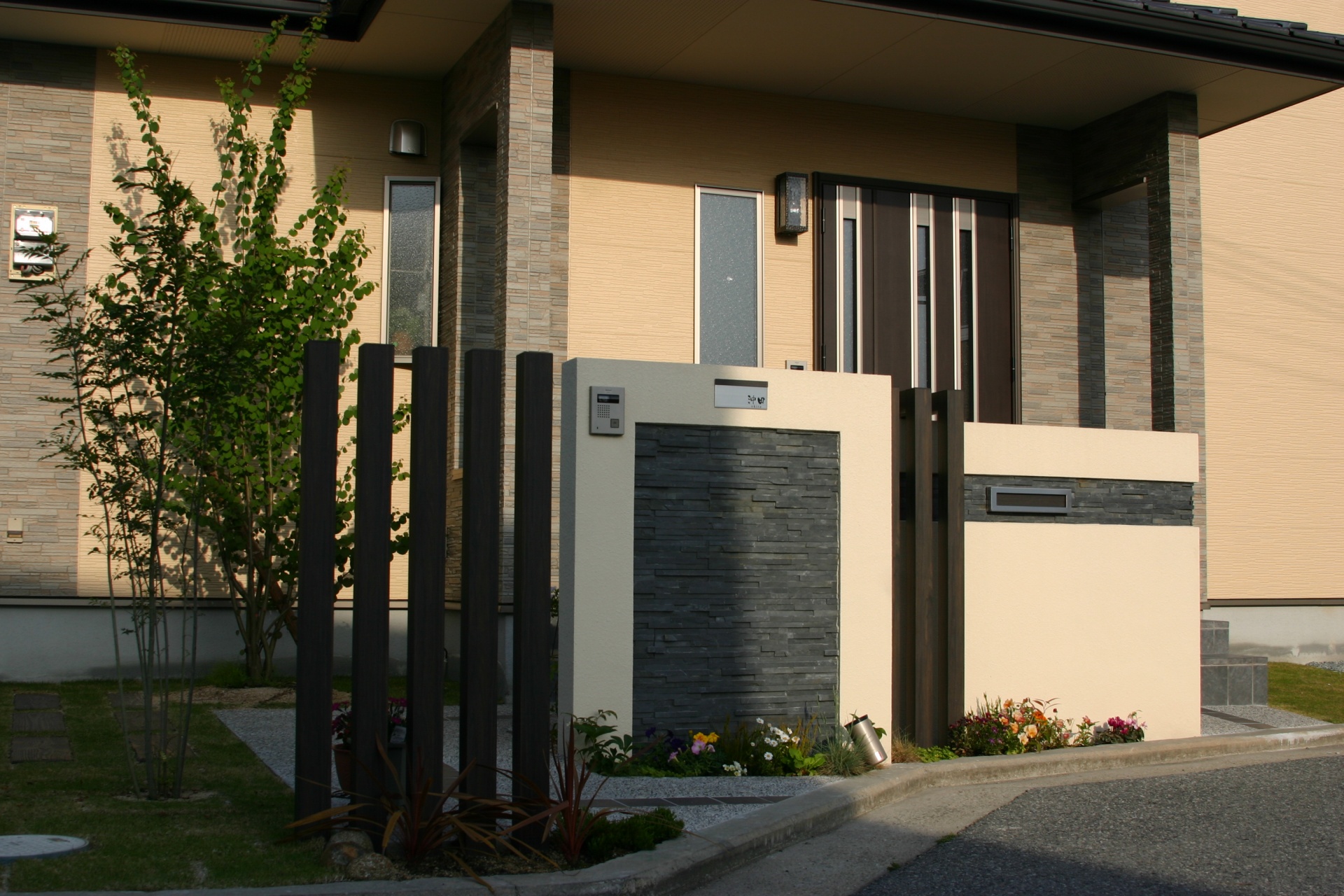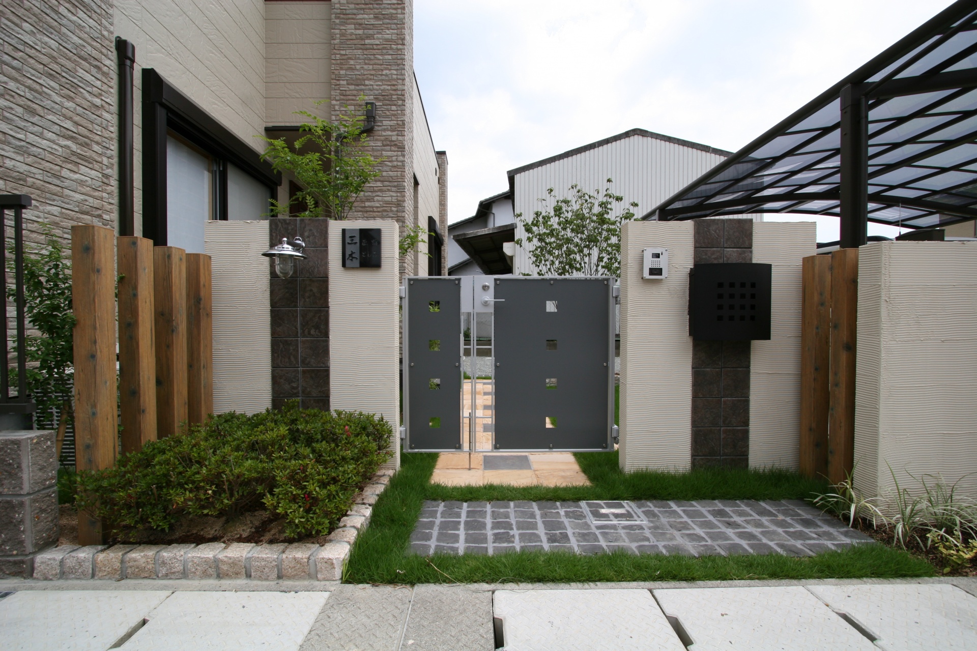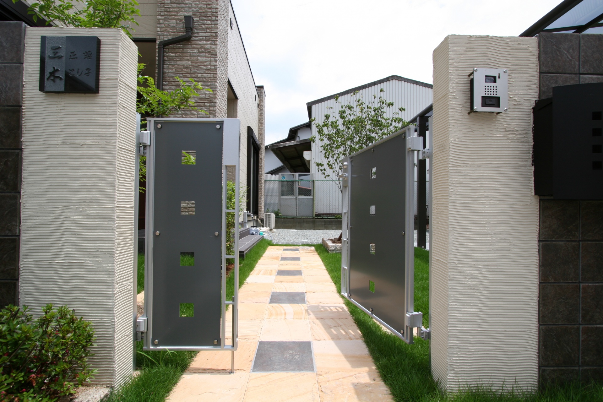 施工実績 縦ラインを強調した門周り 姫路市M様邸 四国化成:快適空間コンテスト2006 優秀賞 受賞 シックな色目でまとめたクローズ外構です。 門周りを中心に縦のラインを意識したデザインにしてみました。 門柱には黒のタイルを縦貼りし全体を引き締めます。 門扉にはグレー色のスタイリッシュなものをチョイスしてみました。 門扉を開けて玄関ポーチへと続くアプローチには門扉の角窓とあわせたデザインにしています。 シックな色合いの中に芝生等の植栽のグリーンで調和を図りました。 角窓開口が美しいシンプルな門扉 まっすぐな中に門扉を意識したアプローチデザイン