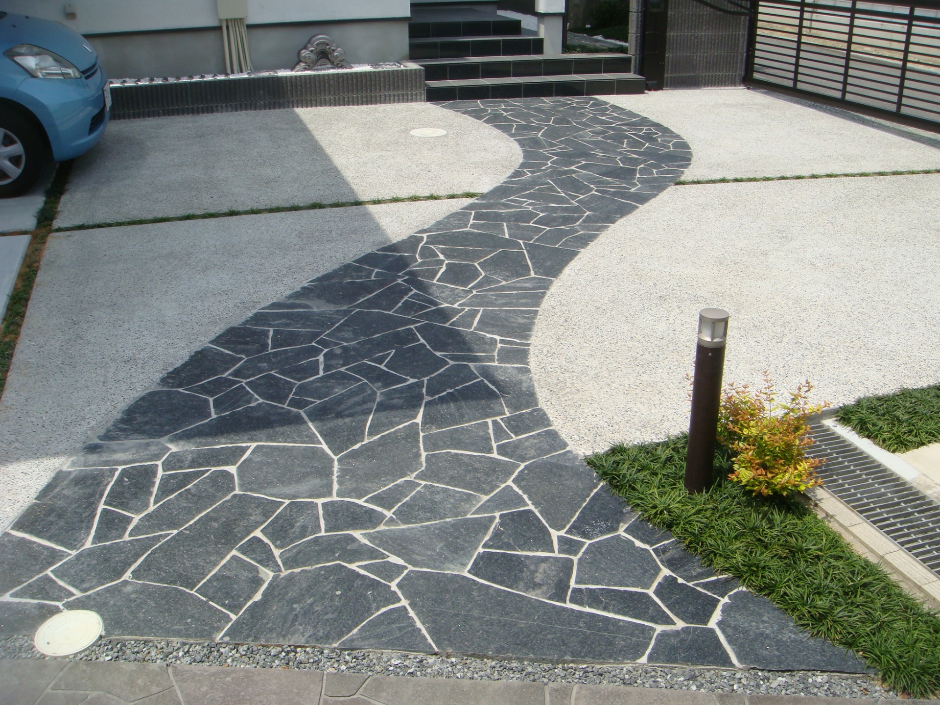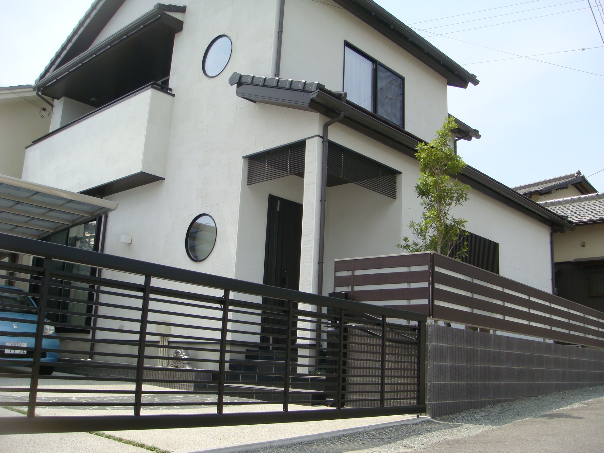施工実績 モダン和風なガレージ 太子町U様邸 モダン和風な外観の太子町U様邸。 全体に黒の金物を使い、シックな色目でまとめています。 カーポートにはシコク化成:マイポートワイド。 その存在感は圧巻で、シャープな印象を与えます。 黒の自然石乱張りアプローチ 柱が後ろに2本のすきっりとした印象のカーポート。 シコク化成:マイポートワイド