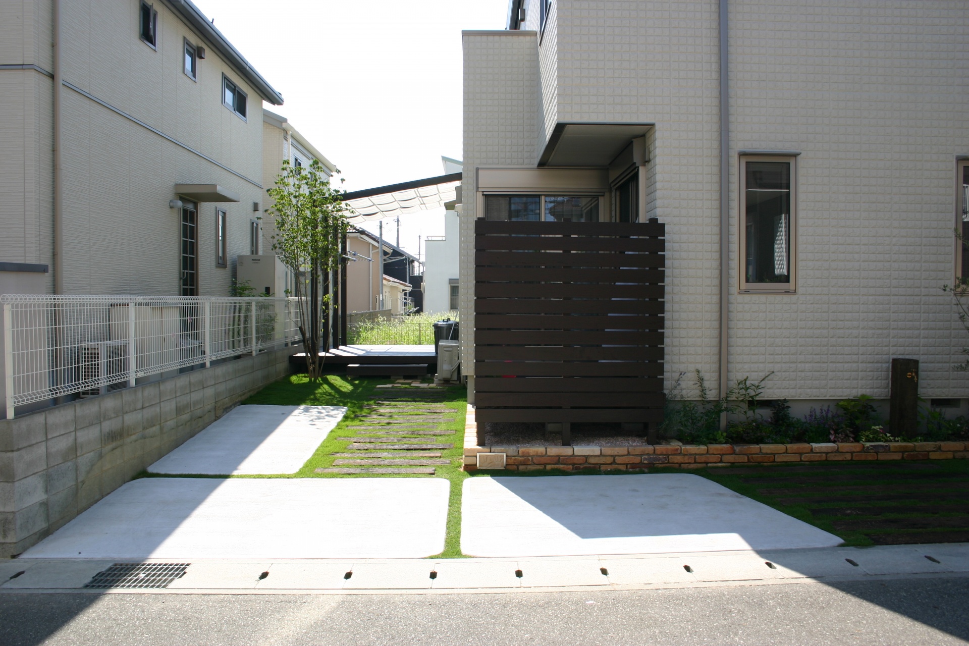 施工実績 庭へのアプローチを兼ねたガレージ|枕木+芝生 車庫スペースの奥がココマつデッキのある庭空間ですので、 そこへと続くイメージで芝生と枕木を組み合わせた、アプローチへとなります。 全体の完成写真はこちらです