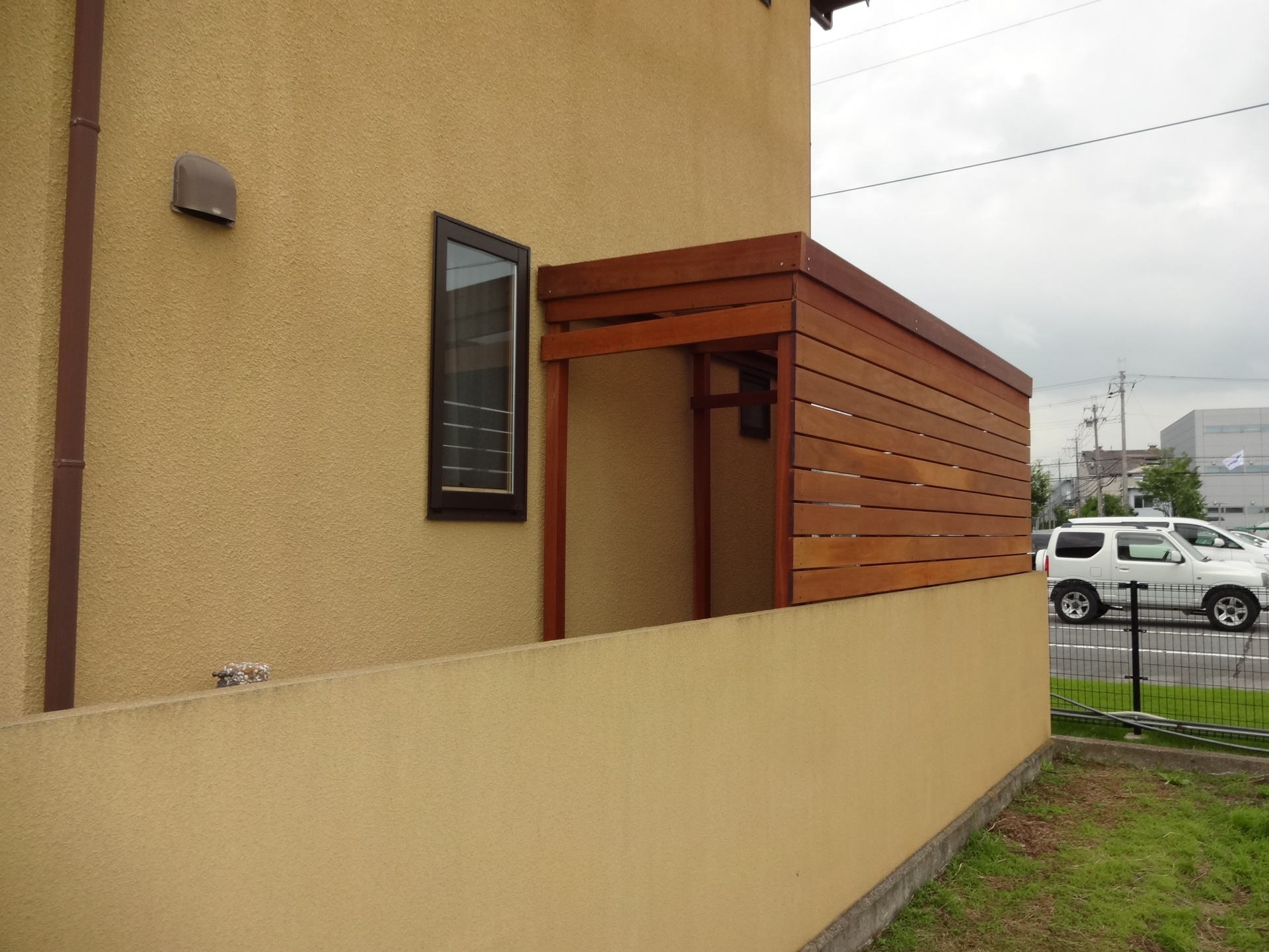 施工実績 温かみのある木製自転車置き場 加古川市T様邸 当社ホームページをご覧いただき ナチュラルな自転車置き場のご依頼を頂きました加古川市T様邸ハードウッド:ウリン材を使用しおしゃれで実用的な自転車置き場が完成しました横張りで近隣からの視線も遮断できると同時に横降りの雨も軽減できます明るさを取り込むのにマット調の波板ポリカ材を使用しています既存の煉瓦も土間に敷きいい雰囲気になりました before1 イメージパース 建物には直接取り付けず 独立で設置しています屋根回りの幕板も厚みを変えてどっしりとした重厚感を持たせています before2 外からの雨も軽減してくれる横張り板 before3 before4 既存のベンチ前に耐火煉瓦とカラークリートでテラススペースを既存のアプローチとも繋げてサイクルポートへと小道は続いていきます