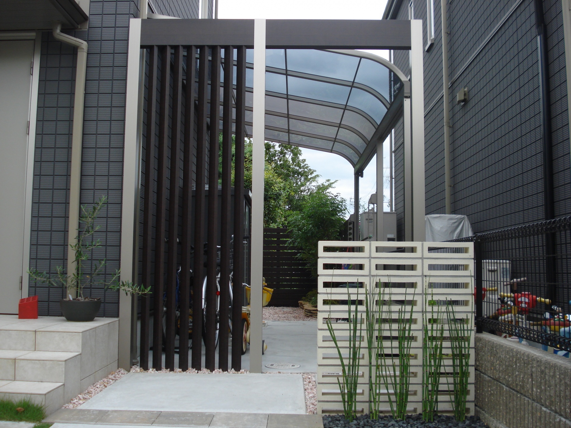 施工実績 デザイン格子で自転車置き場を目隠し|プラスG おしゃれにカッコよくしたいとのご要望にお応えして、木目調のデザイン格子で目隠ししています。 フレームで後ろのテラス屋根をさりげなく隠しました。 全体の完成写真はこちらです