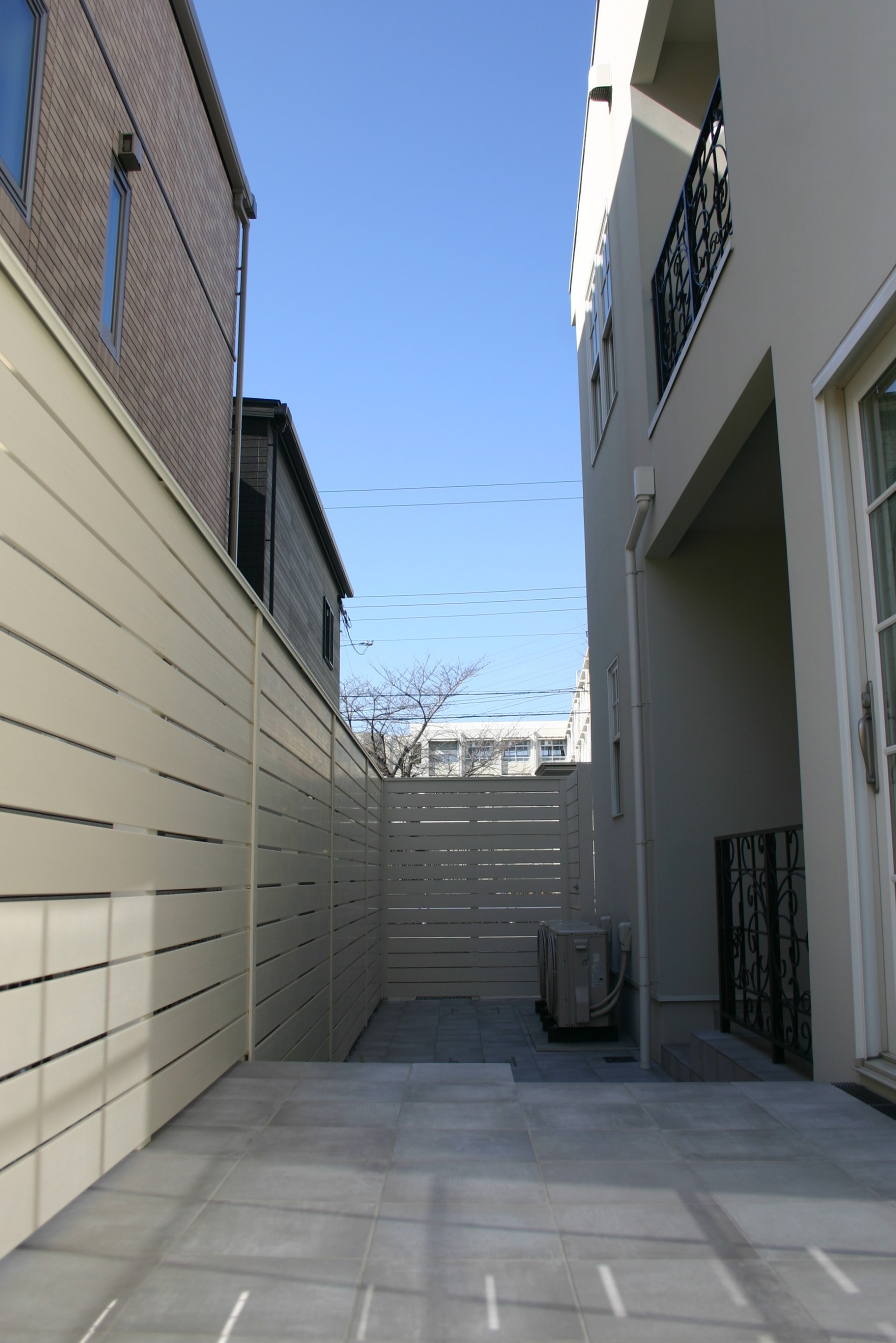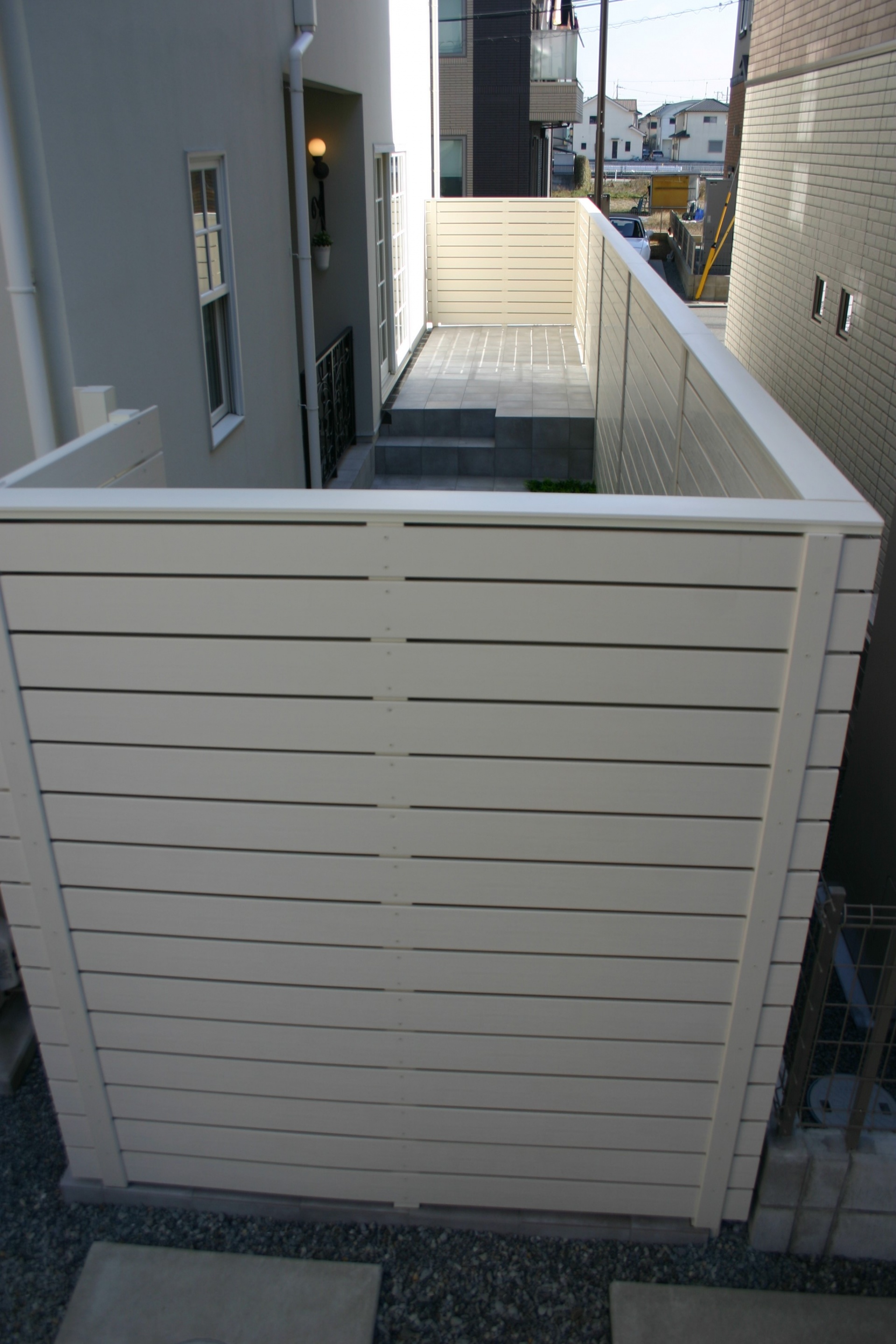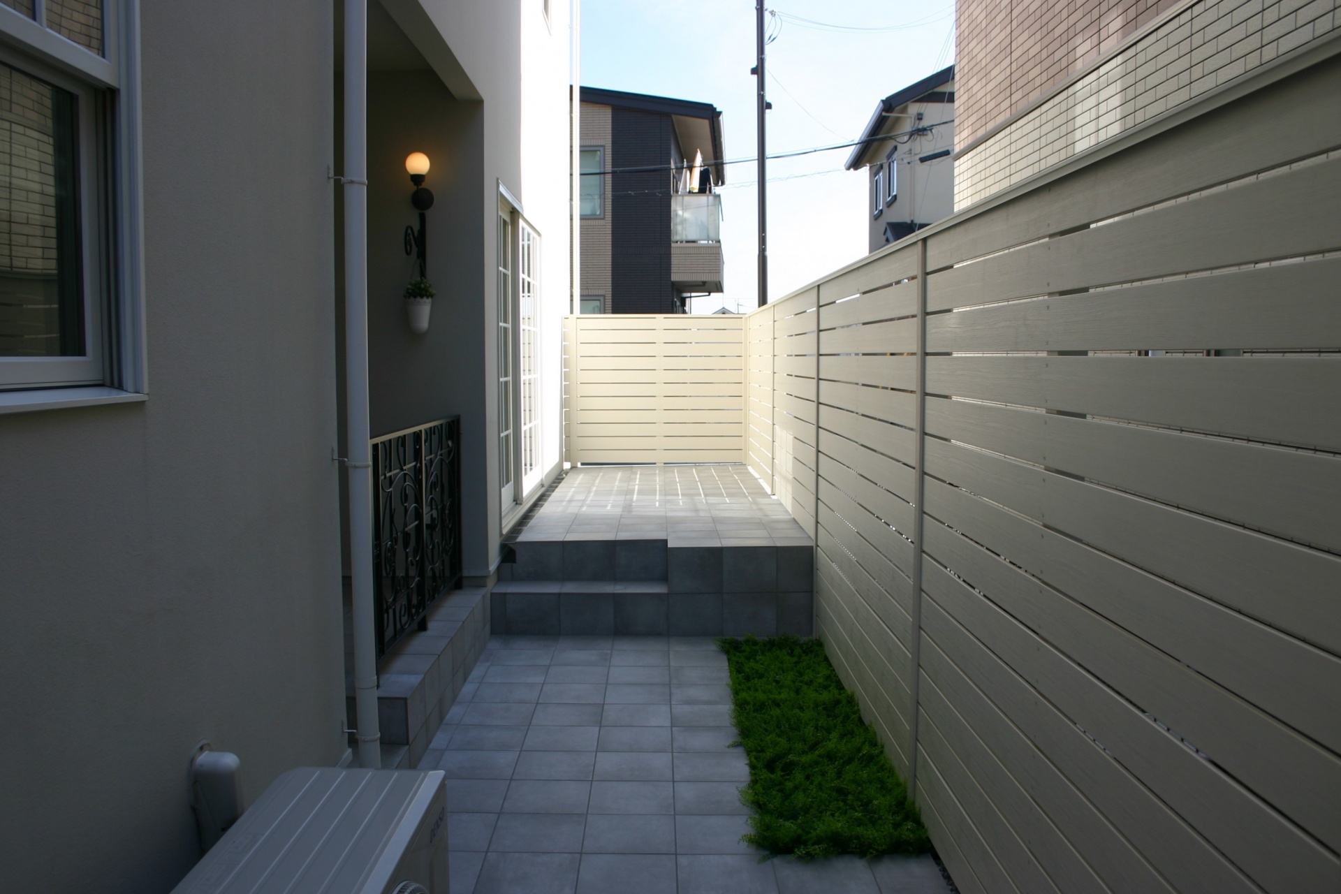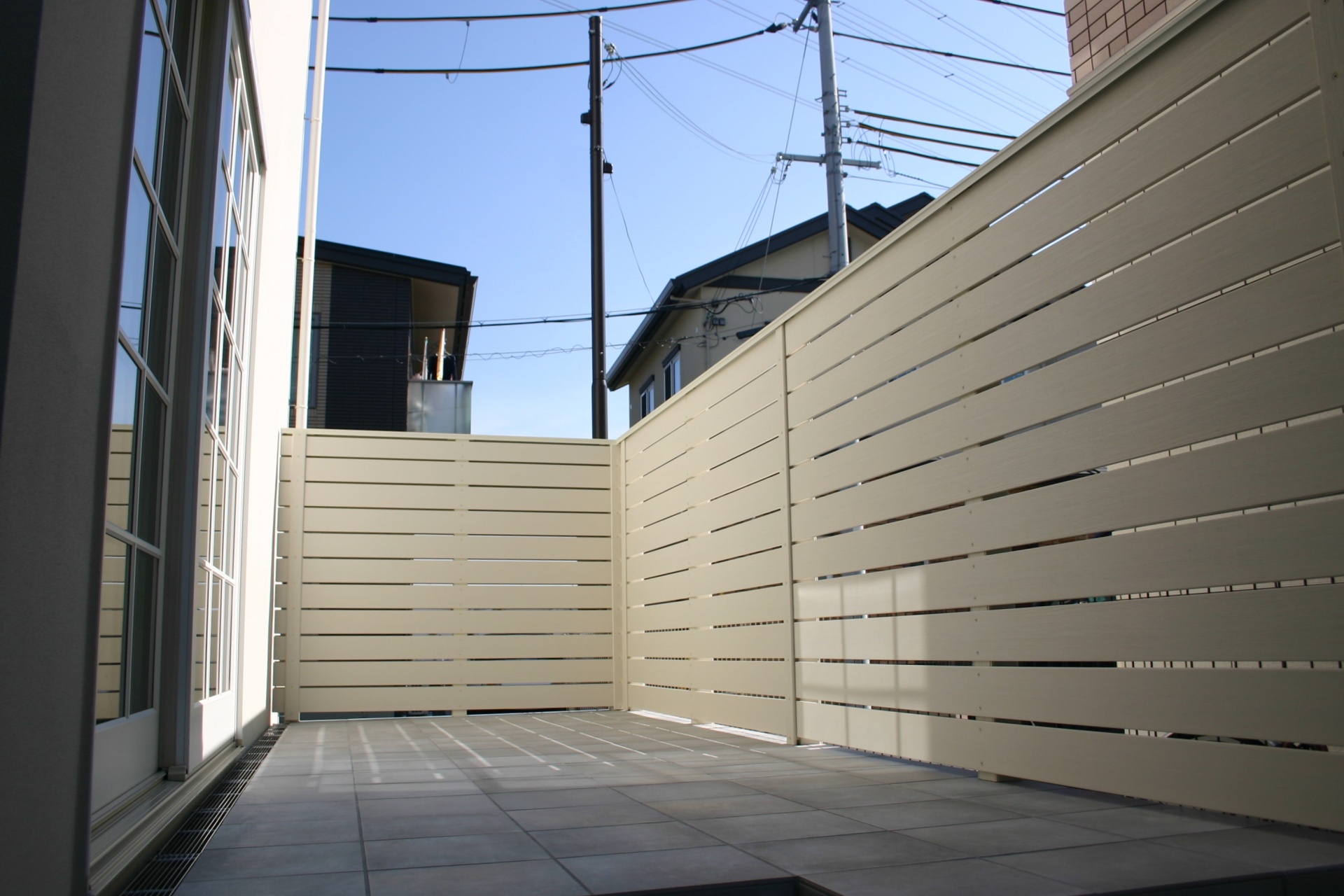 施工実績 建物と調和した拘りアルファウッドフェンス 姫路市LEMO様邸 芝生一面のオープンなお庭から、目隠しフェンスでプライベートを満喫できるお庭へと生まれ変わりました白で統一されたプライベートガーデンは圧迫感もなくフェンスの隙間から適度な風を取り込みます勝手口前のスペースには300□タイルとアイアンの手摺りが施工されていました同じタイルを使用しリビングからも繋がる一体感のあるおしゃれな空間となりました植栽スペースも確保し お好きなお花を植えて頂き眺めても楽しいお庭になっています 外から見たお庭は年中緑がいっぱいの天然芝生を張っていました4年前の完成写真はこちらからどうぞ4年前の施工途中はブログでご紹介しております 一部天然芝生を残しそれ以外は視線を遮る目隠しフェンスにてプライベート空間を作らせていただきました道路面から見える箇所はフェンスの板材を両面張りにして意匠性をだしています 髙いタイルテラスからは高さ約1m50cm2段下がった土間テラスからは約2mあります隣地からの視線を気にせずにお過ごしいただけます 3方向目隠しフェンスを立て一部 出入り用のフェンスと同じデザインで扉を付けました アルファウッドオリジナル門扉 閉 閉めている際は横張りフェンスとデザインを合わせ一体感があります アルファウッドオリジナル門扉 開内側に錠があり内開き仕様です 爽やかな風がリビングへと吹き込むます タイルテラスも建物掃出し窓より段差が無いように高さをあげています建物外壁と干渉しない様に溝をとりすき間を専用のグレーチング(テラスエッジ)で塞いでいます水勾配も建物側にとっているため建物とのすき間が水路にもなります 建物際にグレーチング(テラスエッジ)ステンレス製のシンプルなデザインなのでこちらのタイルの色目とも良く合いますね 基礎から上の水切りや建物に直接タイルを当てることはできないのですき間を開けて、それを塞ぐためのグレーチング LEMO様より2期工事のご依頼としてお声がけいただきました天然芝はお手入れの大変さもあり、隣地に家が建ったことも踏まえてプライベートな空間を作りたいとのご要望でした当初はタイルテラスに木製のパーゴラに植物を絡ませて緑を取り入れた目隠しも検討されていました木製パーゴラだと塗装等のメンテナンスに手間や時間がかかり植物を絡ませると塗装も出来なくなりますそこでご提案させて頂いたのがディーズガーデンのアルファウッドを使用した横張りのフェンスでの目隠しでした経年変化にも強く耐久性もあり、色も建物と調和するアイボリー色がピッタリでした施工中も何度も現地で打ち合わせを重ね進めさせていただきましたこちらのミスでご迷惑をお掛けしましたが寛大な心でご対応してくだいました事 感謝しております今後とも 株式会社LEMO様が益々のご発展をされることお祈りしております