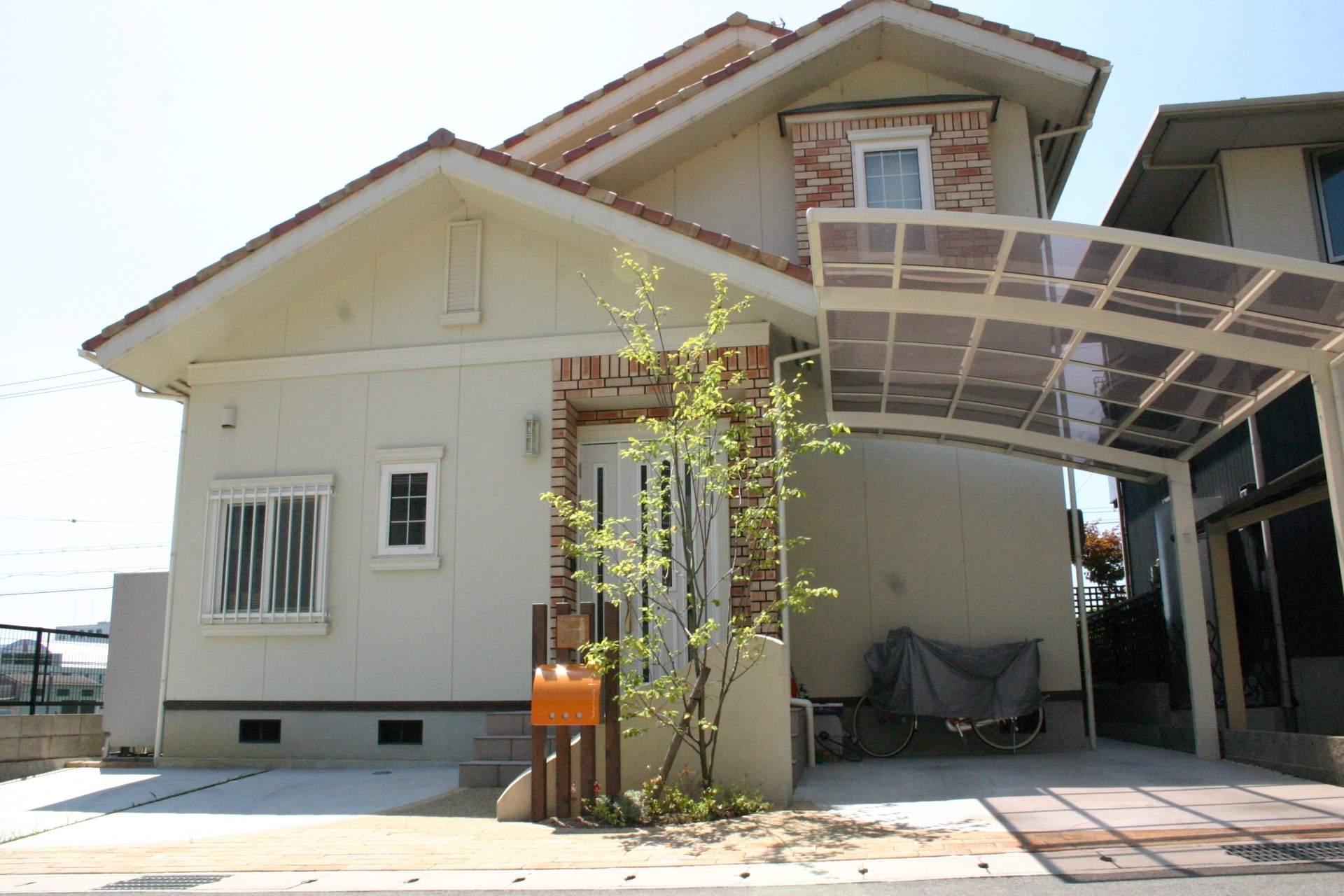 施工実績 姫路市新築外構 おしゃれなウッドアーチのある門回り 高低差のあるU様邸。レンガステップにウッドアーチを組み合わせましたアプローチはシンプルに300角の平板敷きでラインのアクセントをデザインしました。 ポストはレッドの輸入ポストをセレクト。ステップ上部にウッドのスリットフェンスをデザイン。