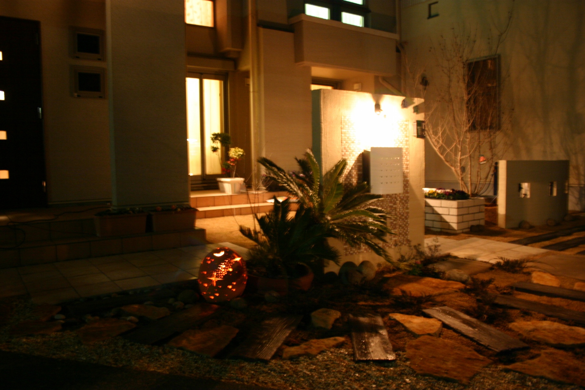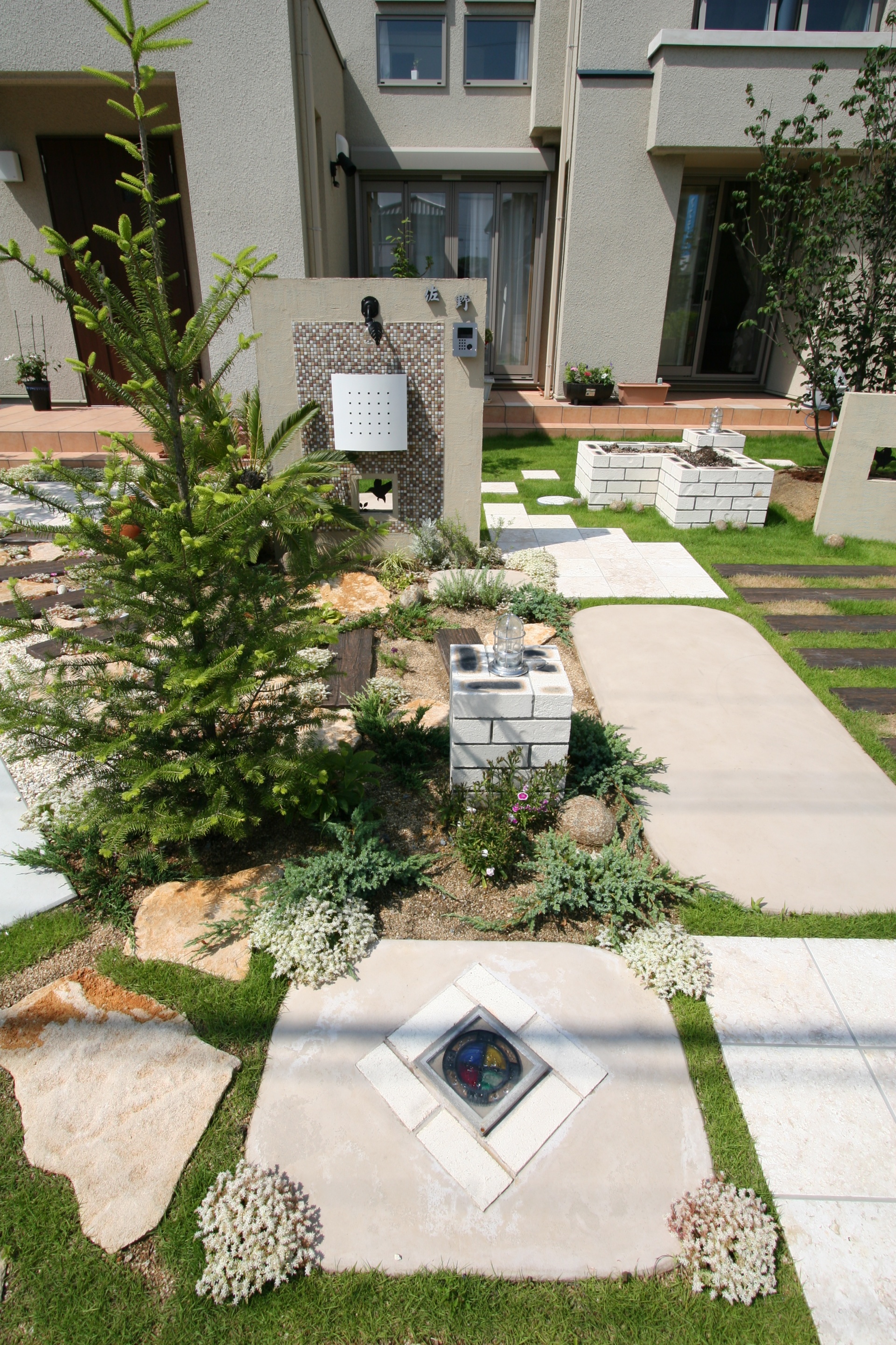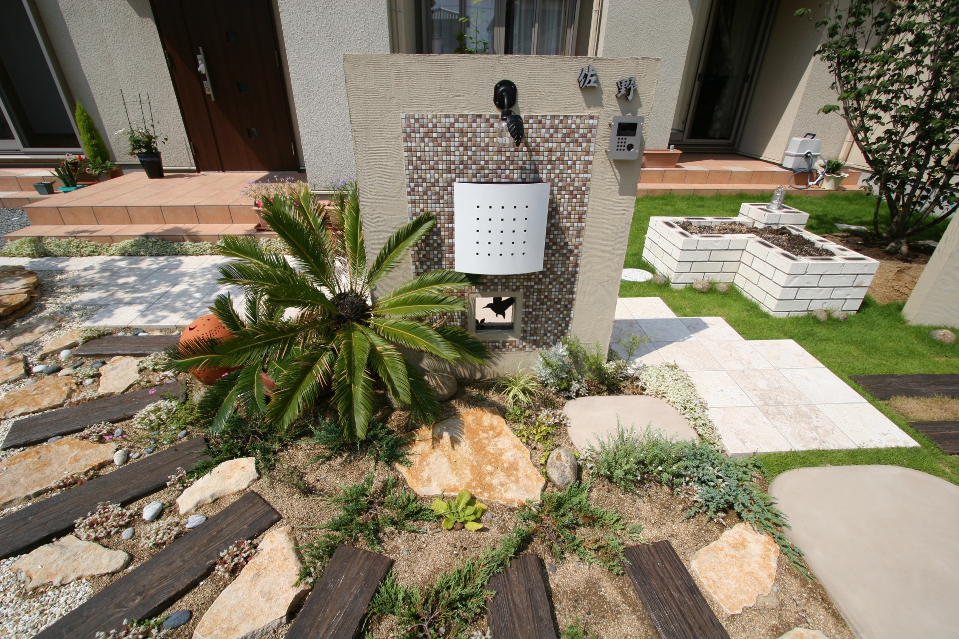 施工実績 姫路市新築外構 ソテツをアクセントにアジアンモダンなお庭 車がたくさん駐車できるようにとのご要望で、駐車スペースの確保を第一にしましたが、 コンクリートや洗出しでしっかり固めた部分と、 自然石やコンクリート製の枕木でラフな感じにした部分を造り(駐車も大丈夫です)、 それらが自然に交わる様な感じにし、その間を玄関まで通じる大理石を敷いたアプローチガあります。 玄関脇に以前からあったソテツも一役買うことになりました。 洗い出しとコンクリートの土間デザイン モザイクタイルを張った門柱 遊び心があるアプローチ周り 庭要素のあるサブパーキングスペース