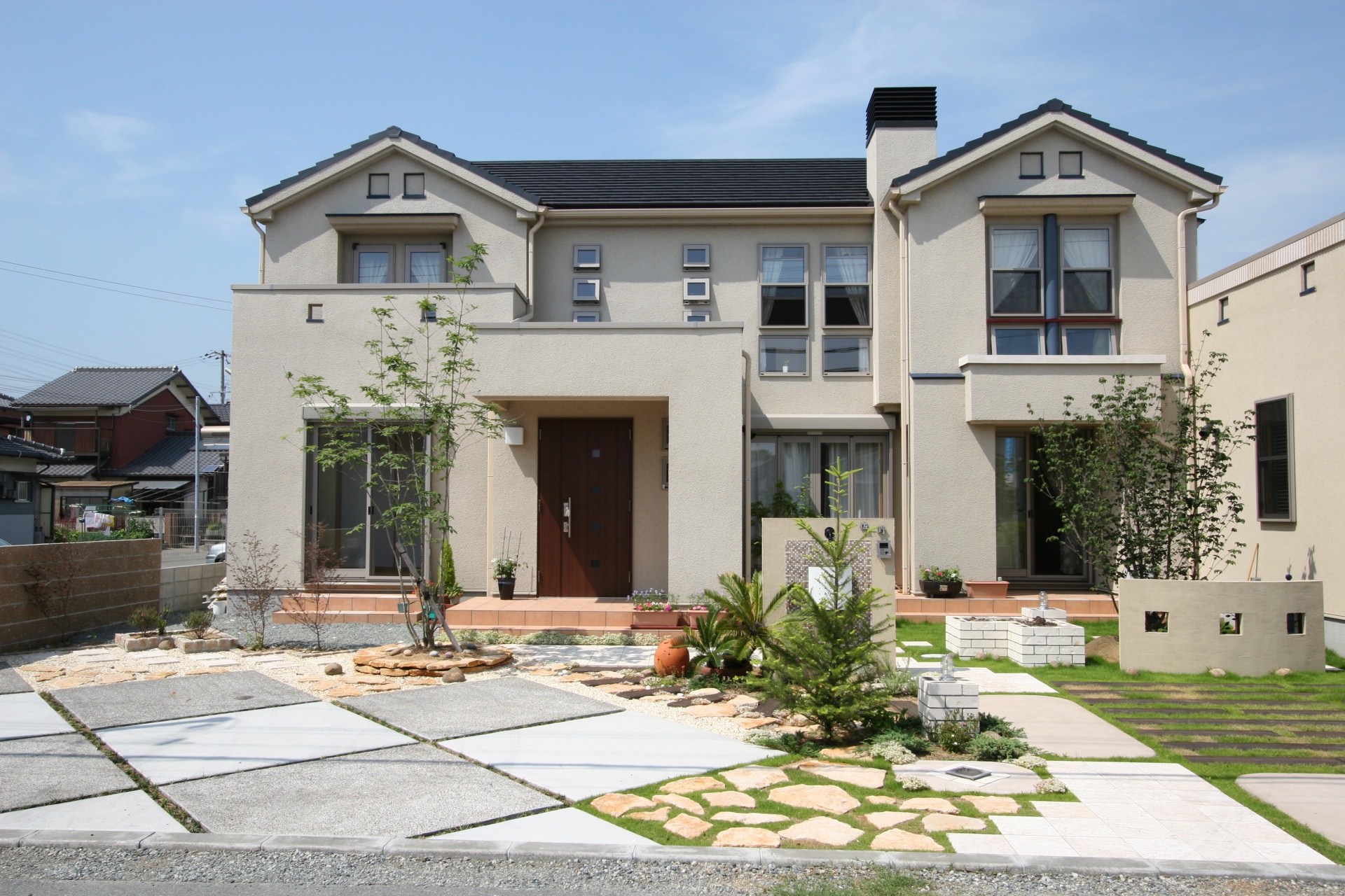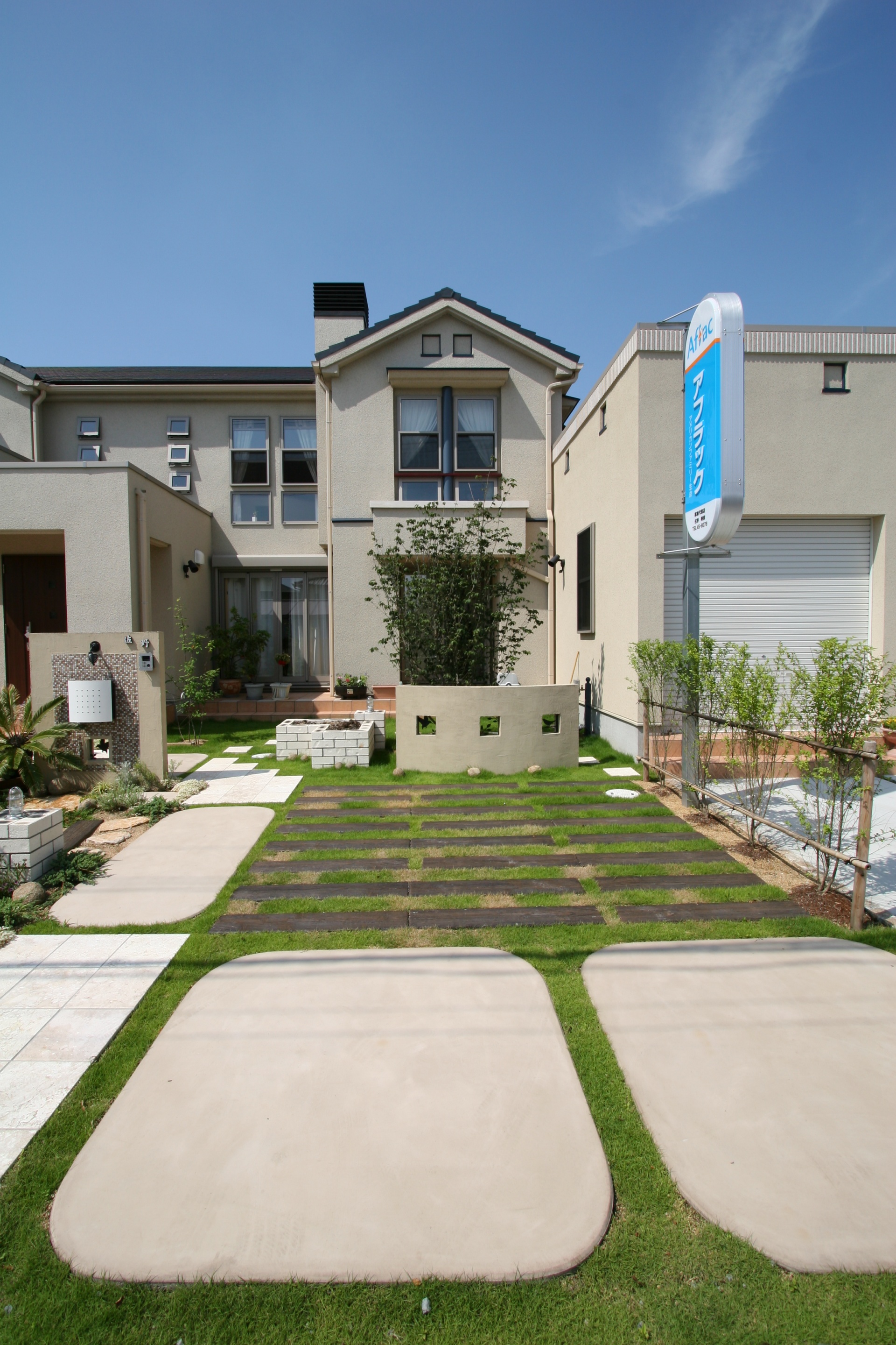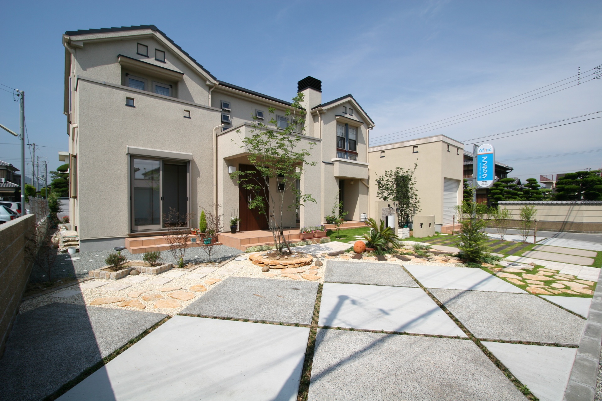 施工実績 姫路市新築外構 ソテツをアクセントにアジアンモダンなお庭 車がたくさん駐車できるようにとのご要望で、駐車スペースの確保を第一にしましたが、 コンクリートや洗出しでしっかり固めた部分と、 自然石やコンクリート製の枕木でラフな感じにした部分を造り(駐車も大丈夫です)、 それらが自然に交わる様な感じにし、その間を玄関まで通じる大理石を敷いたアプローチガあります。 玄関脇に以前からあったソテツも一役買うことになりました。 洗い出しとコンクリートの土間デザイン モザイクタイルを張った門柱 遊び心があるアプローチ周り 庭要素のあるサブパーキングスペース