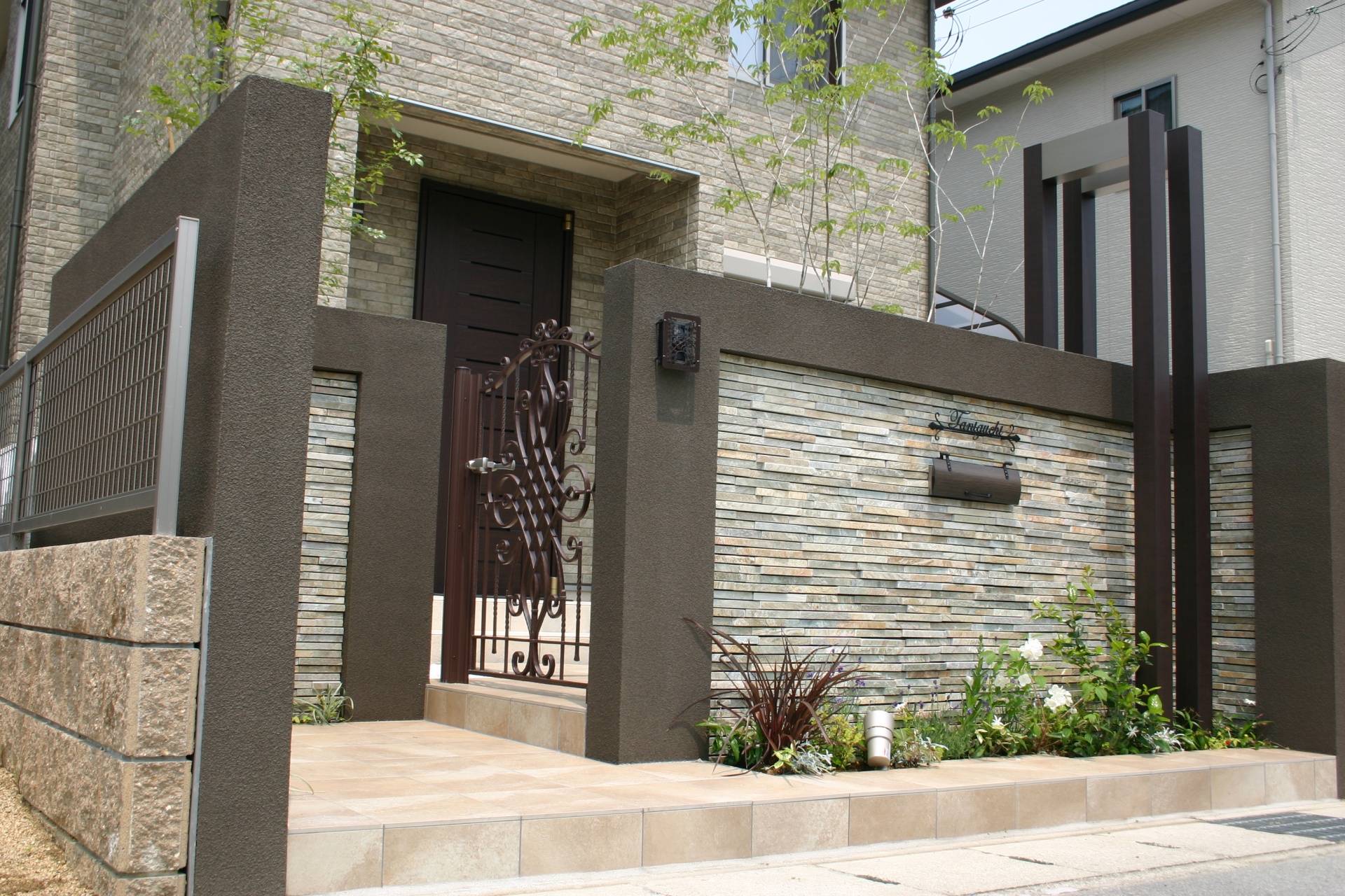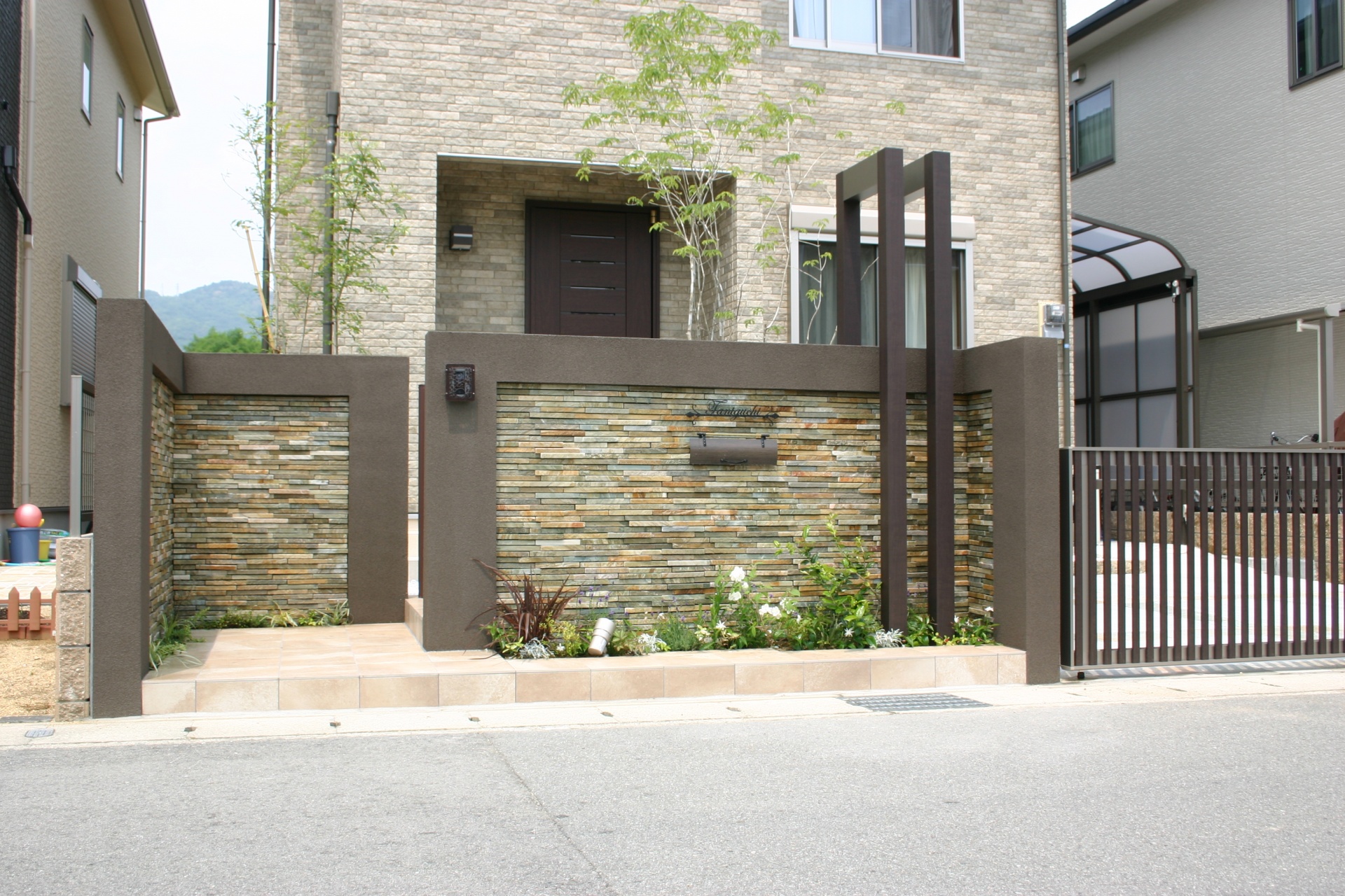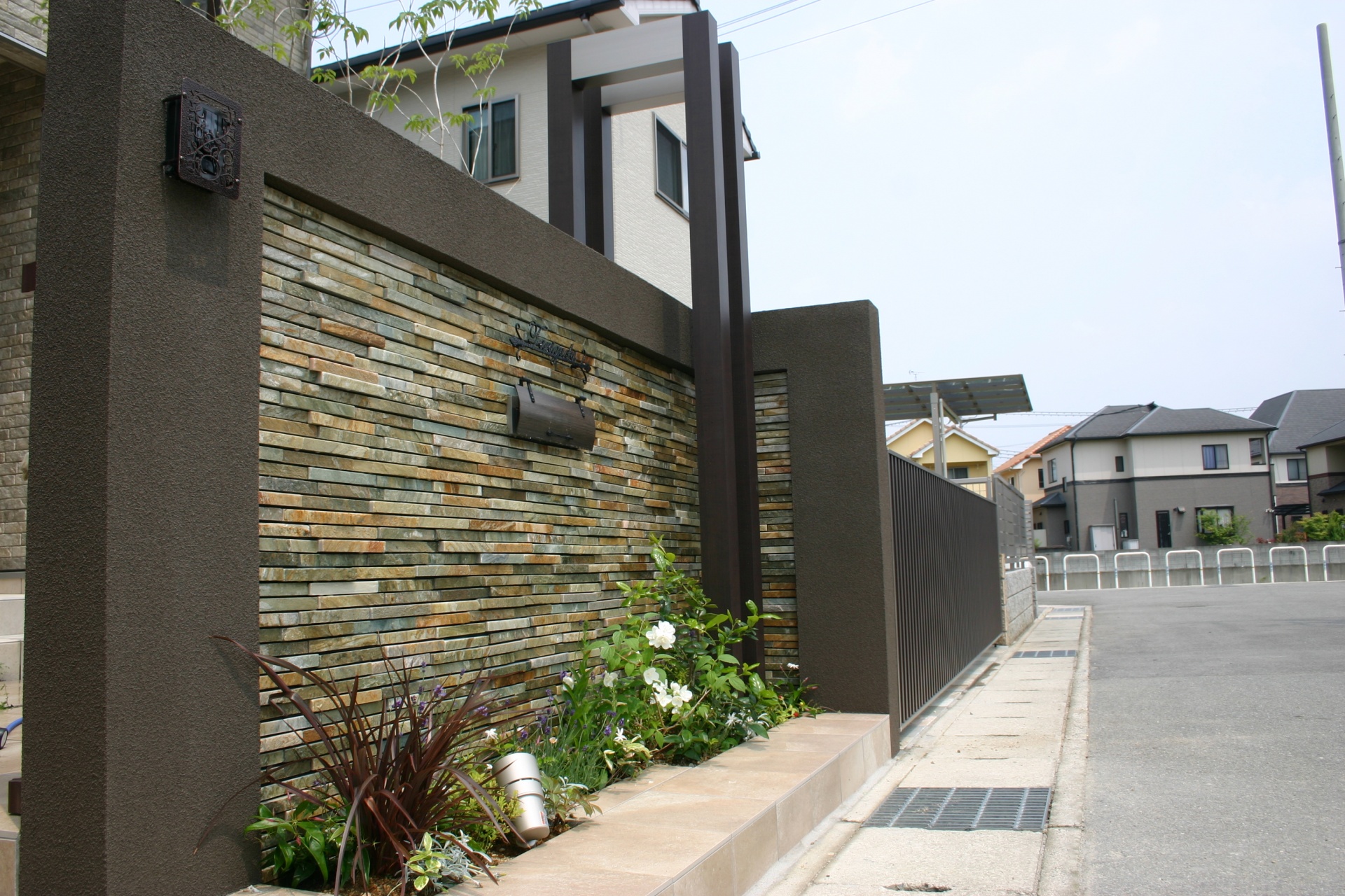施工実績 姫路市新築外構 ダークフレームにナチュラルアクセントの門回り 全景 玄関扉と色調を合わせたプラスGのアーチが門周りに高さのインパクトを与えます。 深いニッチ加工のダークフレームに石英石のバー状の自然石で門柱周りを仕上げました。折り重なる水平ラインと出入りのある割肌面の陰影が美しく門周りを演出してくれます。 やさしいべージュ系のタイルと自然石の間に、彩かな植栽がグリーンのラインを演出します。 奥行き感を演出するため、門扉は正面からは見せないデザイン設計にし、L字型に曲げることにより、強度上クリアした高さのある門周りに仕上げました。 シンボルの足元に咲く植栽達が、お客様を出迎えてくれます。 アッパーライトによる光の演出。スティック状の自然石の陰影を映しだします。