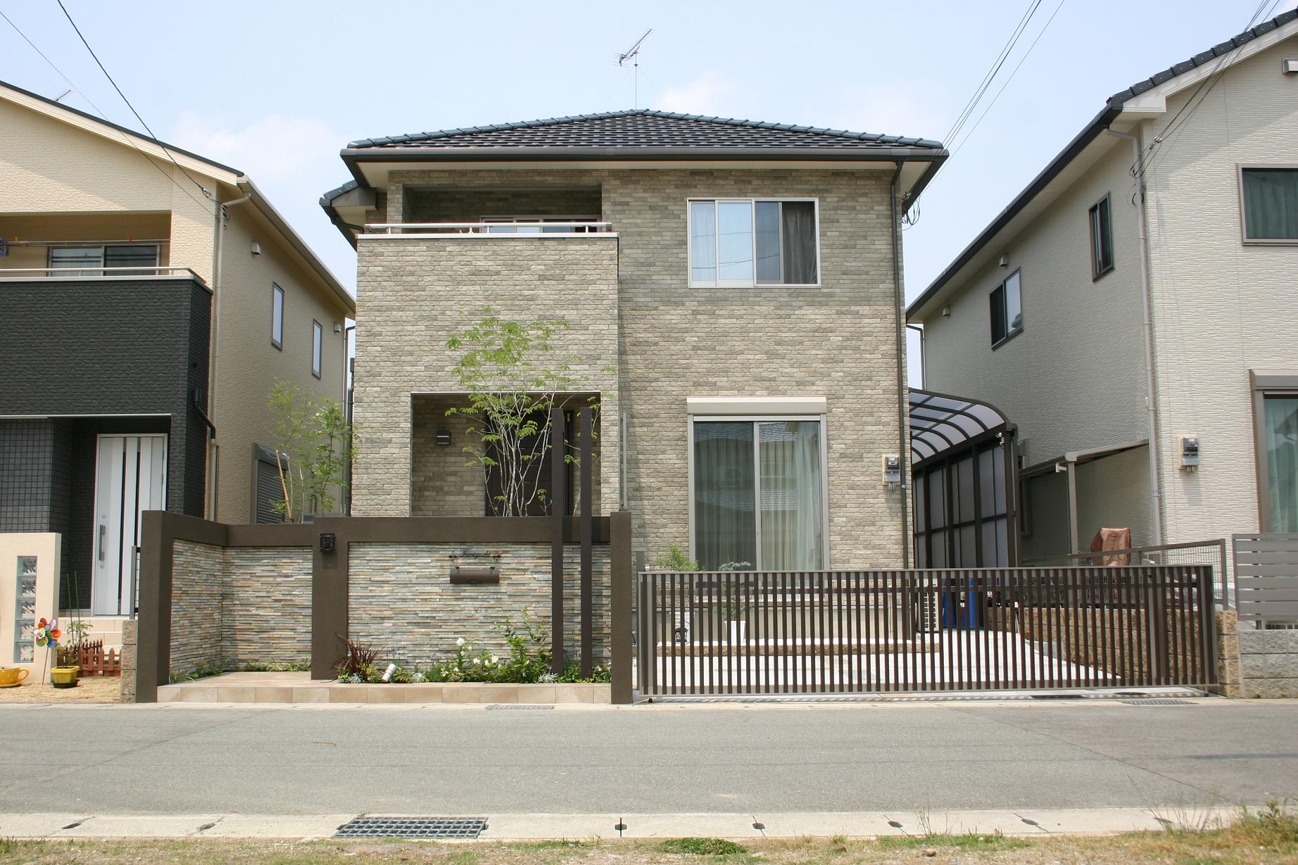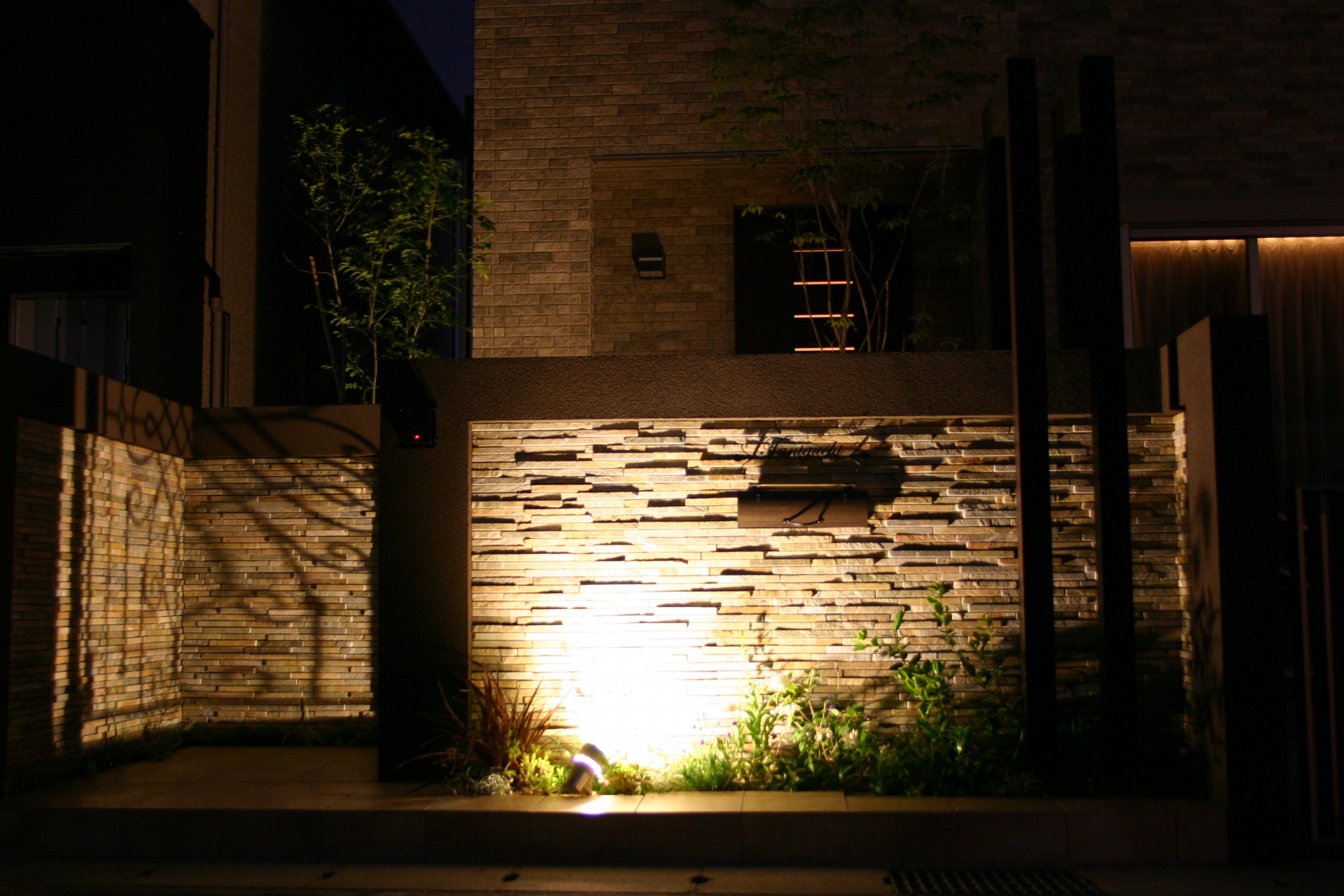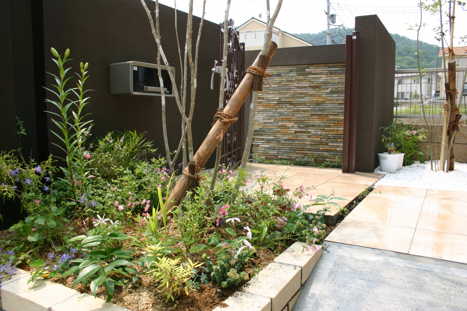 施工実績 姫路市新築外構 ダークフレームにナチュラルアクセントの門回り 全景 玄関扉と色調を合わせたプラスGのアーチが門周りに高さのインパクトを与えます。 深いニッチ加工のダークフレームに石英石のバー状の自然石で門柱周りを仕上げました。折り重なる水平ラインと出入りのある割肌面の陰影が美しく門周りを演出してくれます。 やさしいべージュ系のタイルと自然石の間に、彩かな植栽がグリーンのラインを演出します。 奥行き感を演出するため、門扉は正面からは見せないデザイン設計にし、L字型に曲げることにより、強度上クリアした高さのある門周りに仕上げました。 シンボルの足元に咲く植栽達が、お客様を出迎えてくれます。 アッパーライトによる光の演出。スティック状の自然石の陰影を映しだします。