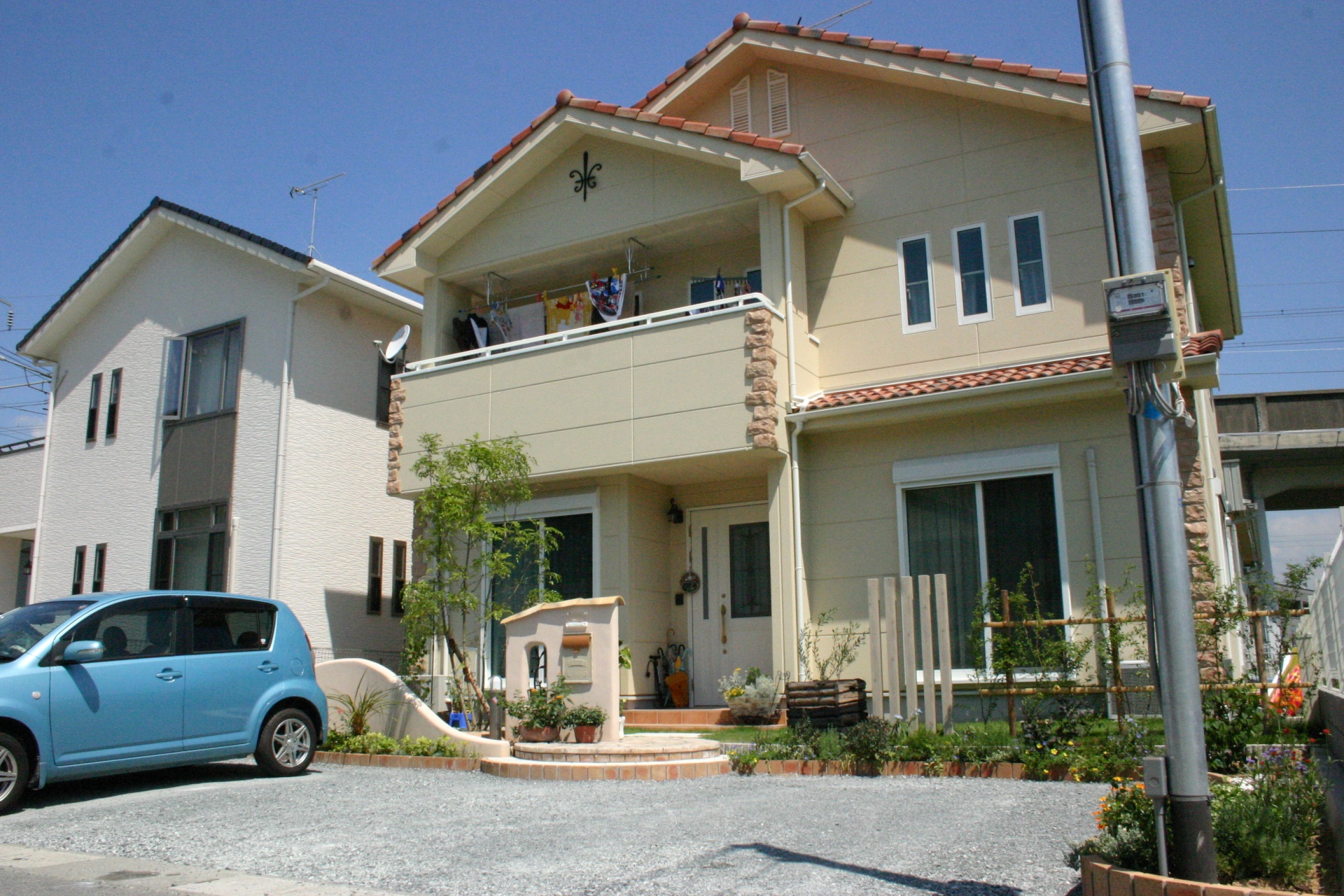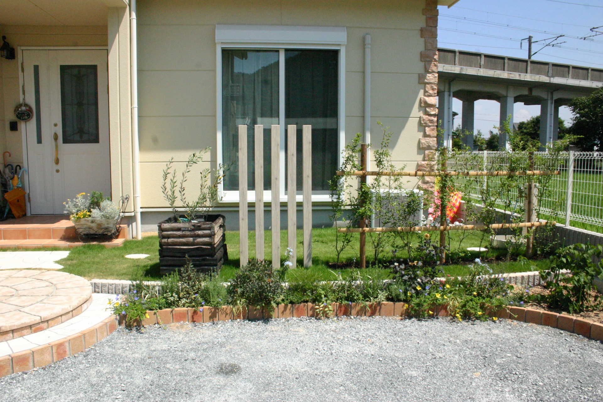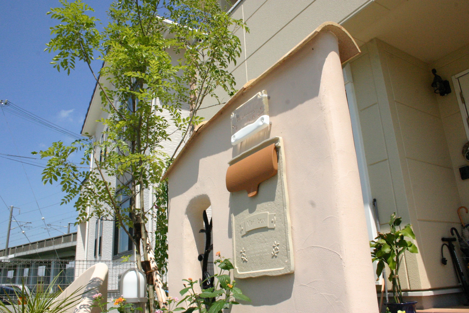施工実績 たつの市新築外構 アール曲線のステップで門回りをコーディネイト プロバンス風のお宅のたつの市M様邸。柔らかい色合いの門柱にディーズガーデンの門柱設備でトータルコーディネイトしました。正面玄関のアイストップにもなっているお客様お気に入りの門柱が仕上がりました。 シンボルツリーにはシマトネリコを植樹。R壁のFBOXには宿根草ベースの植栽スペースに構成。 プロバンス風のエクステリアに仕上がりました。 門柱設備はディーズガーデンで統一。 ステップは久保田バイブリーサークルと自然石乱型の組み合わせです。 ポイントのホワイトウッド(タカショーアートウッド)にて少し目隠しに。