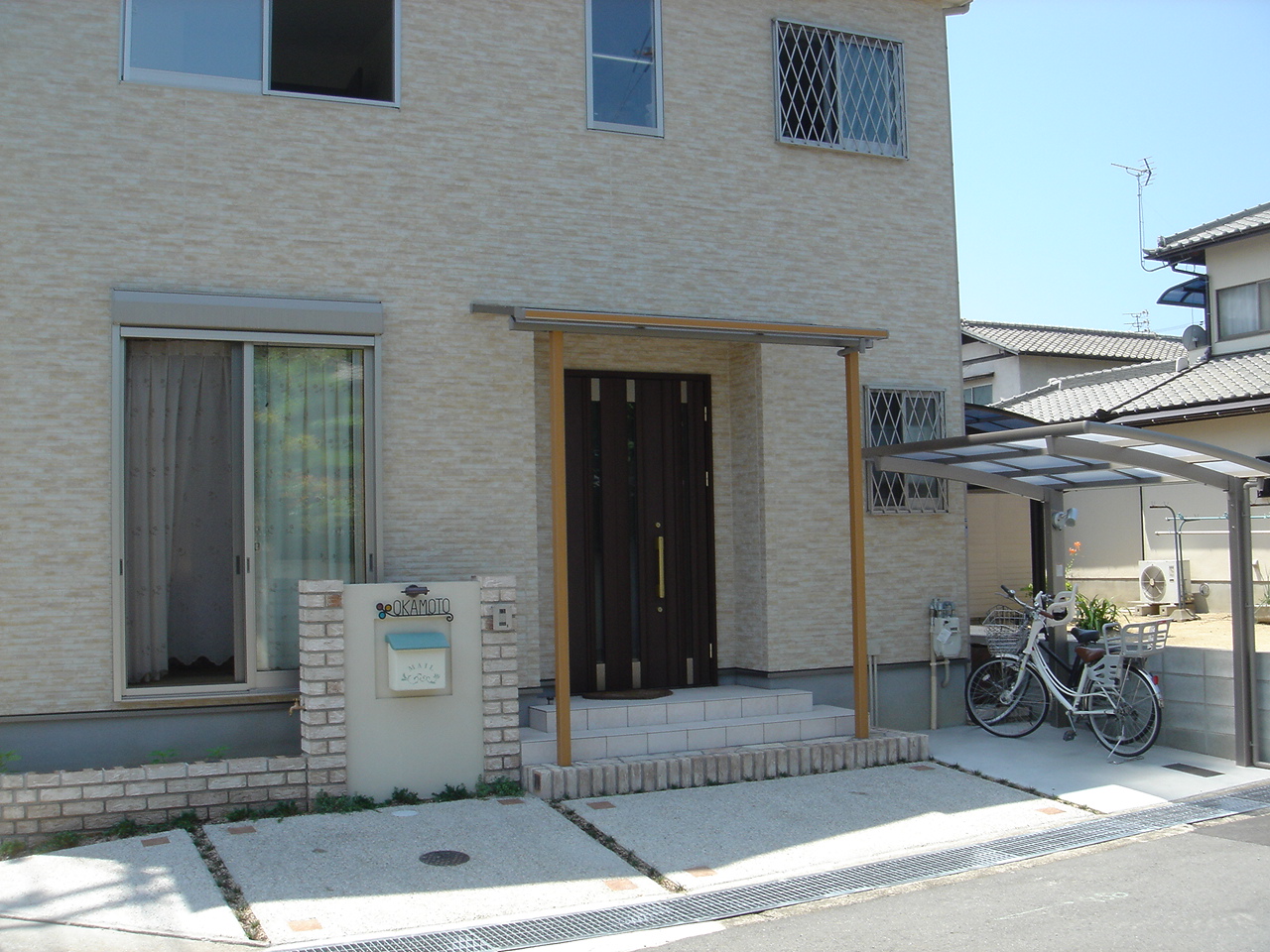 施工実績 姫路市新築外構 レンガと塗り壁門柱にディーズポスト 洋風のホワイトの外壁のO様邸。玄関のポーチにウッドテラス、門柱にはホワイトレンガにスカイブルーのディーズポストを組み合わせました。トータルで明るいイメージに演出しました。 玄関サイドには自転車置き場を配置。玄関前に縦列で駐車することができます。 レトロランプとアイアンサインの組み合わせ。インターホンはステンレスカバーにてデザイン。 門柱全景です。ウッドテラスは使い勝手もよくデザイン性にもグッドです。