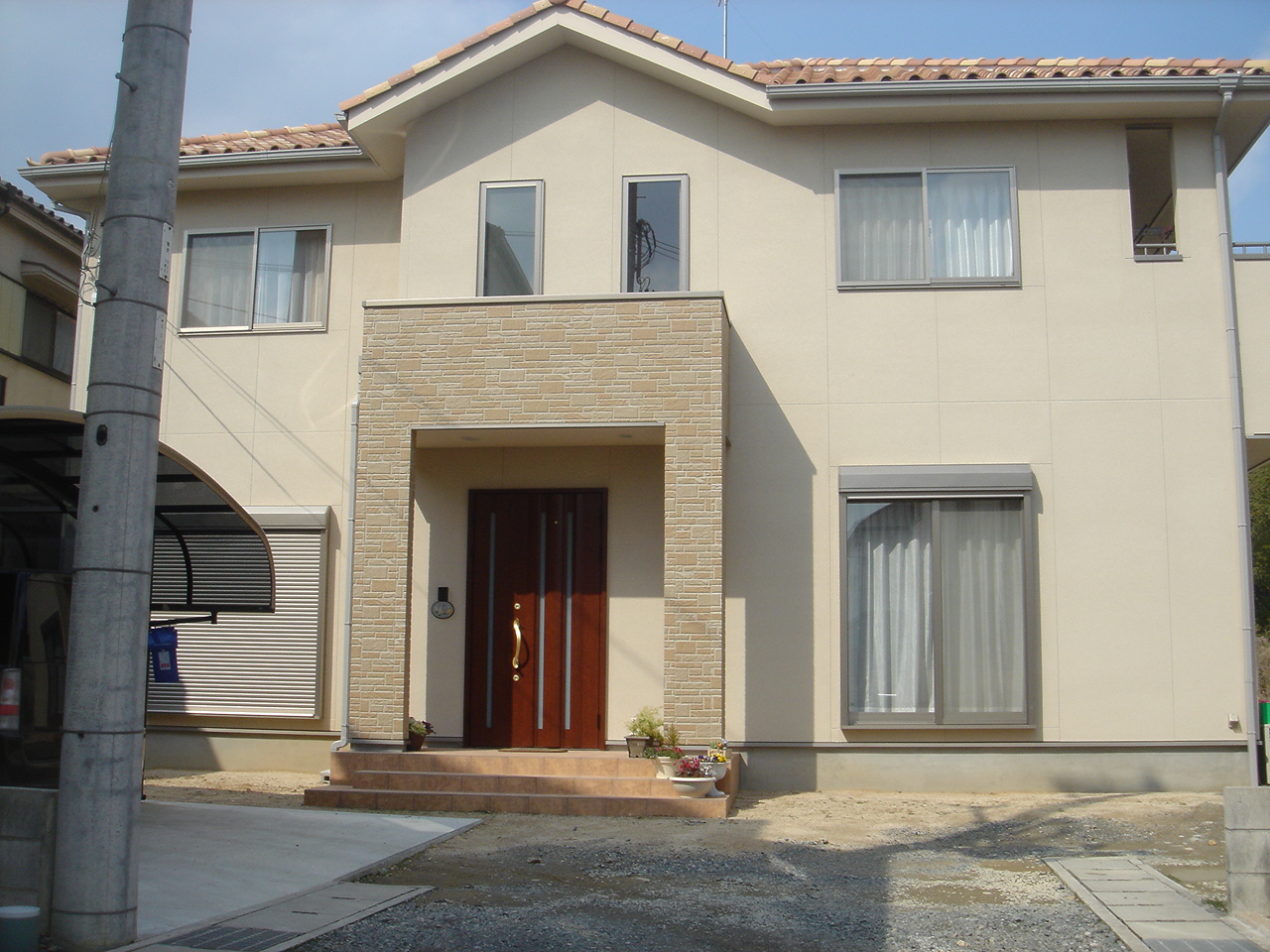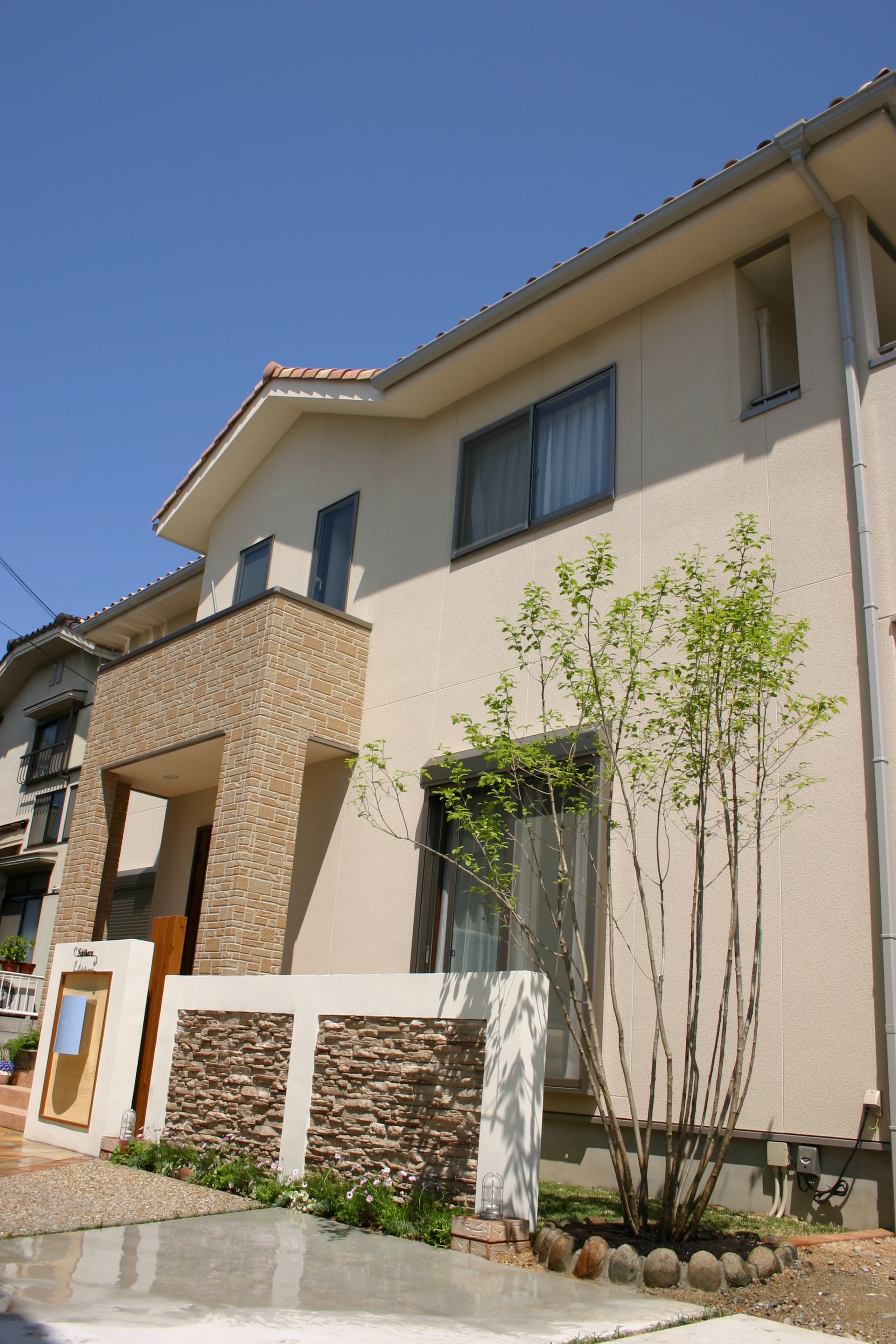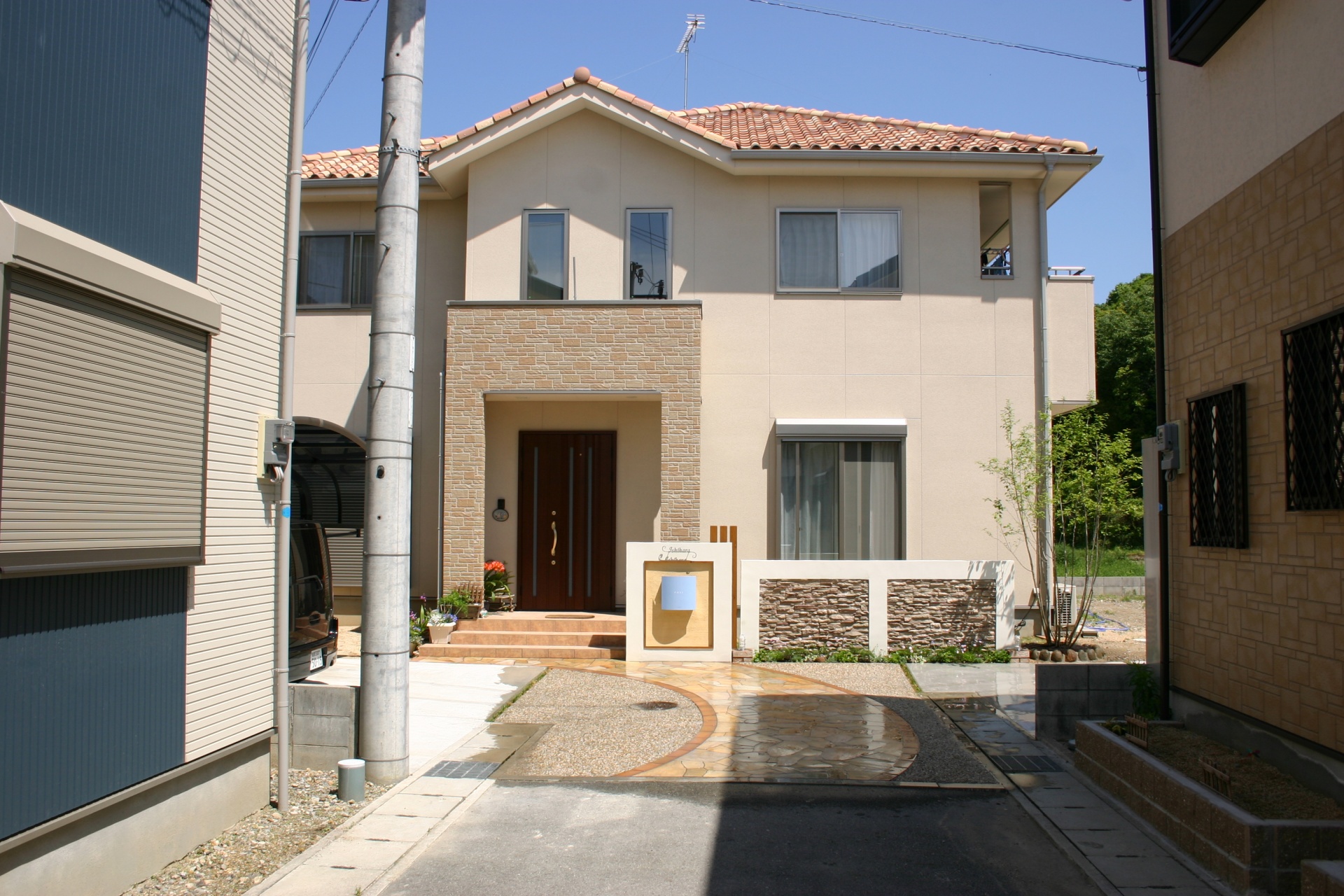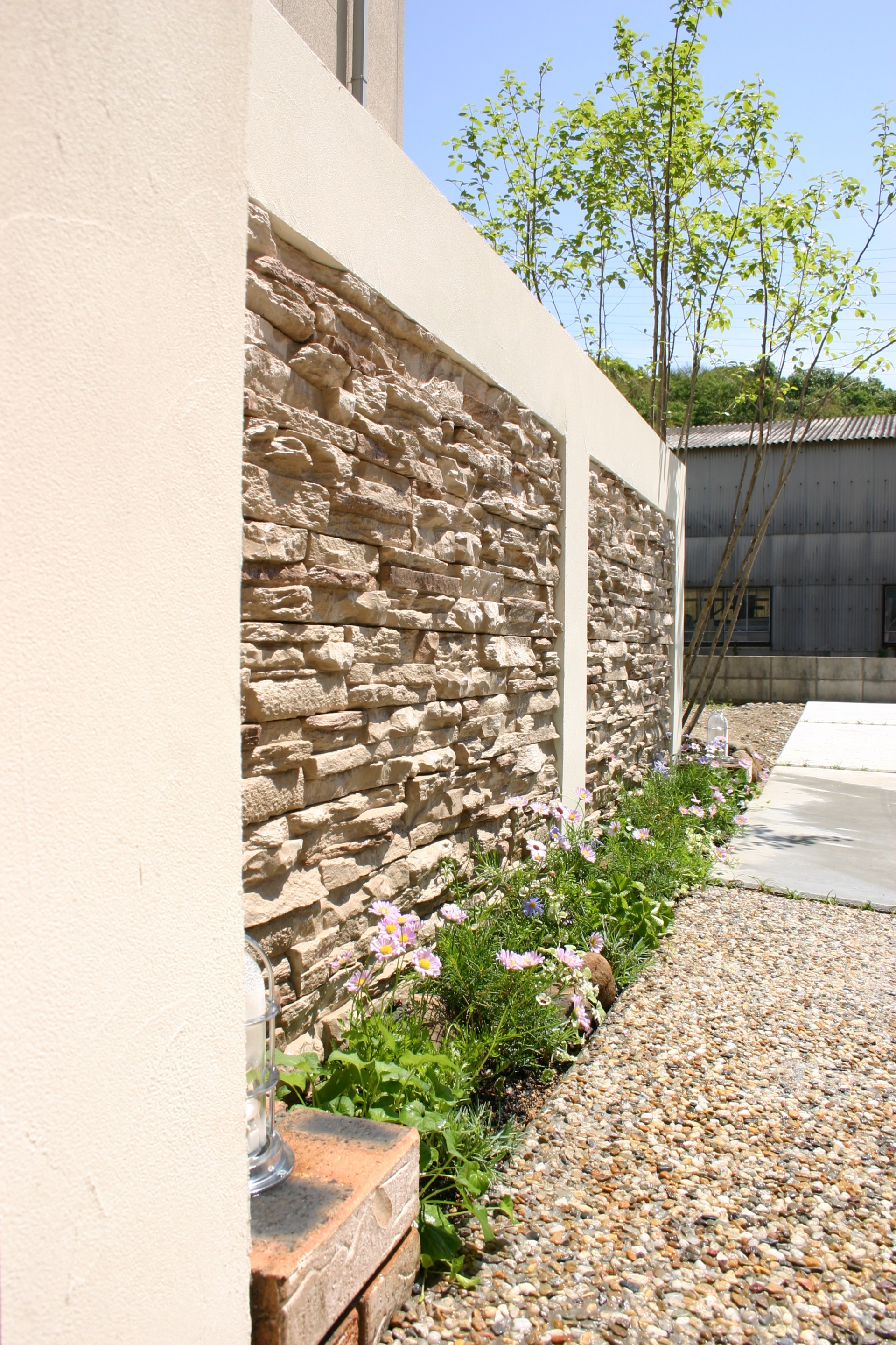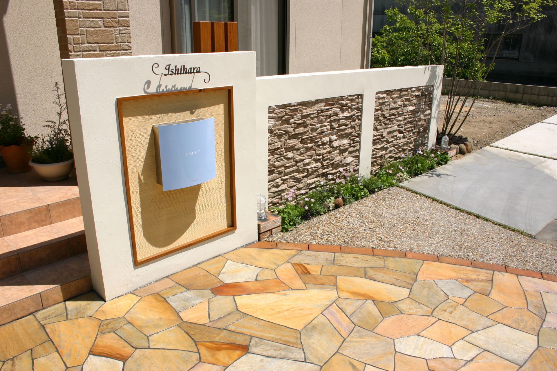 施工実績 たつの市新築外構 額縁の中に水色デザインポスト 住宅地を入って正面奥にオレンジの屋根瓦が印象的なたつの市I様邸 車の導線も考慮し玄関ポーチ前に門柱を設け、リビング前にはインパクトのある石目調タイルを張った意匠壁で見る人の目を引きつけます。 門柱のデザインもひと工夫しています。 木目調アルミ材でニッチ部分を縁取り、へこんだ部分の壁の色を変え水色のポストを使用することで 遠くから見ても目を引き付ける、建物と調和されたデザインとなっています。 遠くから見ても門柱、意匠壁が良く映えます。 before アプローチの自然石乱張りの色目もイエロー系で門周りと統一しています。 石積み調タイルを張った意匠壁の前に、少しの植栽スペースを設ける事でより意匠壁が引き立ちます。 爽やかなイメージを持つ株立ちのアオハダ。