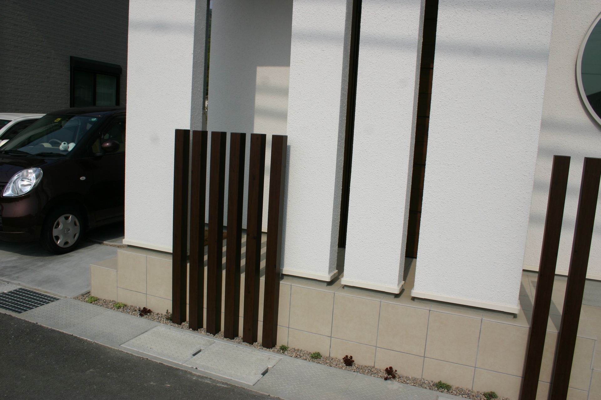 施工実績 たつの市新築外構 白の塗り壁門柱にガラスブロックの光 白い外壁のたつの市N様邸 門柱部ののみ施工されておられましたが、アプローチ・塀は手付かずのままでした。シンプルで冷たいイメージをとのご希望で、ホワイトの塀にストライプのガラスブロックを組み合わせました。ホワイトレンガのFBOXには黒の那智石を敷き詰めモノトーン調にデザインしました。 シマトネリコの足元にはブラックの那智石で引き締めます。 アートウッド角柱のスリットフェンス。 ホワイトを基調とし、ガラスブロックで光を楽しみます。