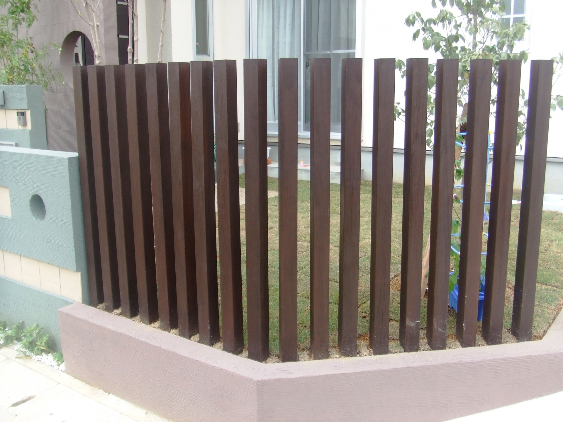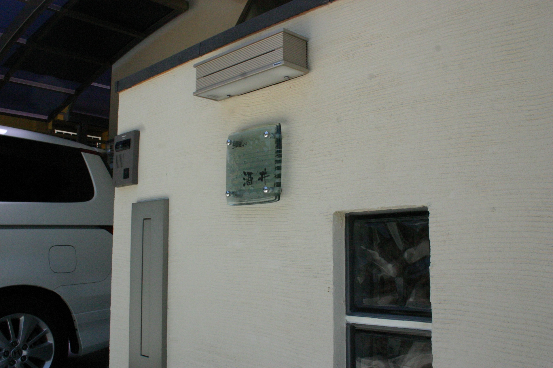 施工実績 姫路市新築外構 塗り壁門柱にガラスブロックデザイン 玄関にウッドを使用したS様邸。明るい色の塗壁門柱にカラーのガラスブロックを入れてみました。FIX窓前には室内からも見えるシマトネリコを植樹、同色の木製スリットフェンスがポイントです。 おとなしい色合いのカラーガラスブロック。 表札はガラスをセレクト