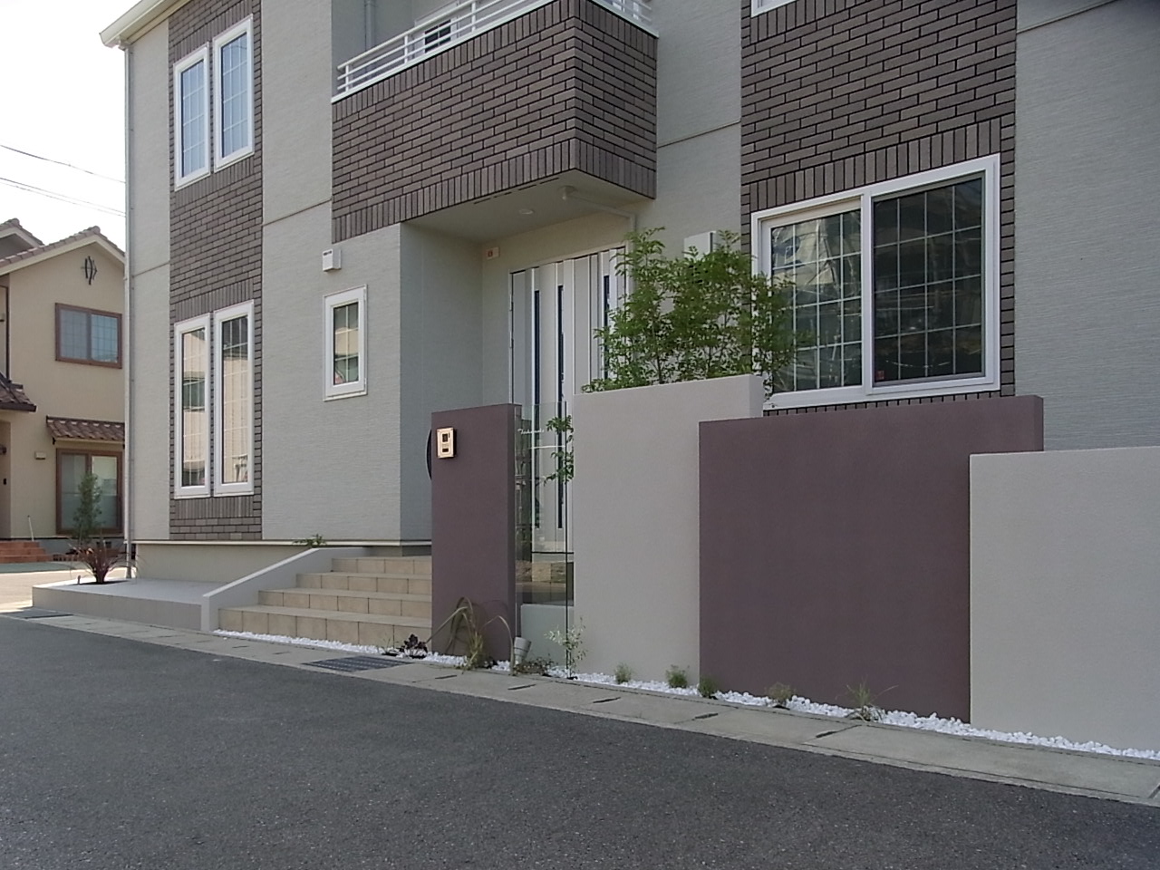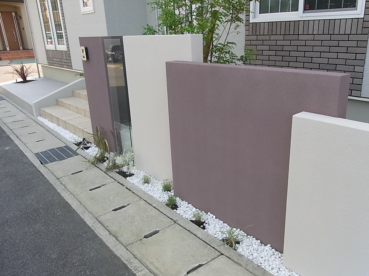 施工実績 福崎町新築外構 植栽のグリーンをバックに浮かぶホワイトネーム ホワイトに淡い小豆色タイルがポイントの福崎町T様邸。玄関サイドに同系のツートンでエクステリアデザインしました。グリーンをバックにプレーンのガラスサインが浮かんでいるように見えます。シンプルな配色の門周りに完成しました。 ツートンの建物に合わせたエクステリアデザイン。 単調になりがちな塀をツートンの配色により、アクセントを付けています。 グリーンをバックにしたガラスサインが、光角度で見え方が変化します。 足元にホワイト砂利と下草を植樹。成長が楽しみです。