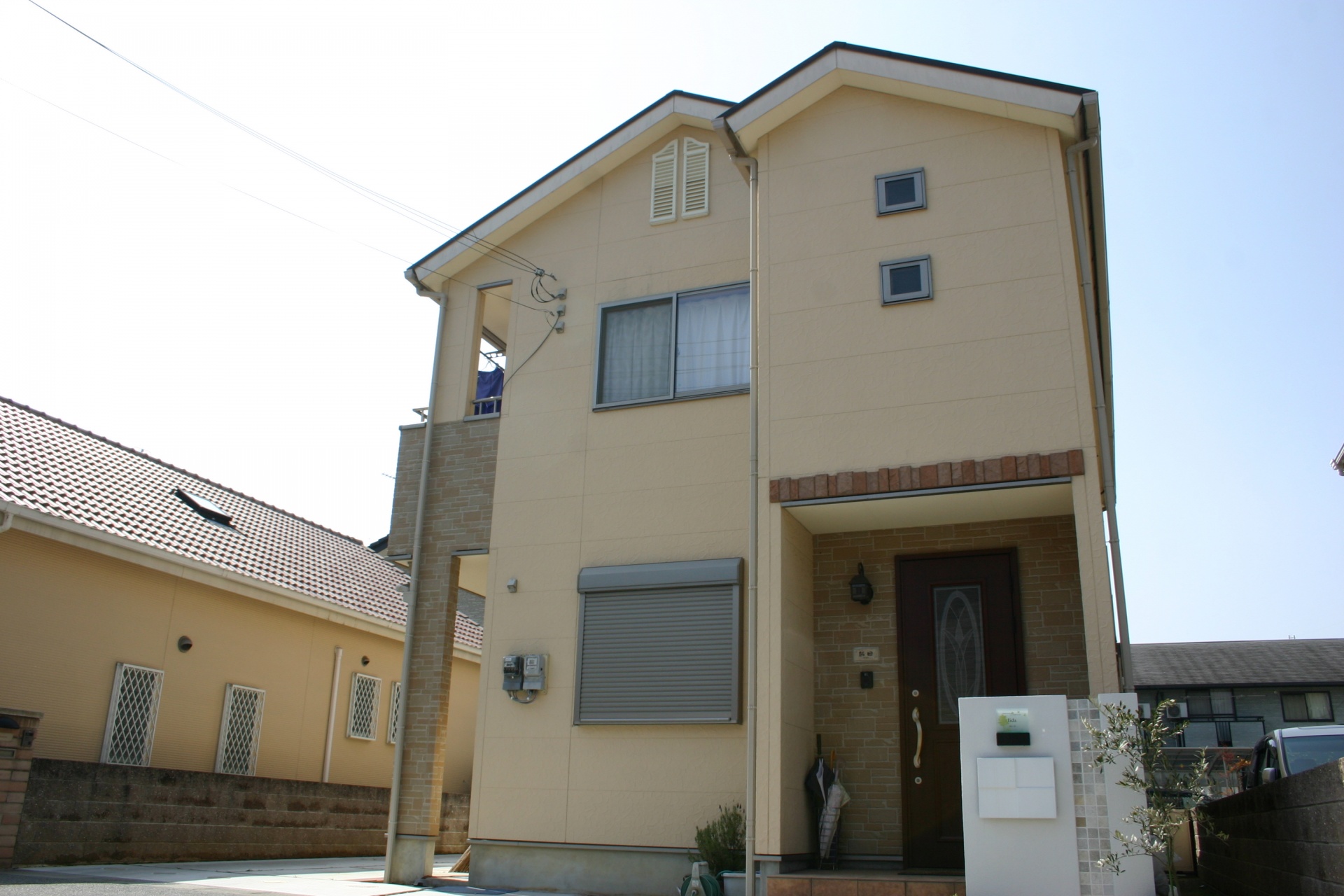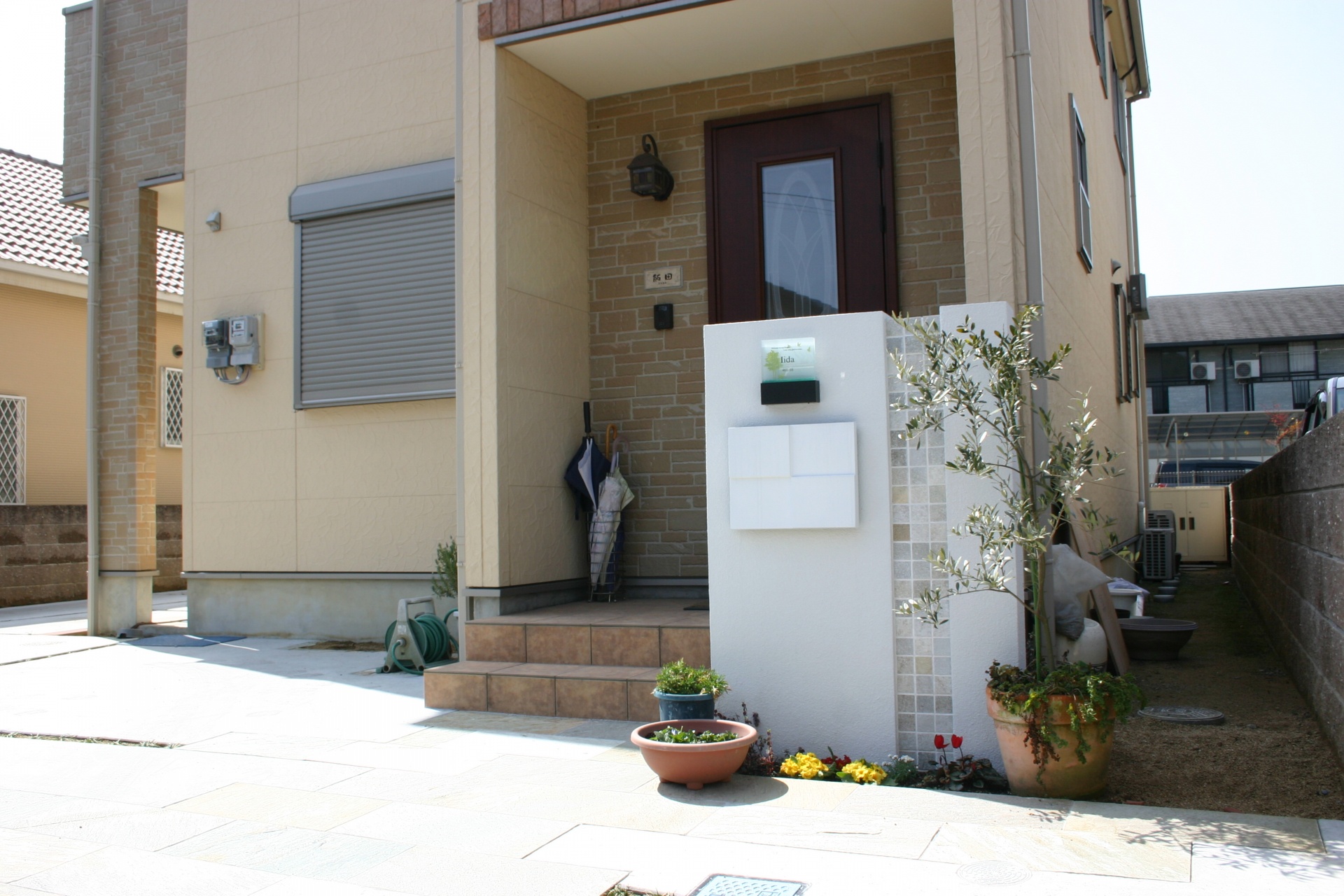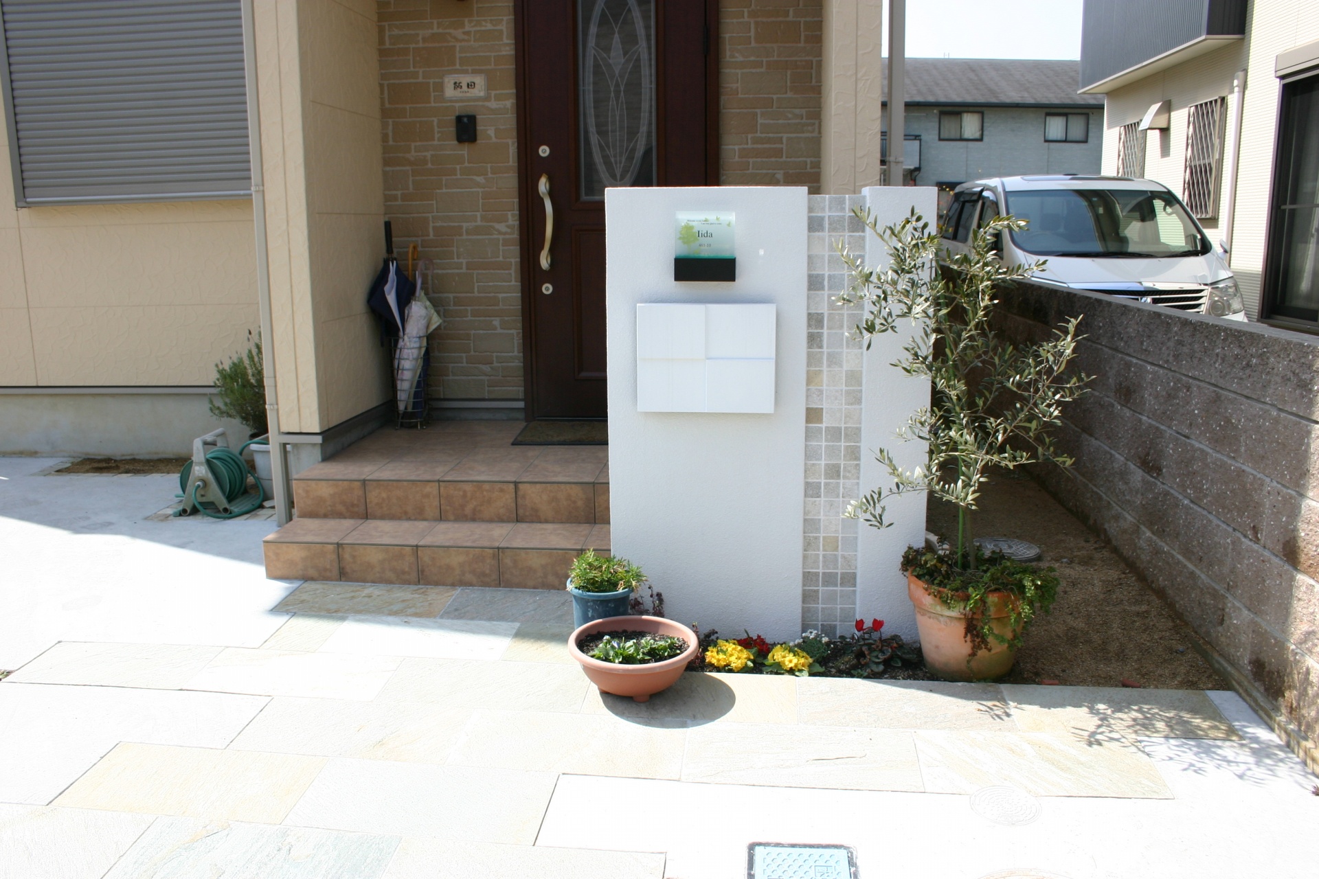 施工実績 太子町新築外構 ホワイトモザイクのシンプルエクステリア門柱 ホワイトのクロスデザインのポストをポイントにして、ホワイト自然石をラインにデザインしました。アプローチにはゴールドの方形タイプをセレクトしスクエアなデザインのエクステリアに仕上がりました。 ソフトイエローの外壁にホワイトのクロスデザインのポストで上品なエクステリアに演出しました。 アプローチは方形の自然石で高級感のあるシンプルデザインに仕上げました。 オリーブの葉がよく似合う門周りエクステリアデザイン。ホワイト自然石がラインのポイントになっています。