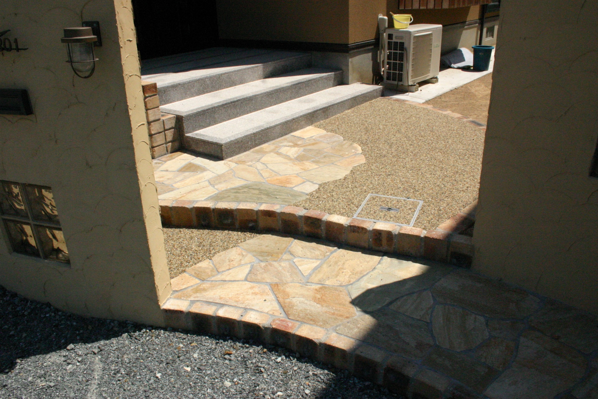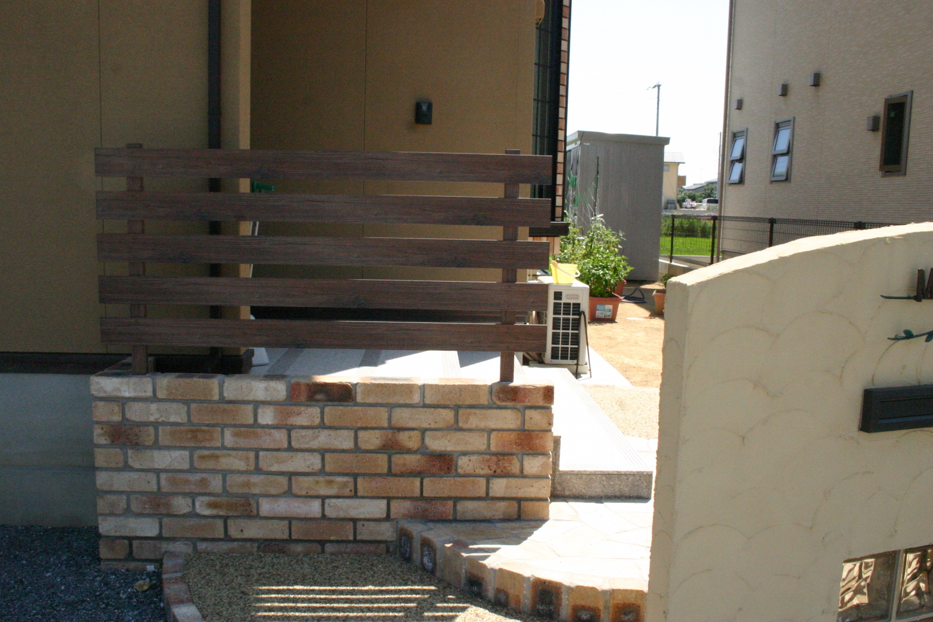 施工実績 たつの市新築外構 門回りデザイン カラーガラス レンガタイルがポイントの建物でアール状の壁を合わせてみました。ポイントは色付のガラスブロックと表札です。 アプローチもアーチ状に、自然石と洗出しで仕上げ。 玄関サイドにはちょっとした目隠しフェンスをタカショーアートウッドにて。
