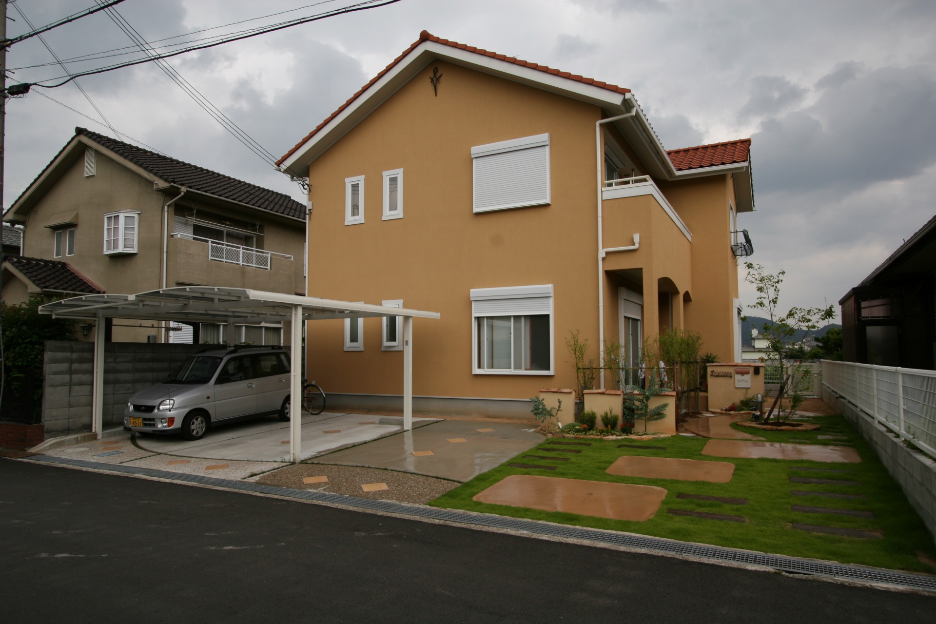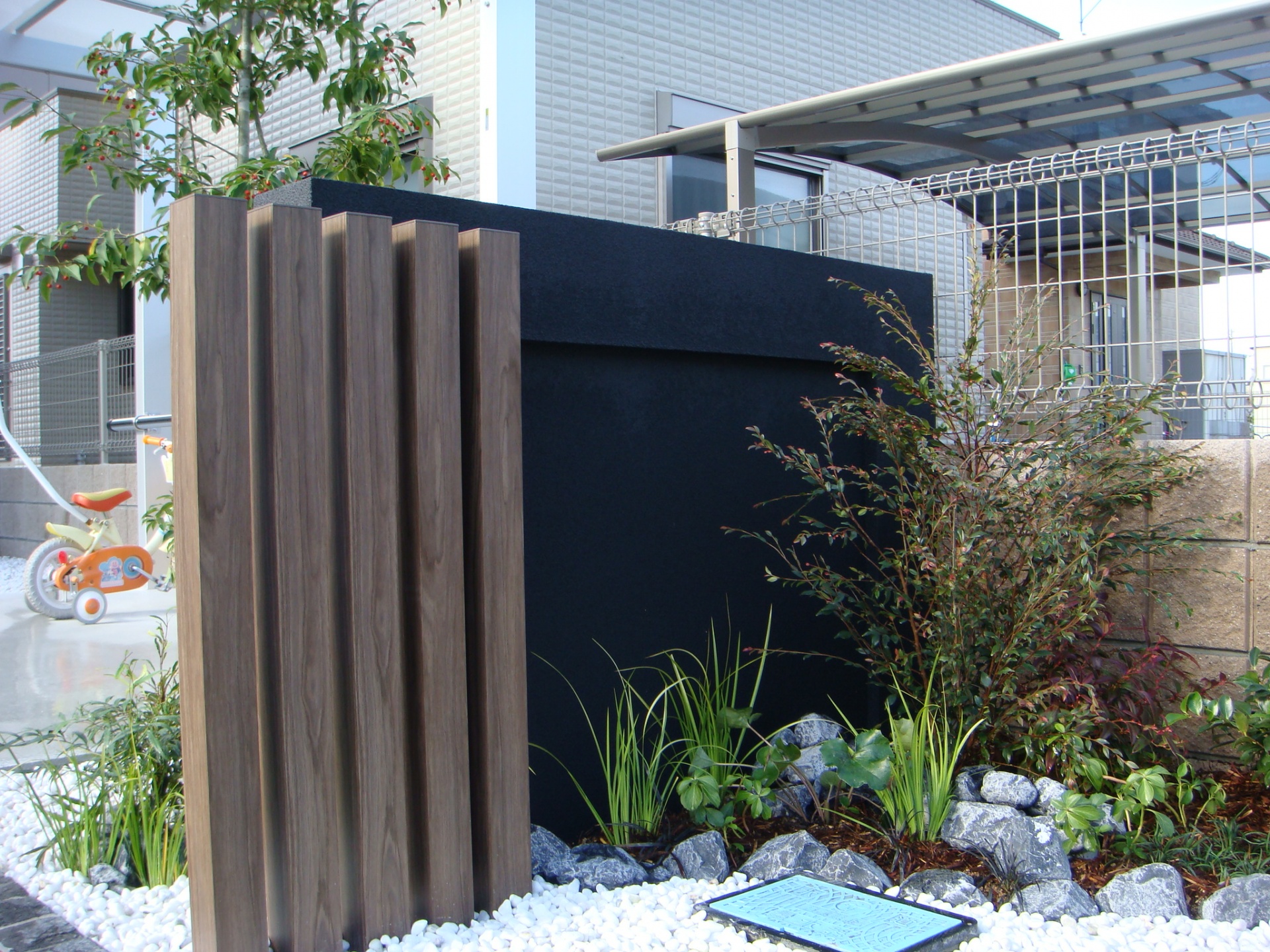 施工実績 たつの市新築外構 メンテナンスフリー クラシカルな木目調門柱 車の導線を考慮して、玄関前に門柱を設けることになりました。 木目調アルミ材を使用して、幅をコンパクトに納めています。 ウッドデッキも人口木材を使用しメンテナンスもフリーなので、ご安心してお使いいただけます。