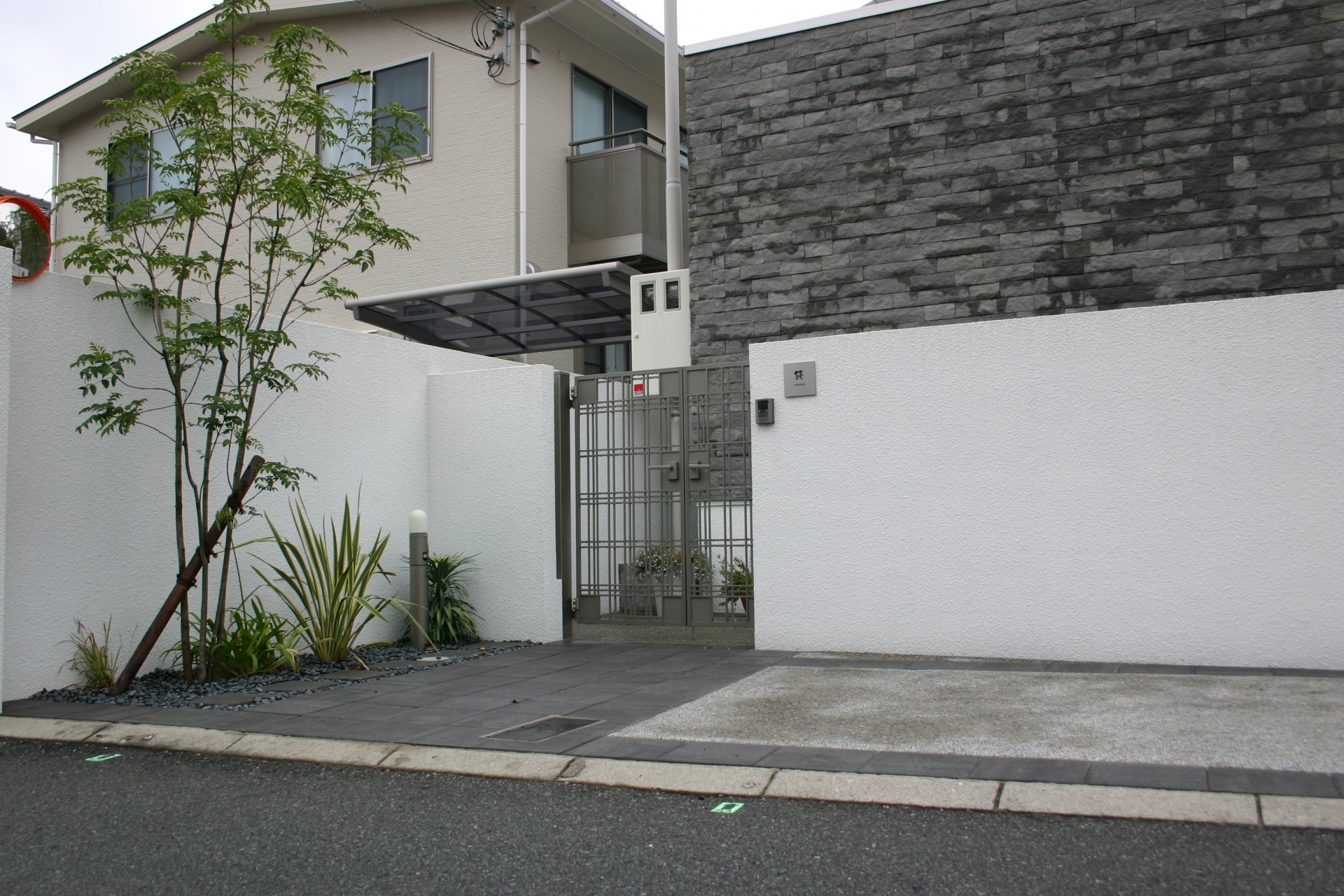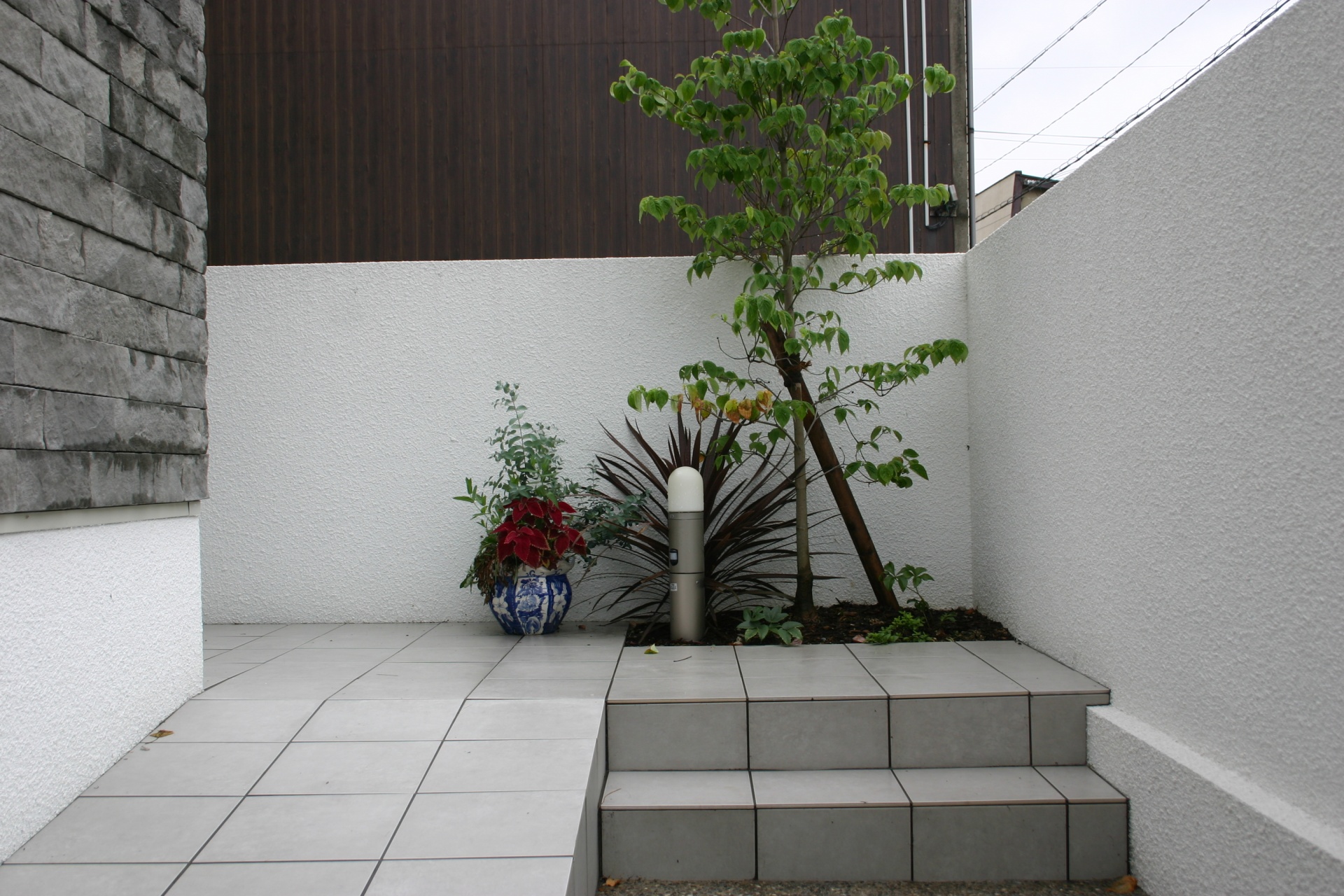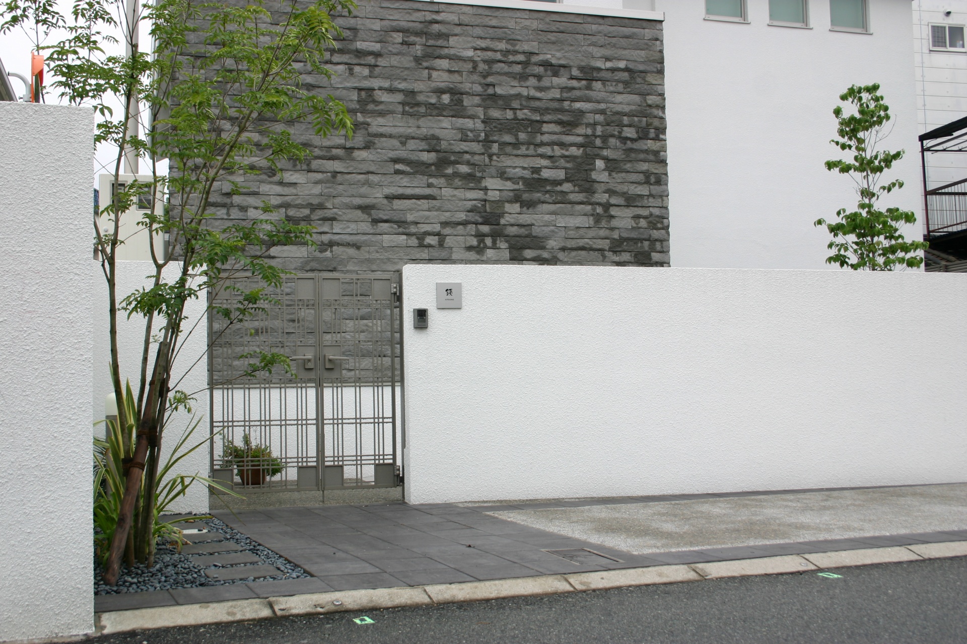 施工実績 姫路市新築外構 コントラストが美しいクローズエクステリア 建物が引き立つ様に、シンプルな白壁で仕切り 建物の石張りの意匠壁が良く映えます。 植栽もにぎやかではなく、質の良いものを数少なく植え込んでいます。 高木も適度に配置され、高さのバランスも綺麗です。 建物石張り意匠壁が良く映えます 黒の平板敷きアプローチ 中庭タイルテラスから見える植栽スペースも上品に仕上げています ドライなイメージでオリーブをメインツリーに 角のデッドスペースにはハナミズキを植えています
