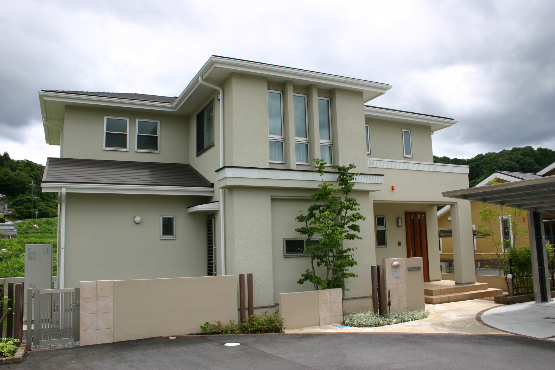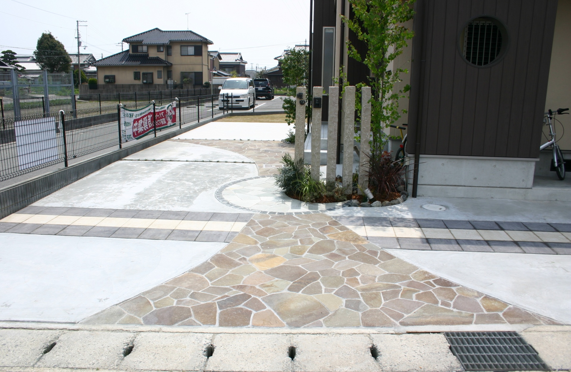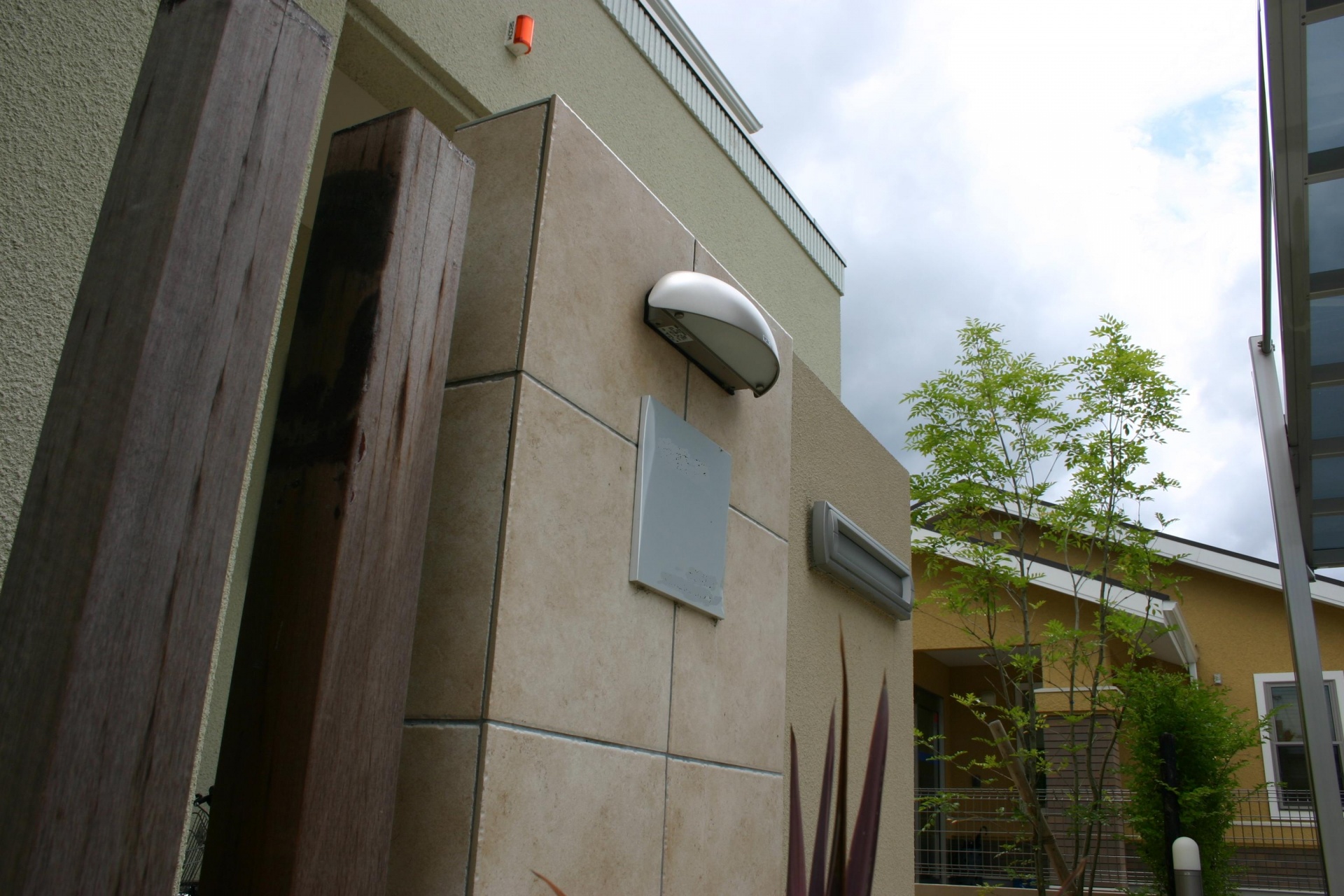 施工実績 加西市新築外構 自然石のアーチデザインエクステリア 加西市のトータルデザインエクステリア施工例。四国化成の2本脚のカーポートで、アプローチ周りをスマートにデザインしました。アーチ状の自然石アプローチがワンランク上のエクステリアに演出してくれます。 センターに紅花のヤマボウシを植樹。木製ウリンフェンスとタイルデザイン門柱とのバランスがトータルエクステリアを演出してくれます。 ブラケット表札灯に厚みのあるアルミ削り出しサインをセレクト。上品な大人のエクステリアに仕上がりました。 トータルエクステリアデザイン 全景。