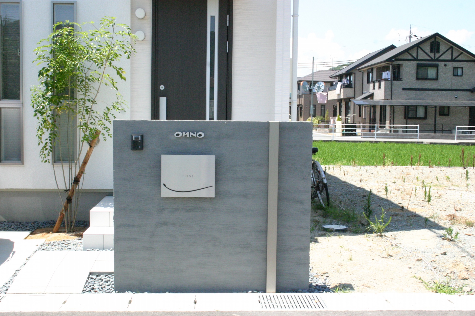 太子町新築外構 黒の塗り壁にアクセント スタイリッシュ門柱